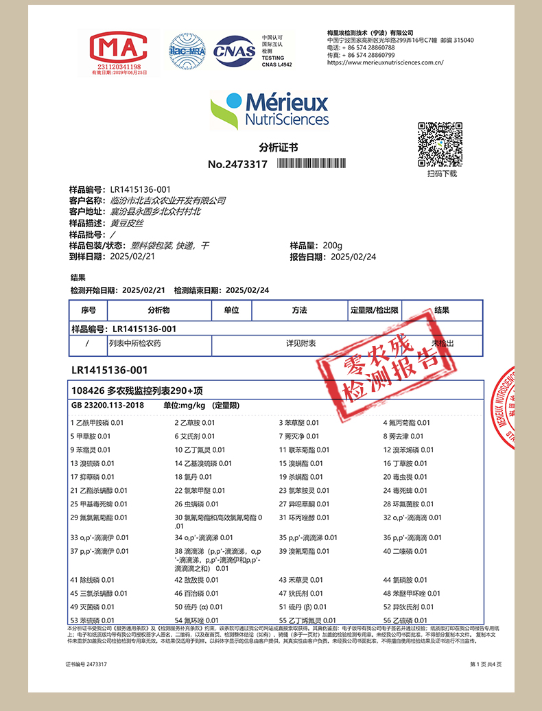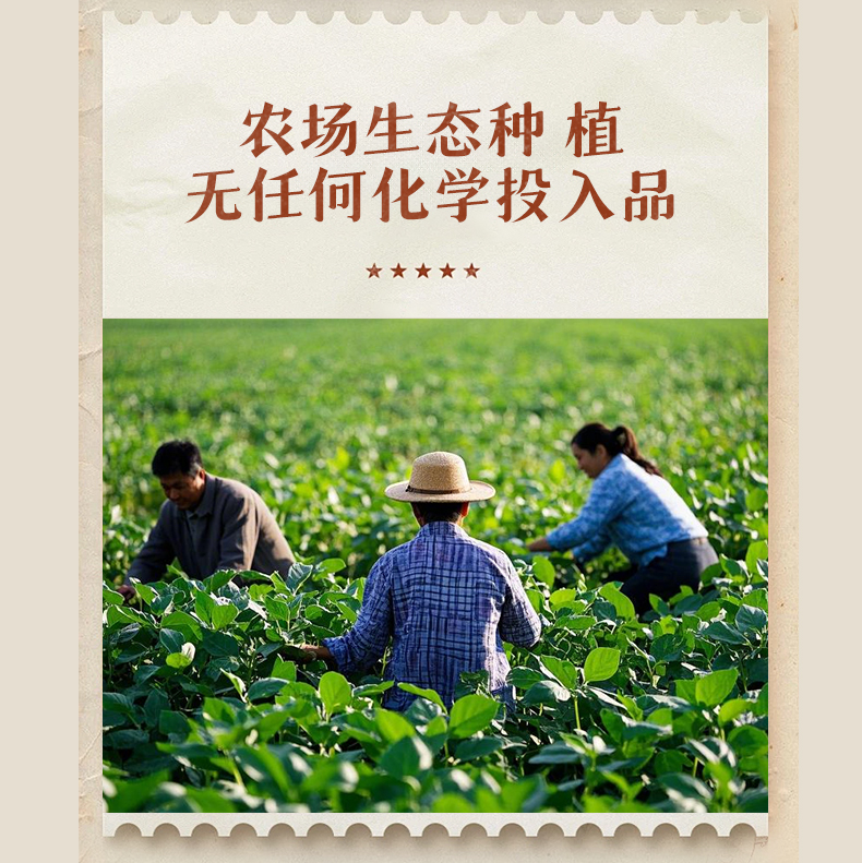 【安全标准】生态种植,种植全程不使用任何化学投入品,包括化肥、农药、除草剂,以及人工合成激素类物质;使用发酵腐熟的羊粪堆肥辅以自制环保酵素;园区周边种植25米宽的香椿树隔离带,营建良好的有自洽能力的生态小环境,病虫都有但皆不成害;人工控草,地下深井水灌溉,黄豆自然成熟收割,物理方式加工,不使用任何添加成分。