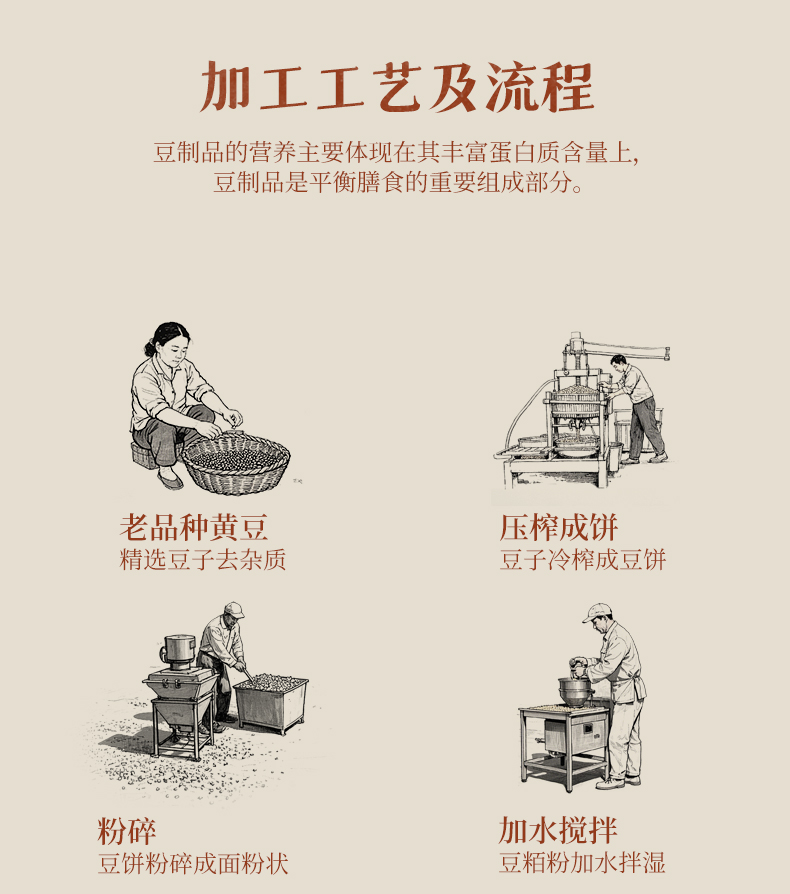 【精选黄豆压榨取油,再将豆饼粉碎,加水拌湿,进入机器熟化并挤压成豆皮,再进切丝机切成豆皮丝,最后烘干成品包装。】