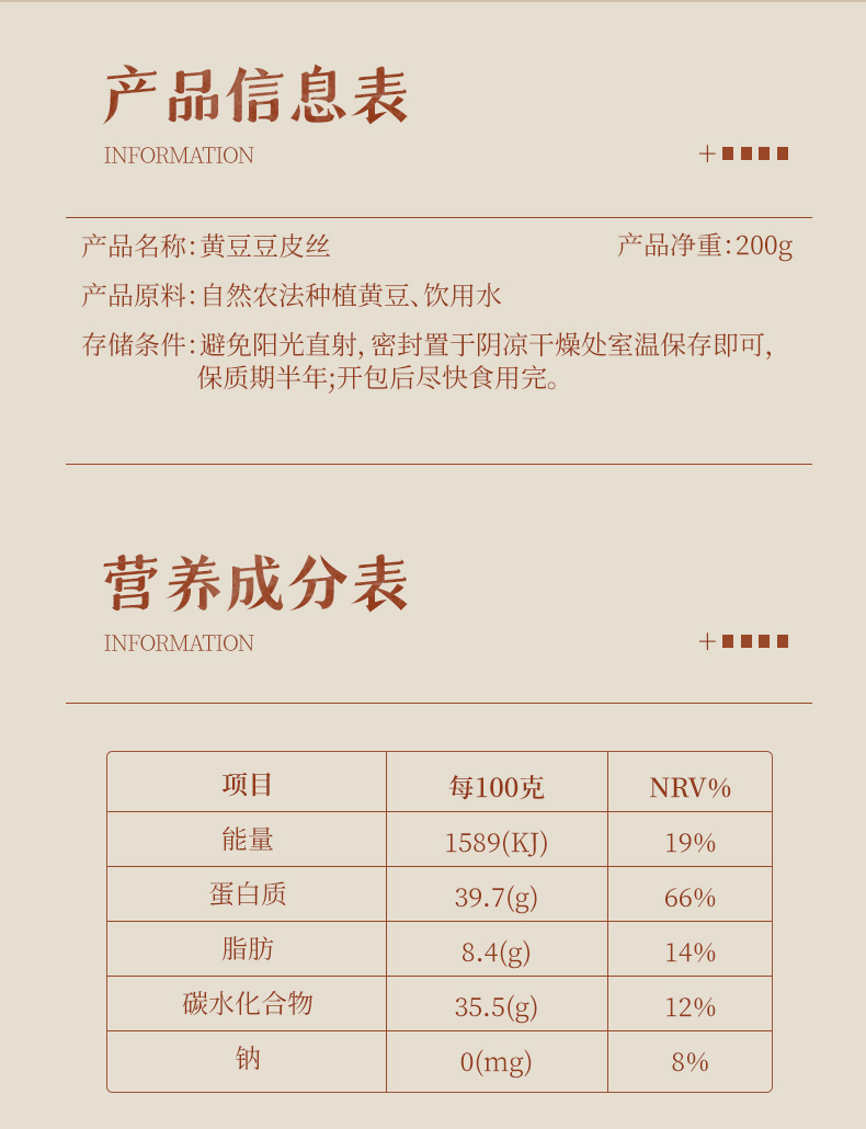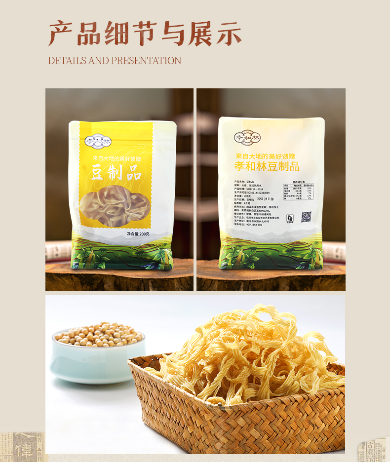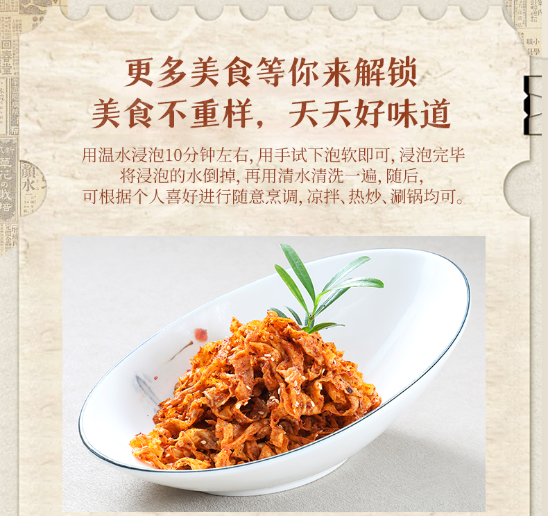 【食用方法】均为为熟干制品,食用前无需水煮;取适量,豆皮丝用温水浸泡5分钟,捞出后沥干明水,搭配其它食材,全凭个人喜好;可荤可素;可凉吃,加入调味品,根据自己口味调整,拌匀后即可开始美美地享用;也可热吃,入菜入汤入火锅,百无禁忌。