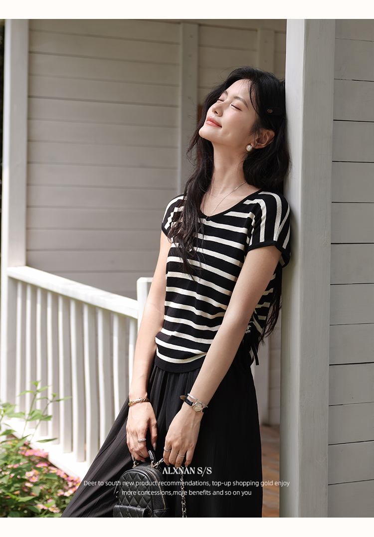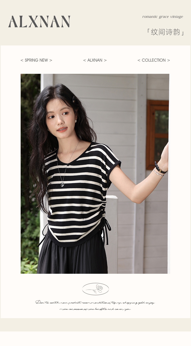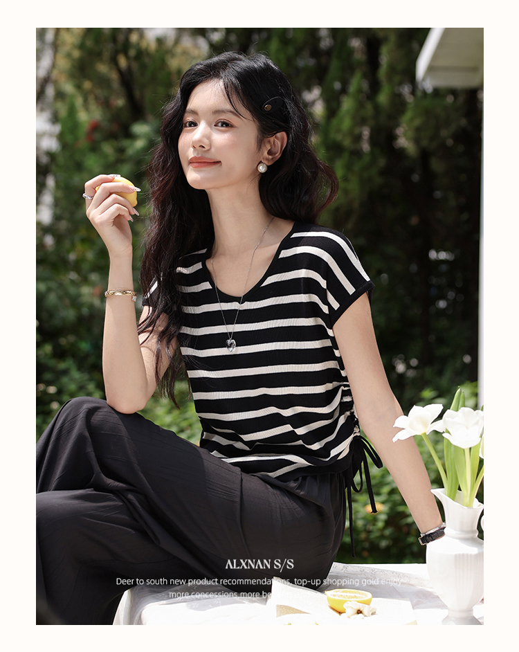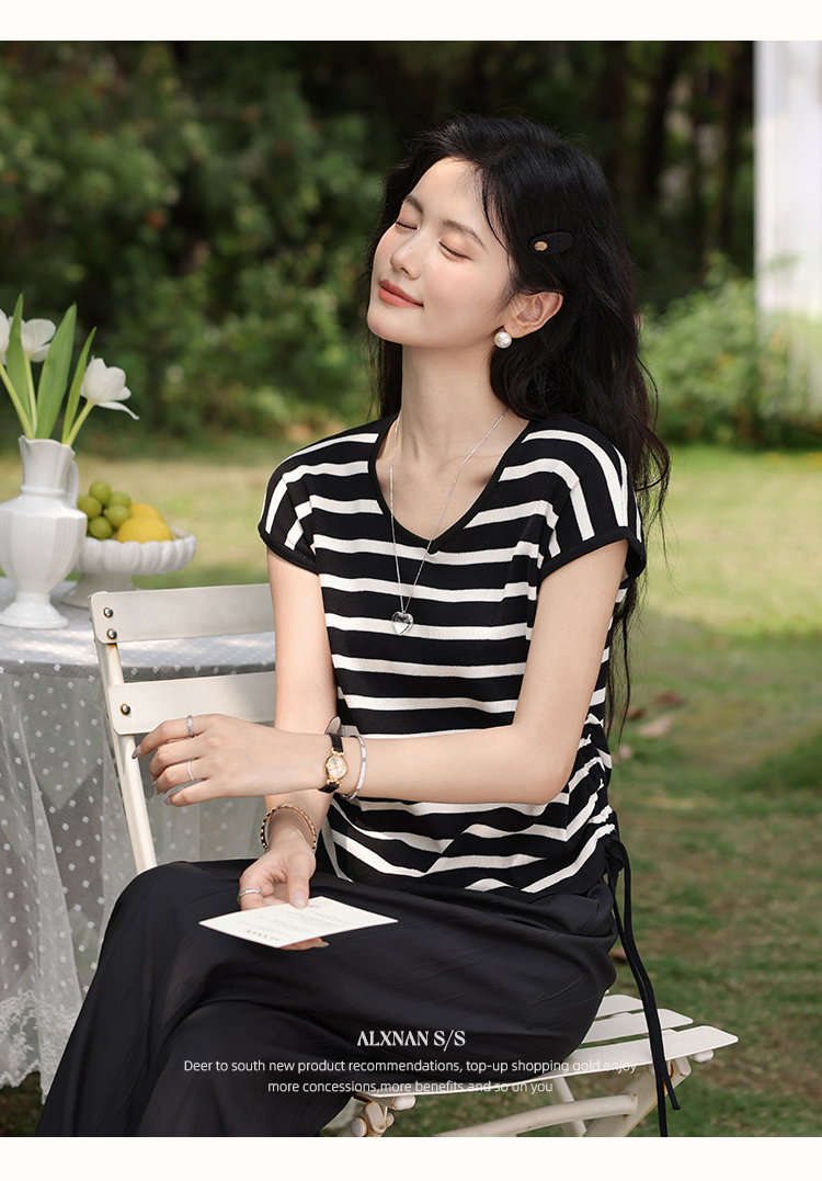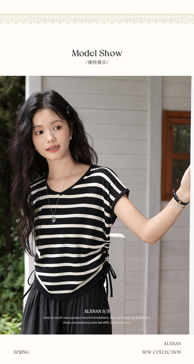 【65折秒杀】鹿向南 「纹间诗韵」小众条纹女短袖针织衫t恤夏季新款不规则上衣L551100
