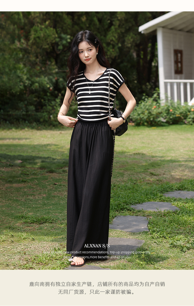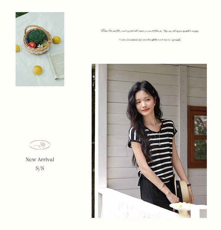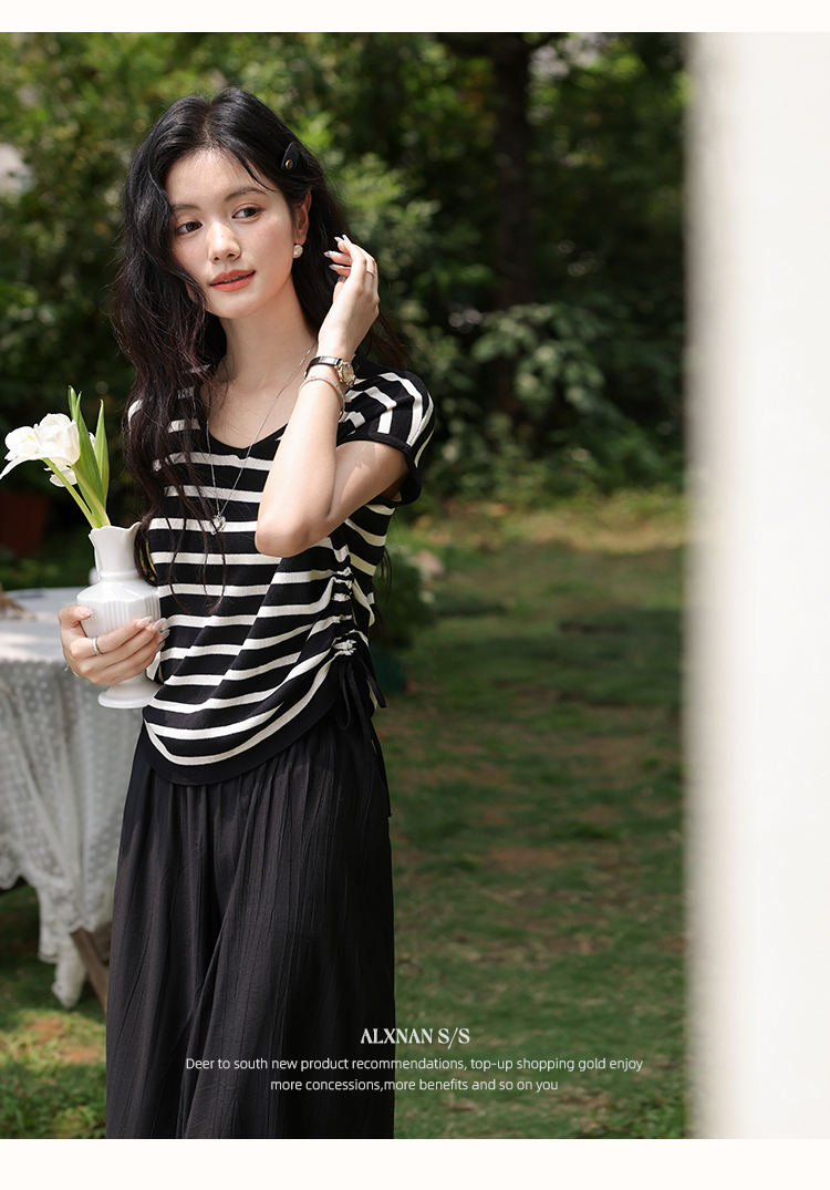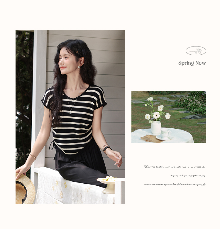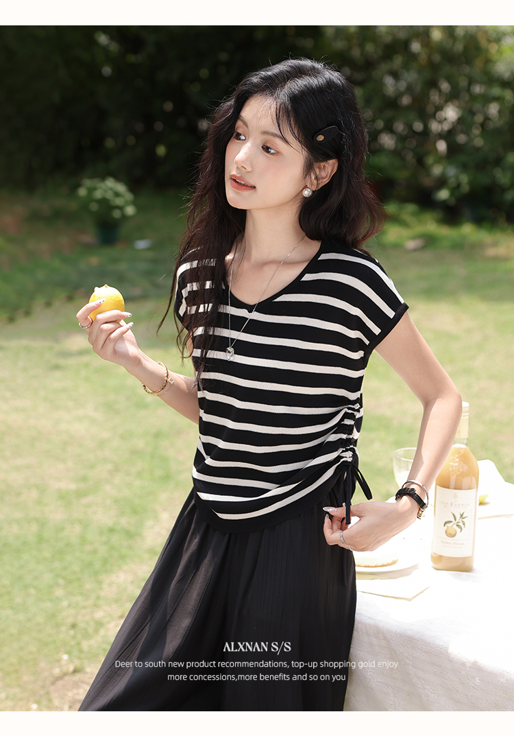 【65折秒杀】鹿向南 「纹间诗韵」小众条纹女短袖针织衫t恤夏季新款不规则上衣L551100