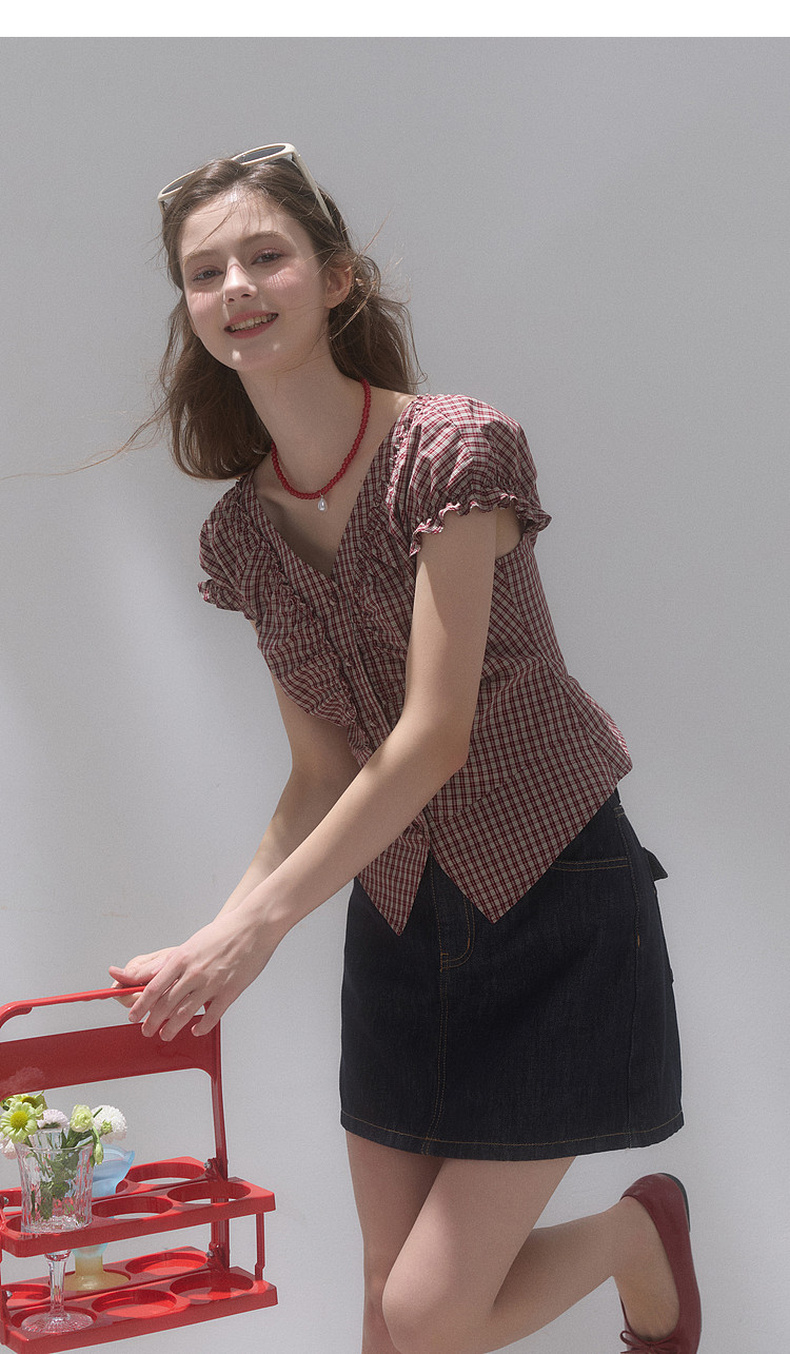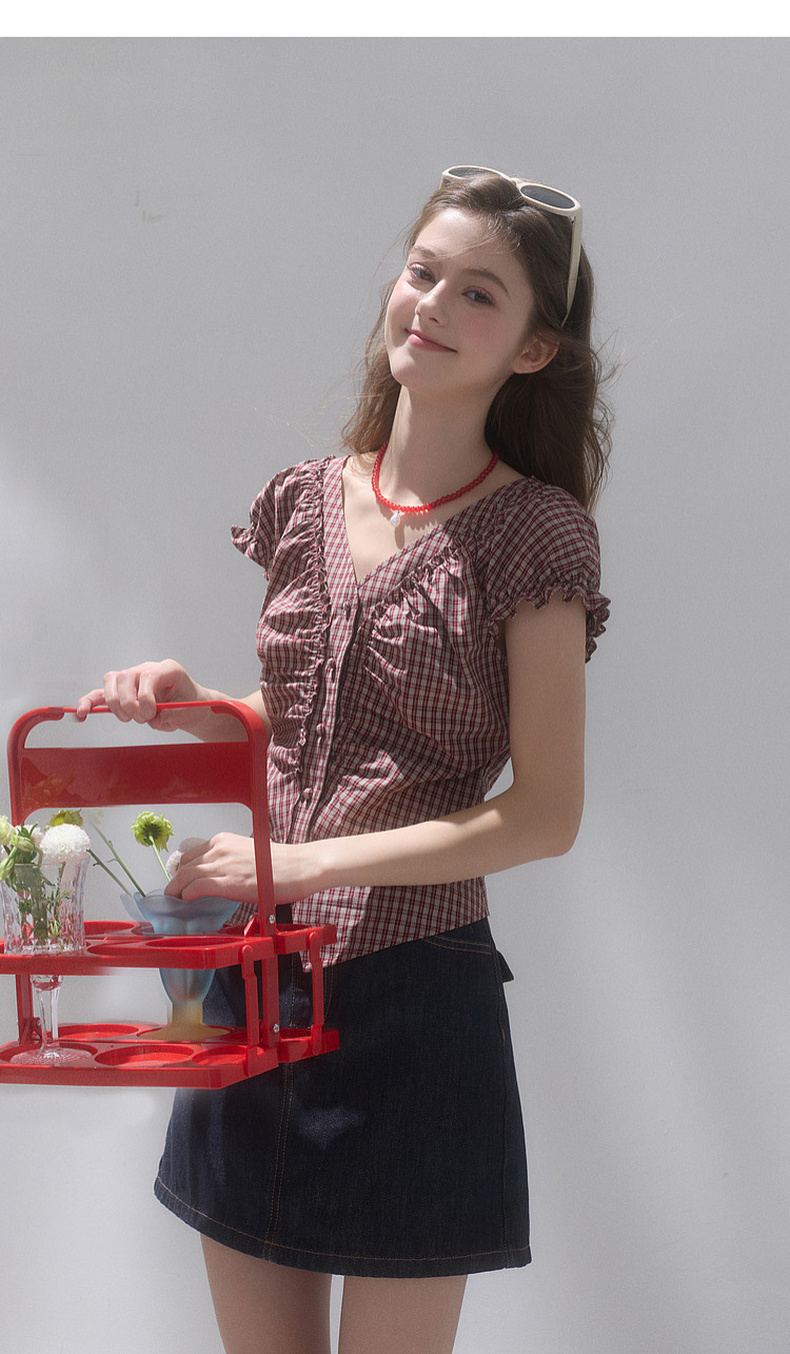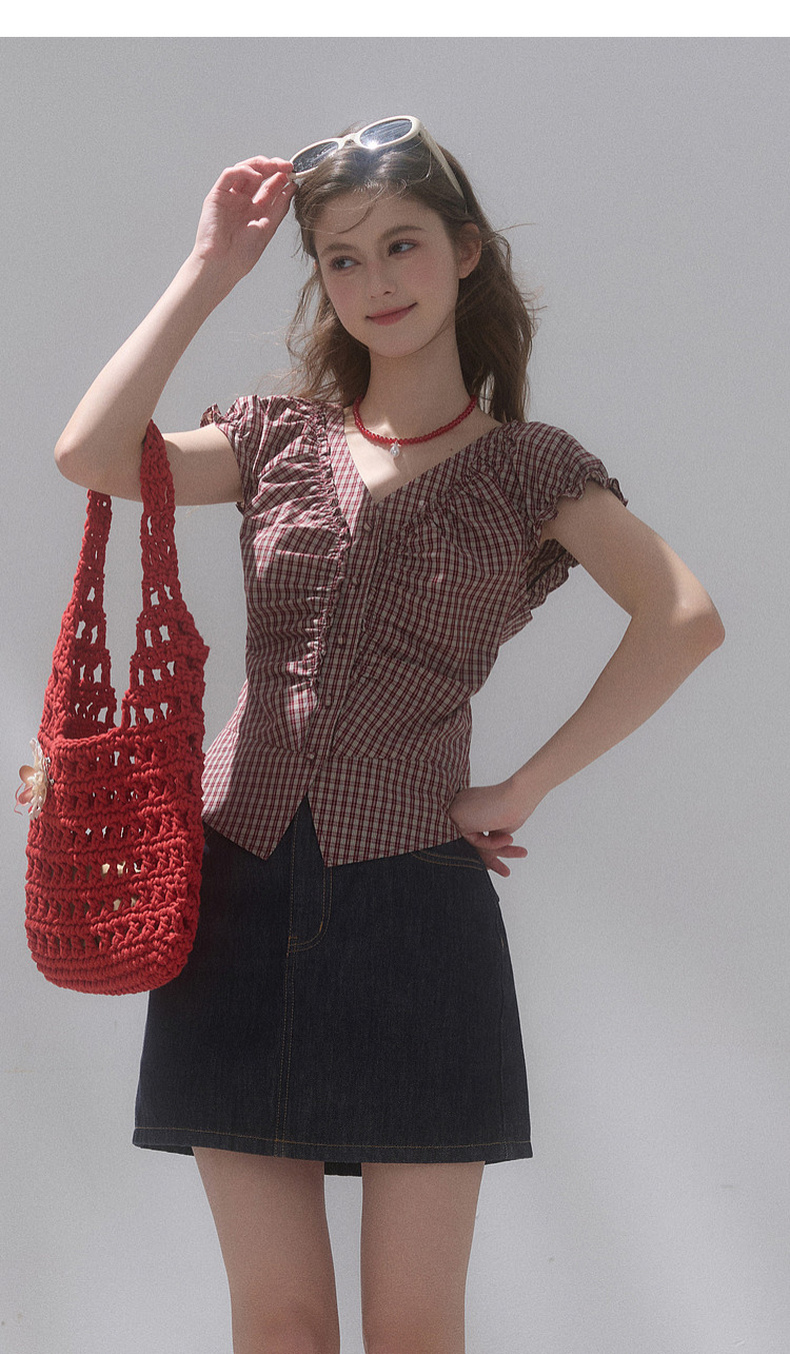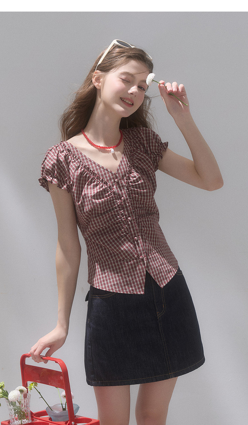 【100棉】三彩独醒2026夏季新款格纹小衫V领短袖上衣短款F