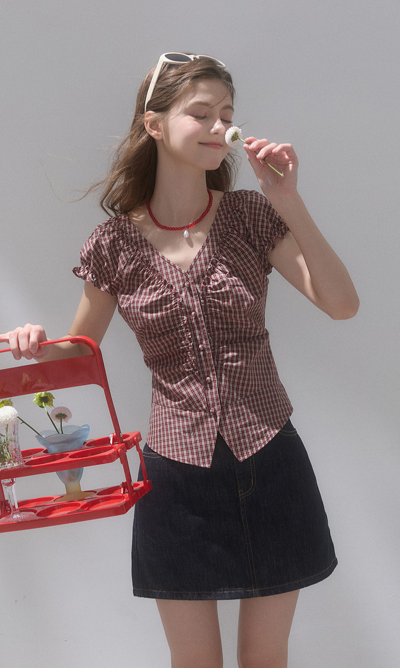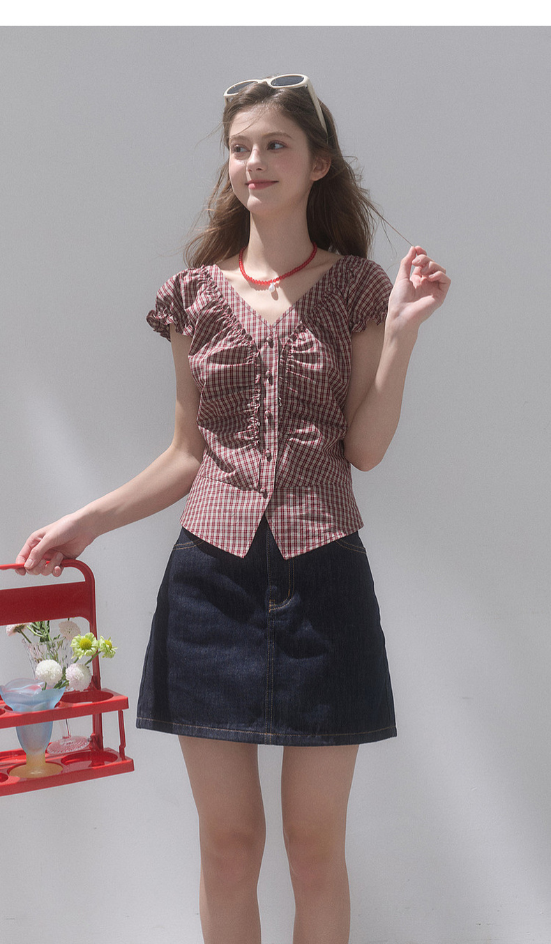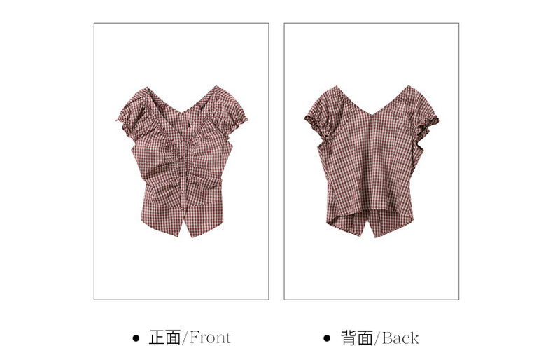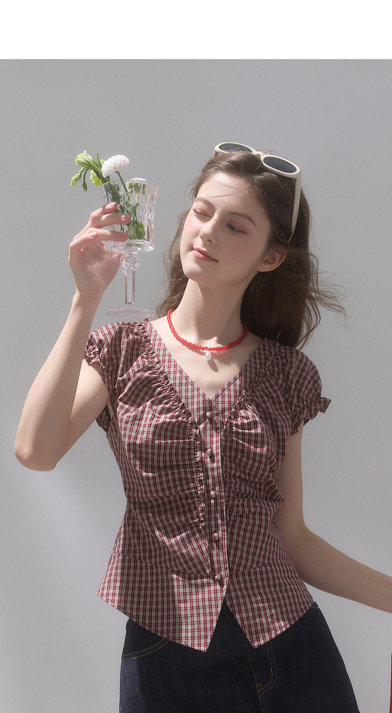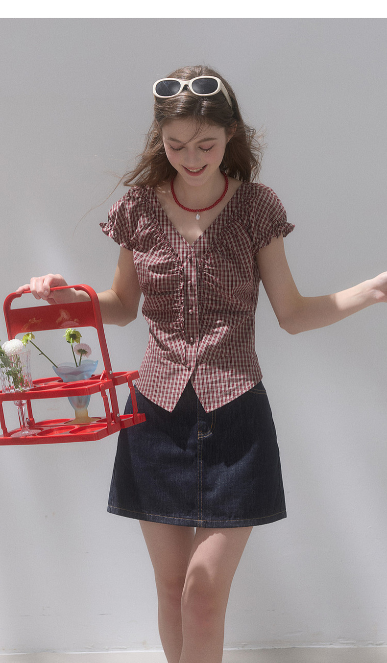 【100棉】三彩独醒2026夏季新款格纹小衫V领短袖上衣短款F