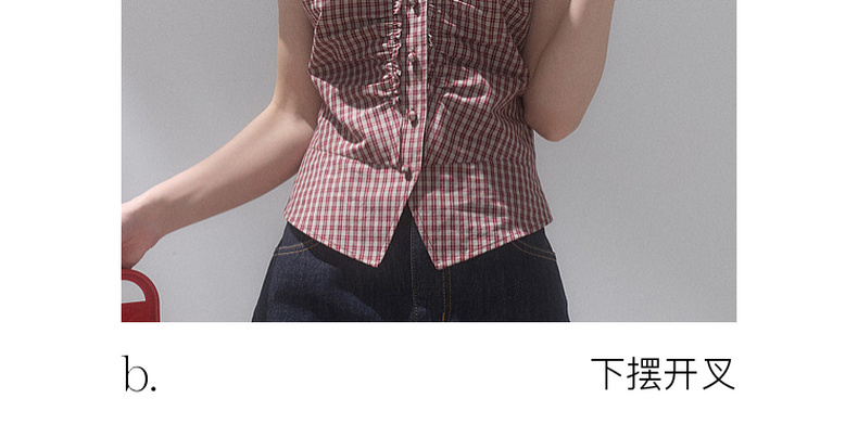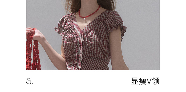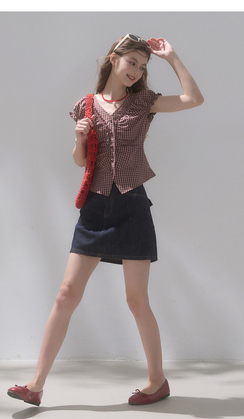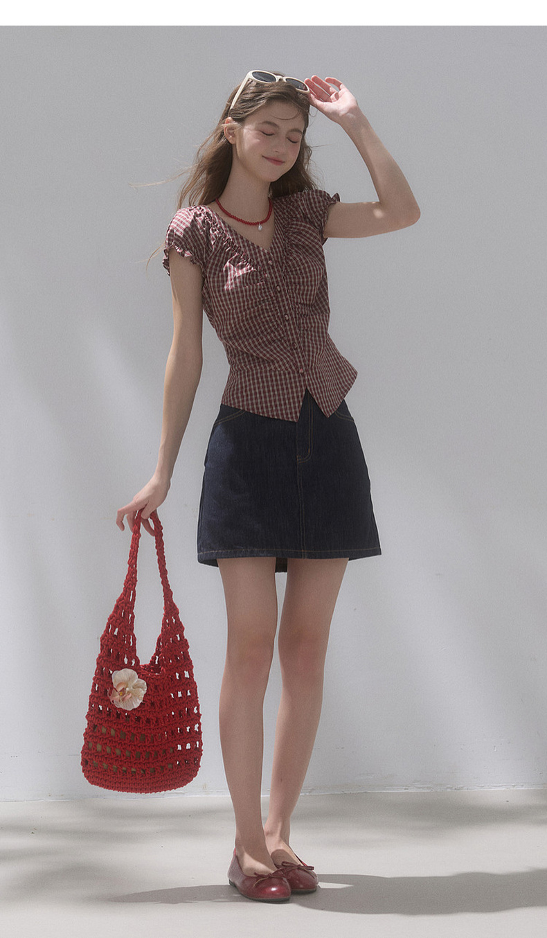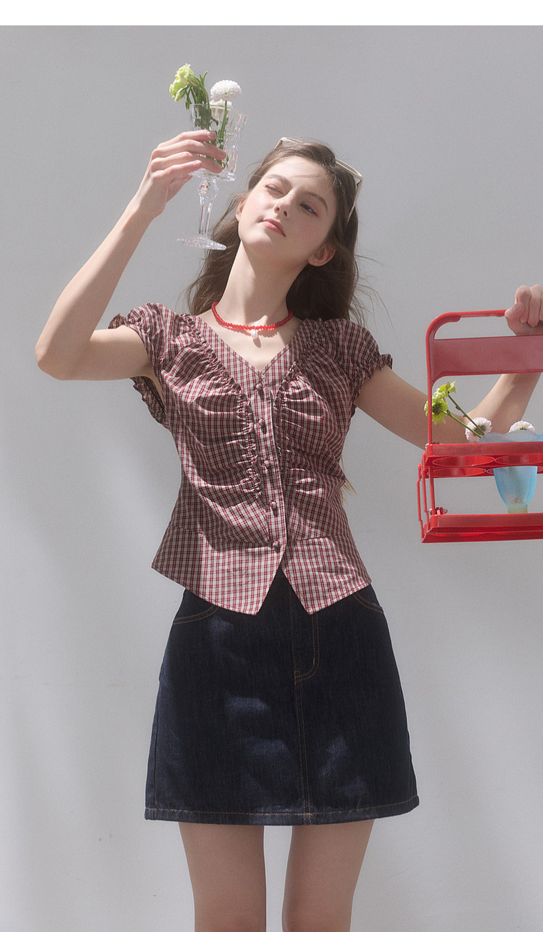 【100棉】三彩独醒2026夏季新款格纹小衫V领短袖上衣短款F