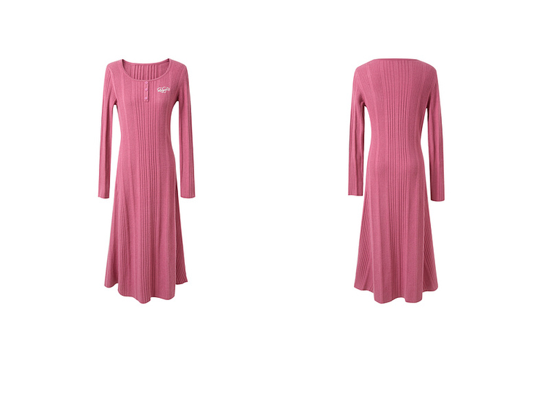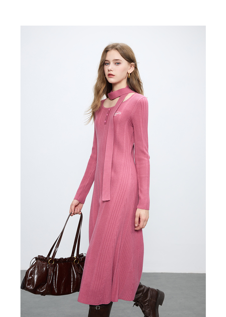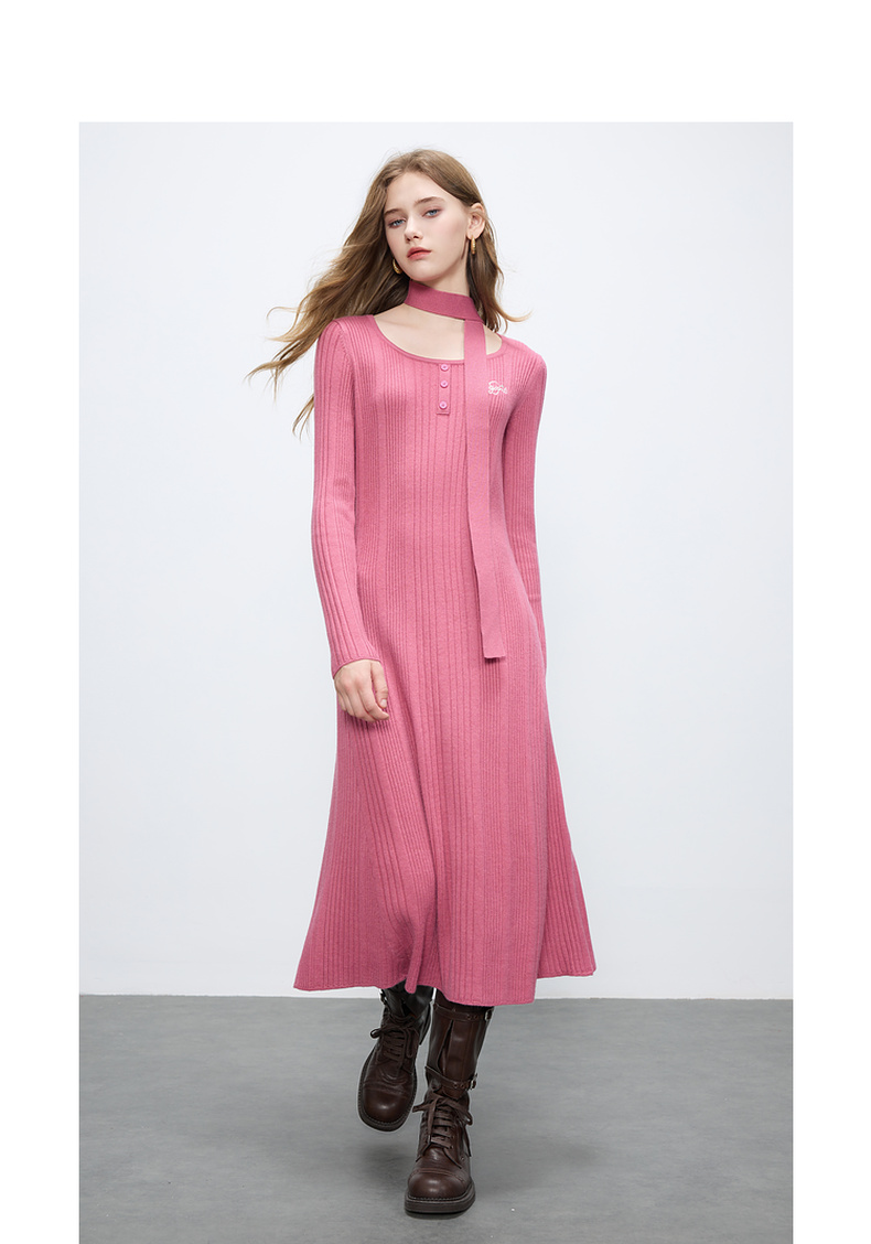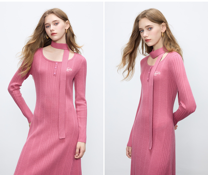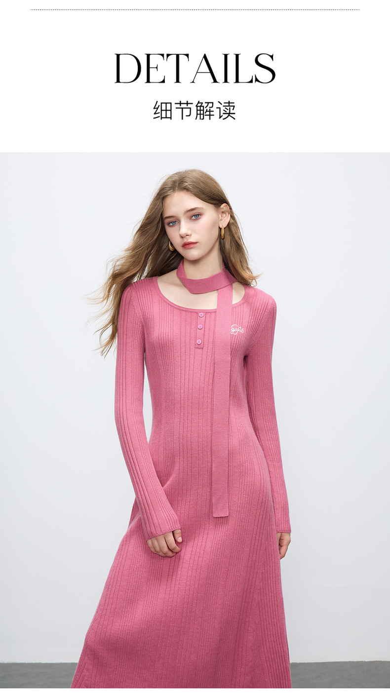 三彩2024冬季新款绣花针织连衣裙坑条毛衫裙子A字长裙打底女M