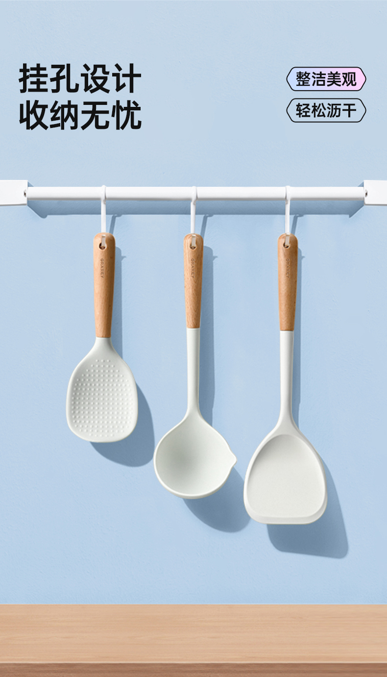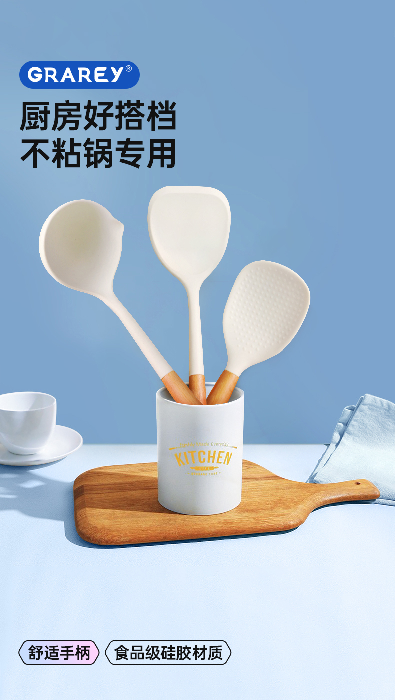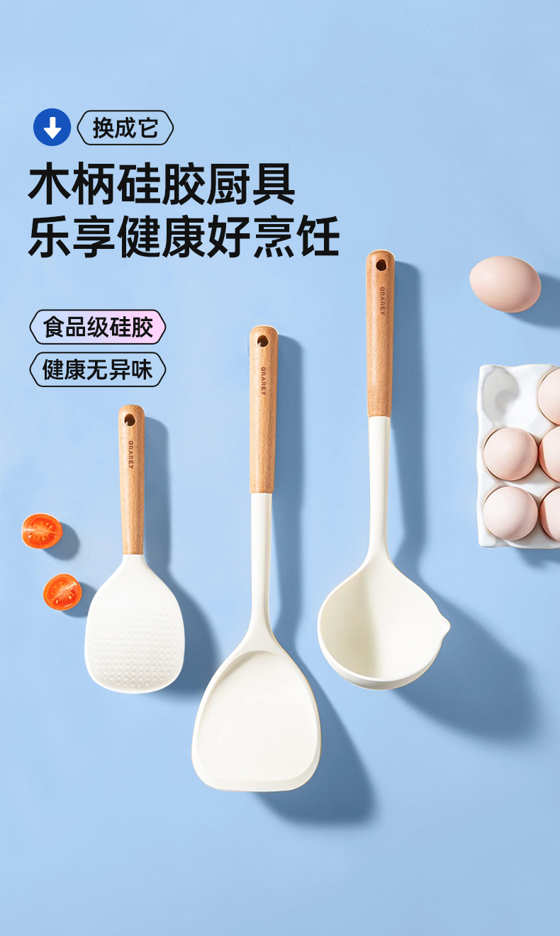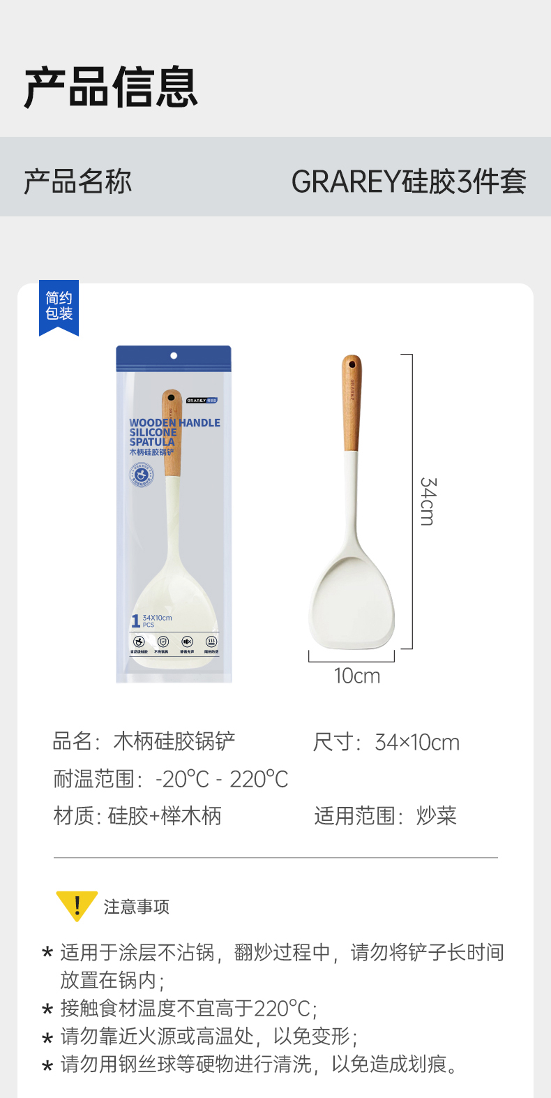 Grarey 格瑞亚 硅胶三件套 饭勺锅铲汤勺 榉木手柄 食品级可接触材质