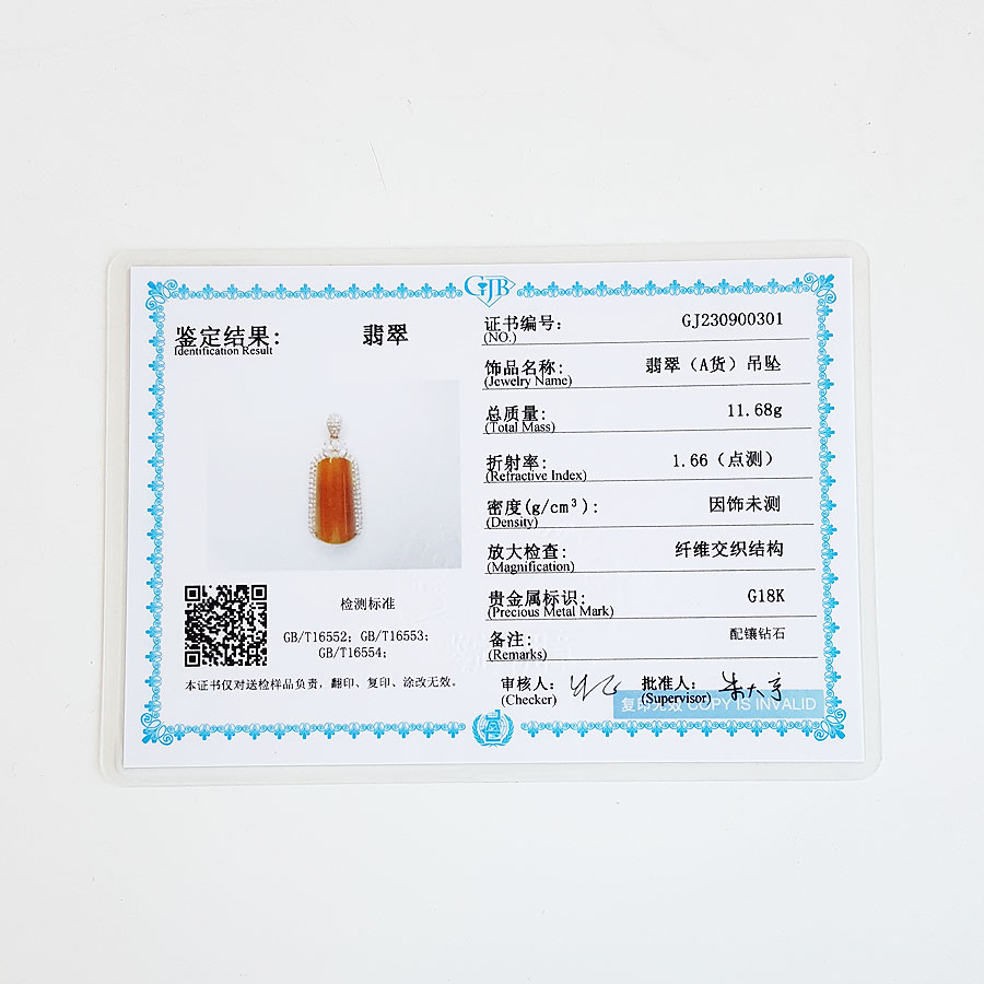 【天然正品】A货翡翠AU750收藏级玫瑰金豪镶钻镶天然糯种平安无事牌黄翡吊坠项链41.7*17.4*12.4MM(皆取最大值)女士现售价:18800!120325XY15