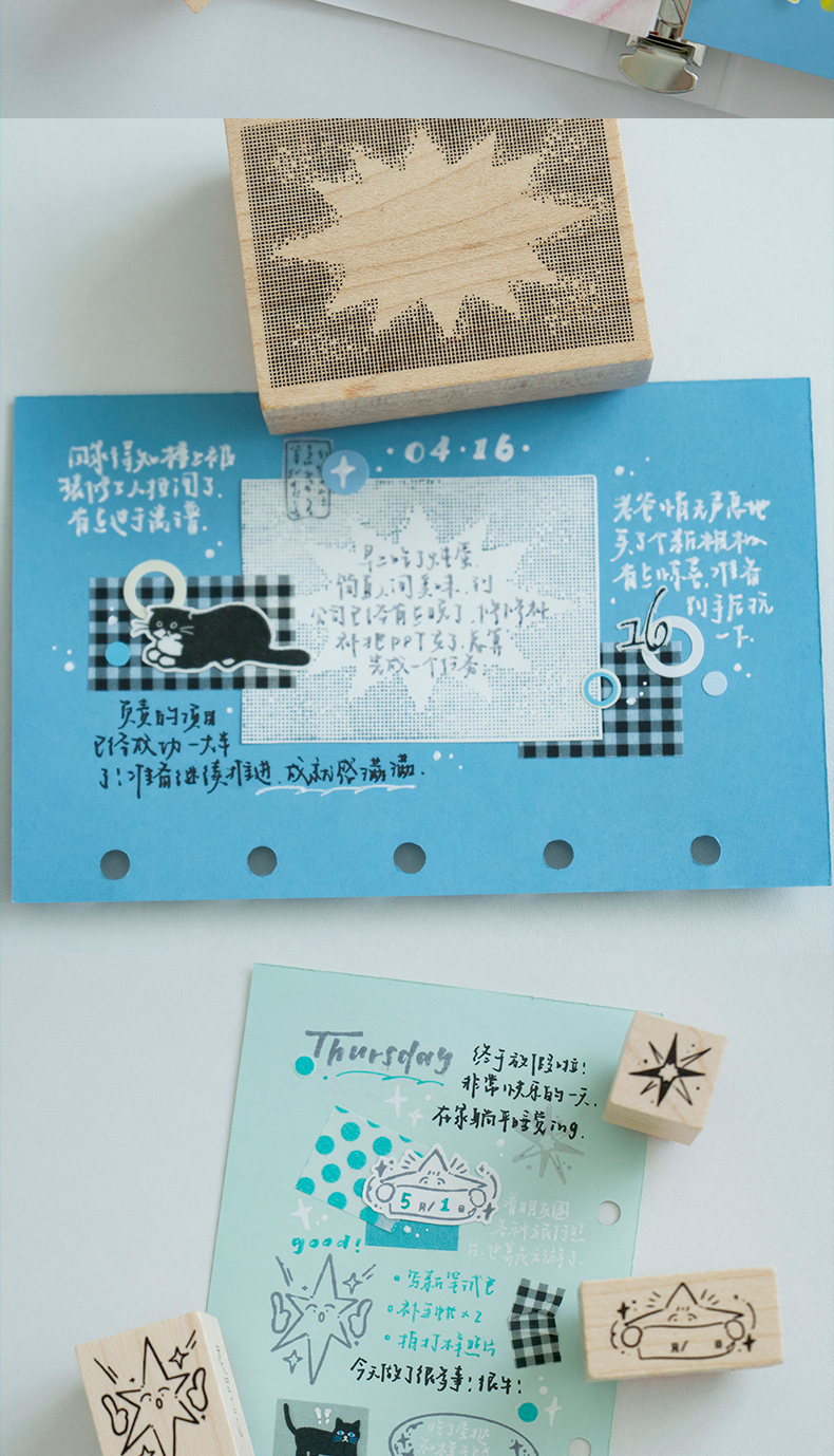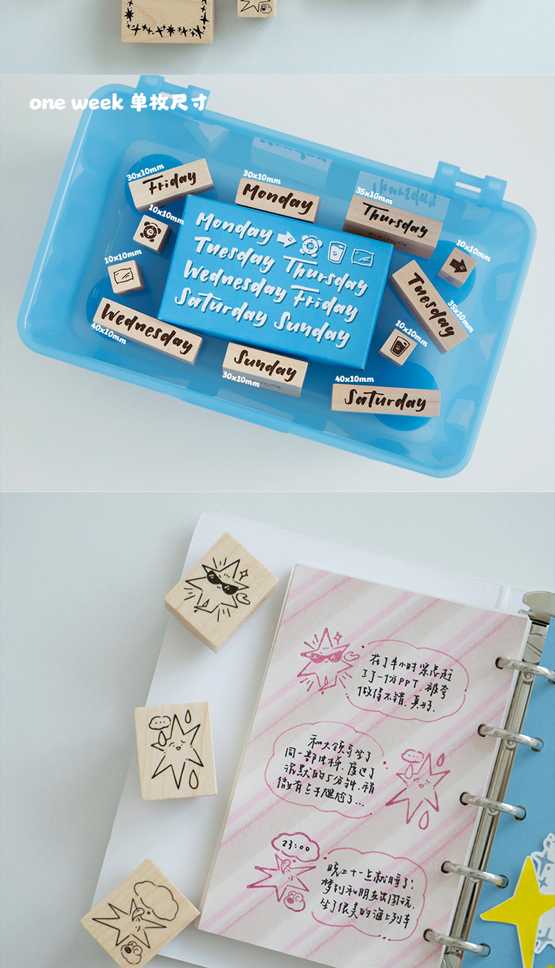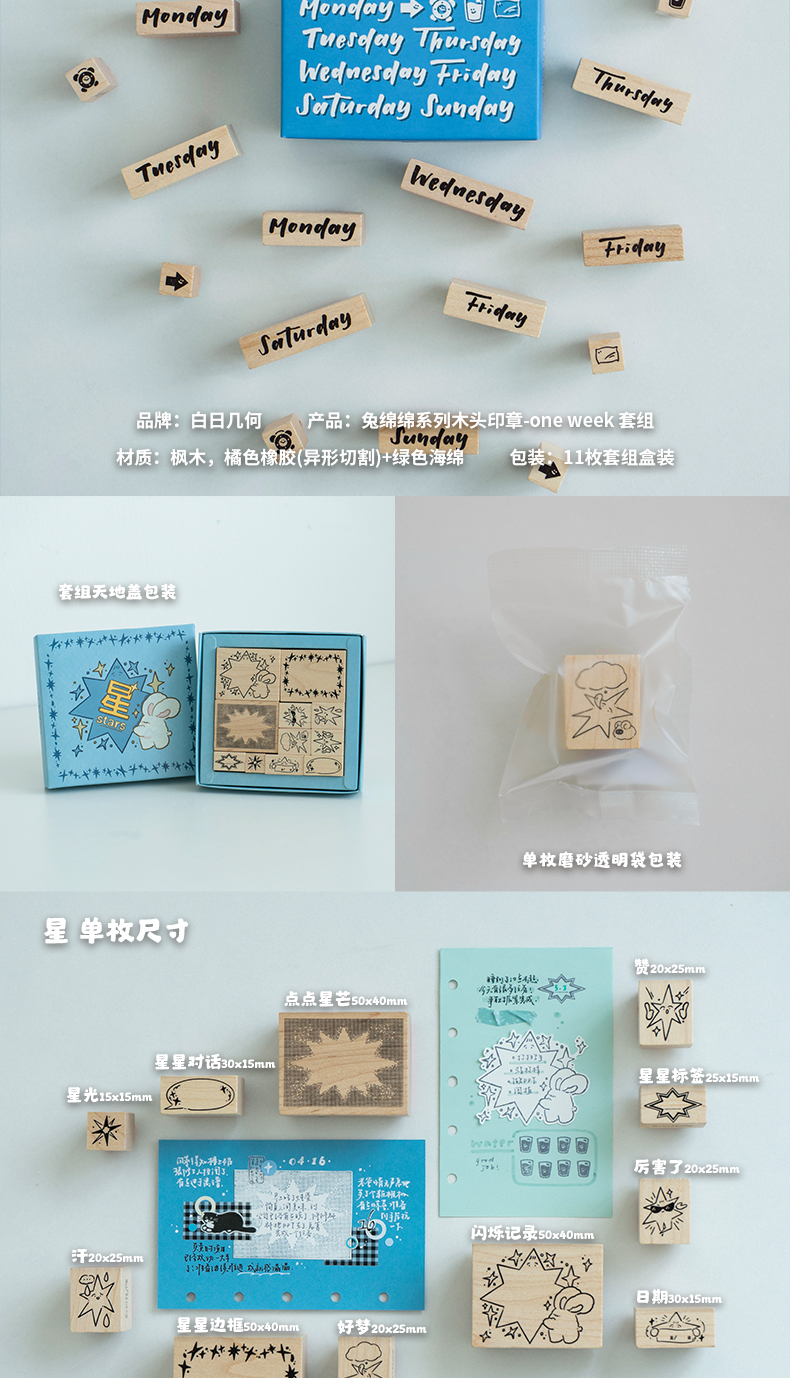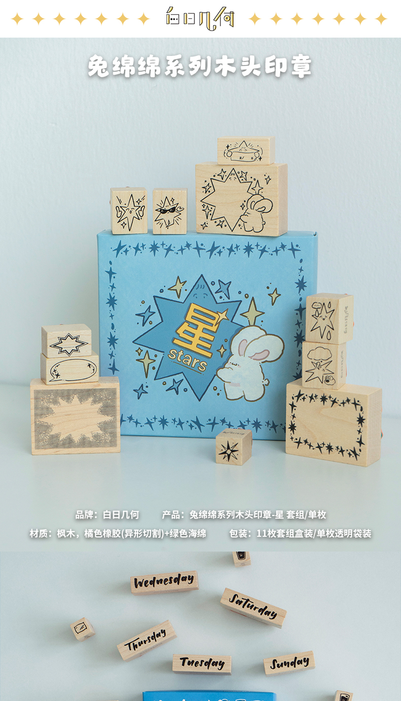白日几何 兔绵绵系列木头印章 星星 星期 单枚 套盒 生活记录 手帐可爱印章