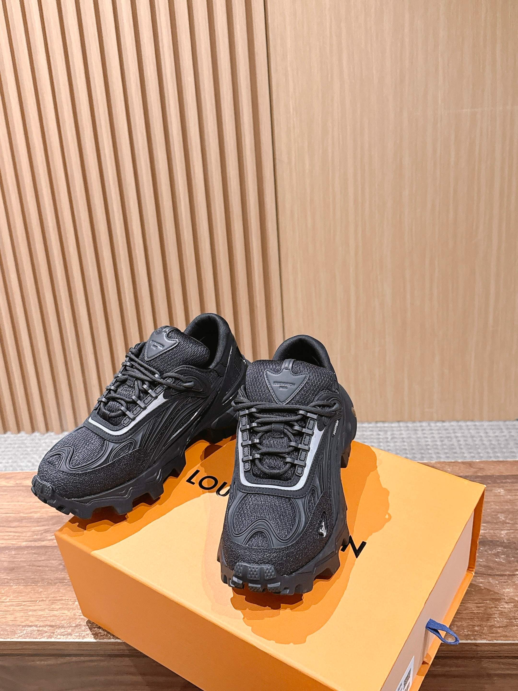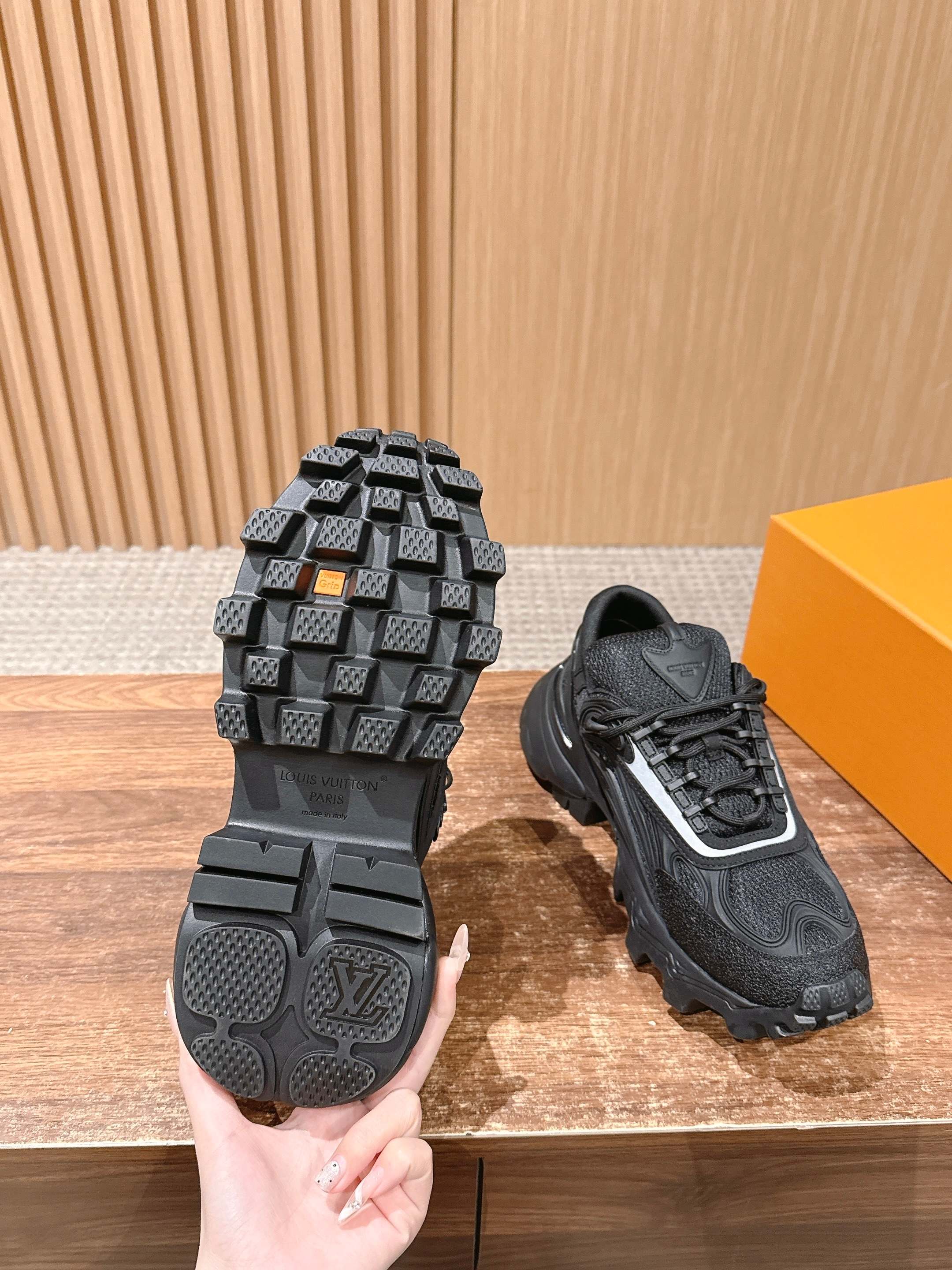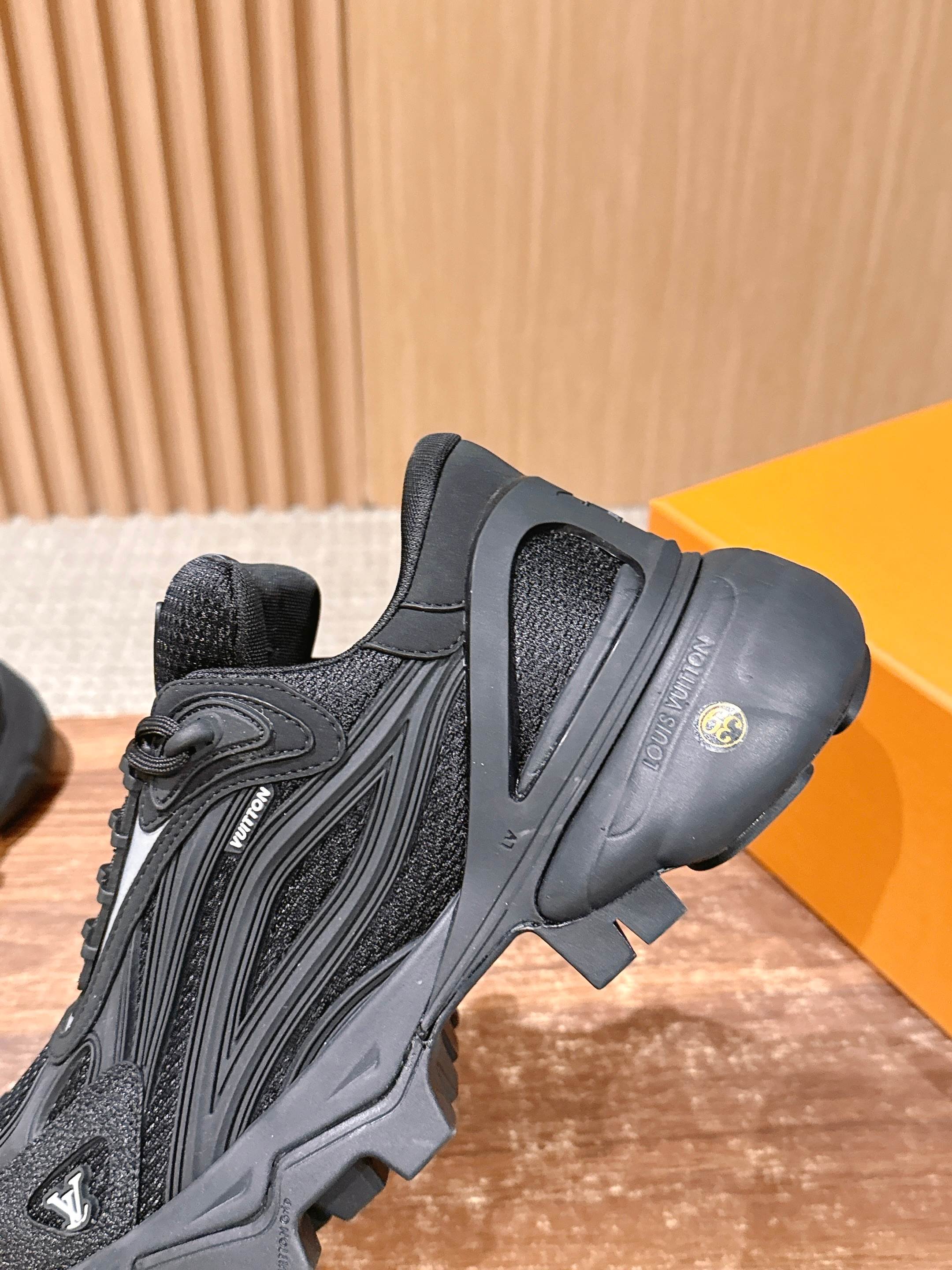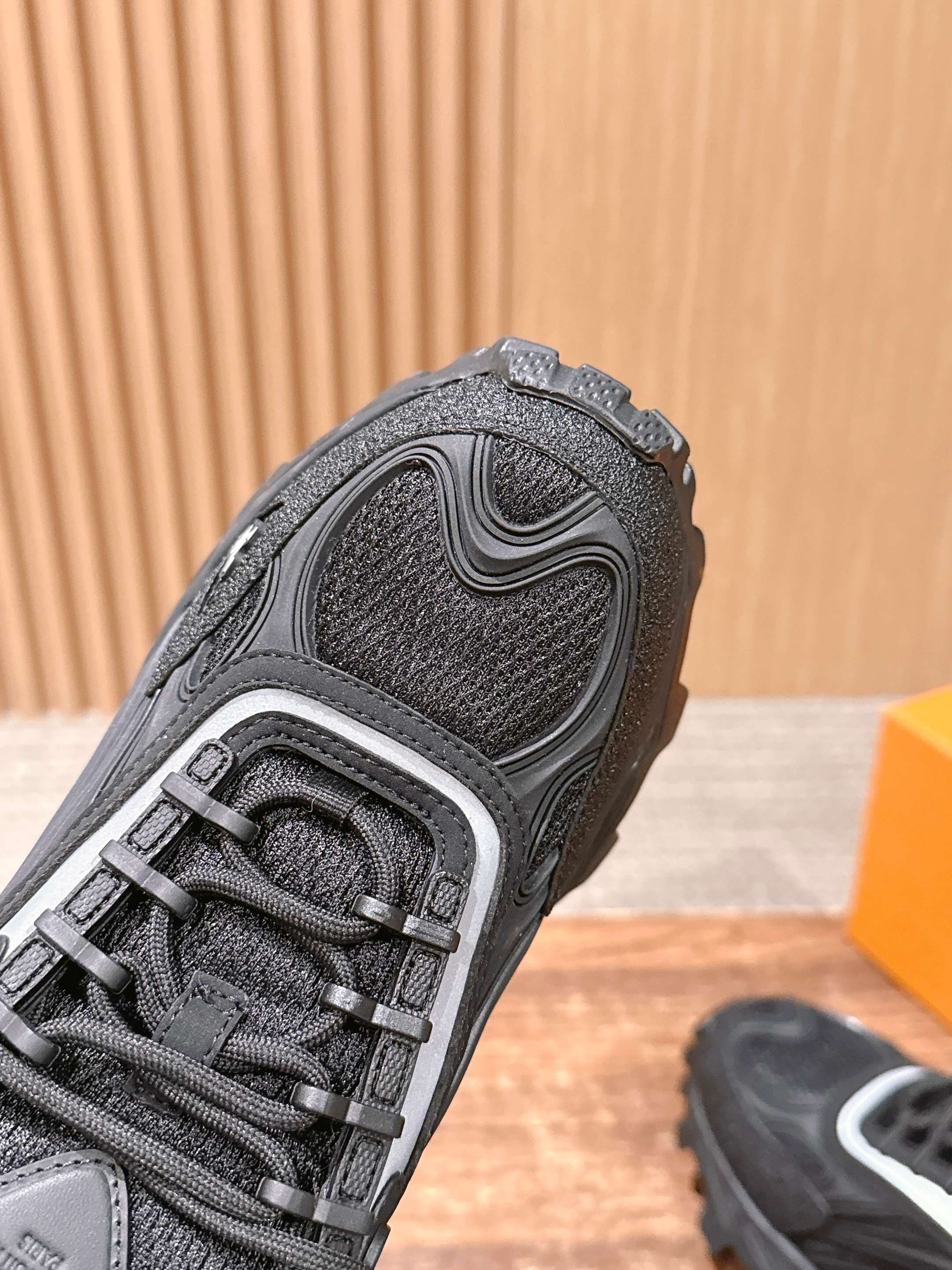 LV ✗ Pharrell Williams 菲董联名的2026新款男士运动鞋 黑色网布+橡胶材质,轻便又耐磨,厚底设计超有支撑力,日常穿搭或运动都OK!鞋面纹理+金属鞋带扣,细节满分,辨识度超高✨。菲董的创意加持,时尚与功能兼备,潮人必入! Size :39-46(46定制不退换)
