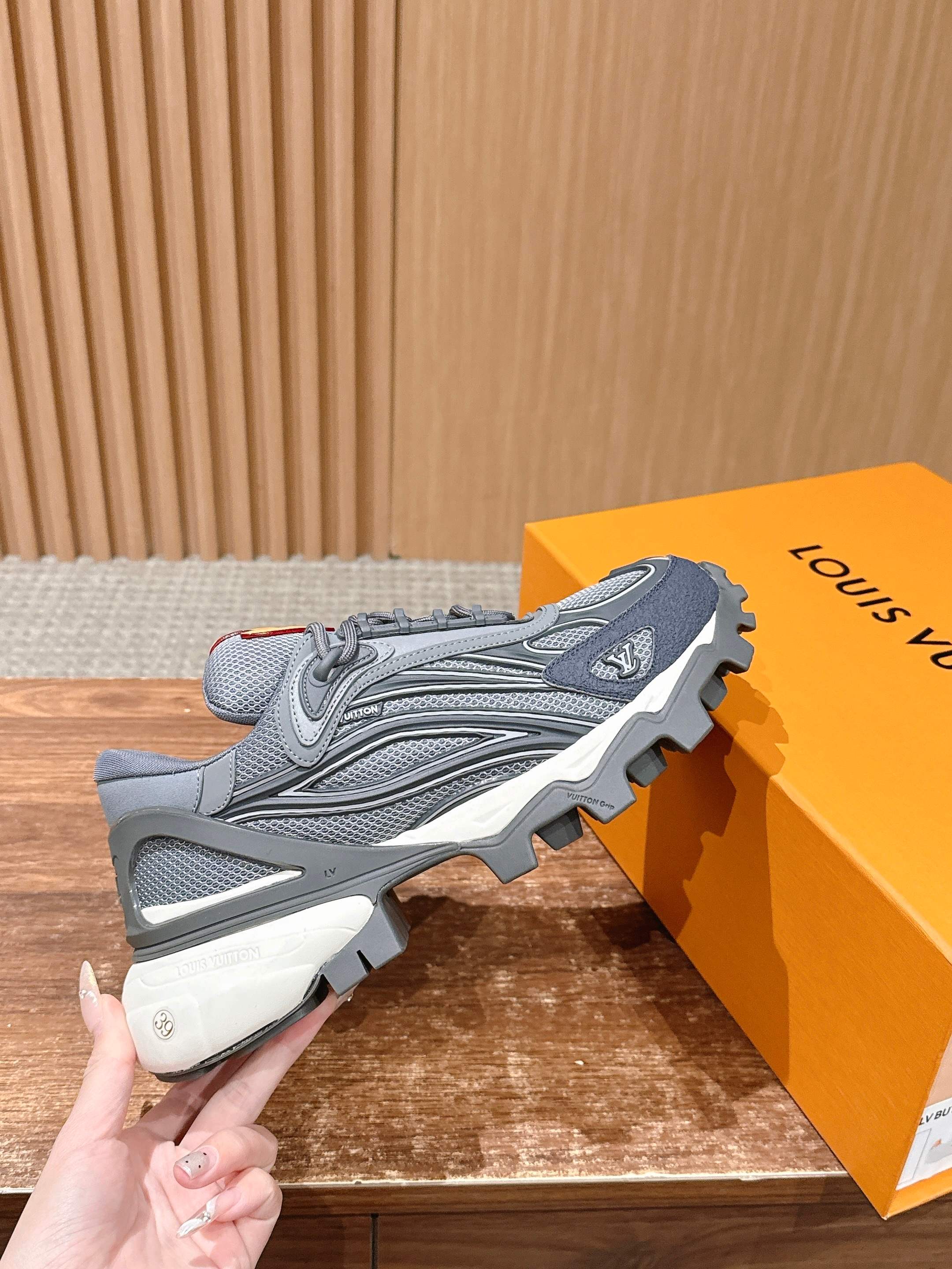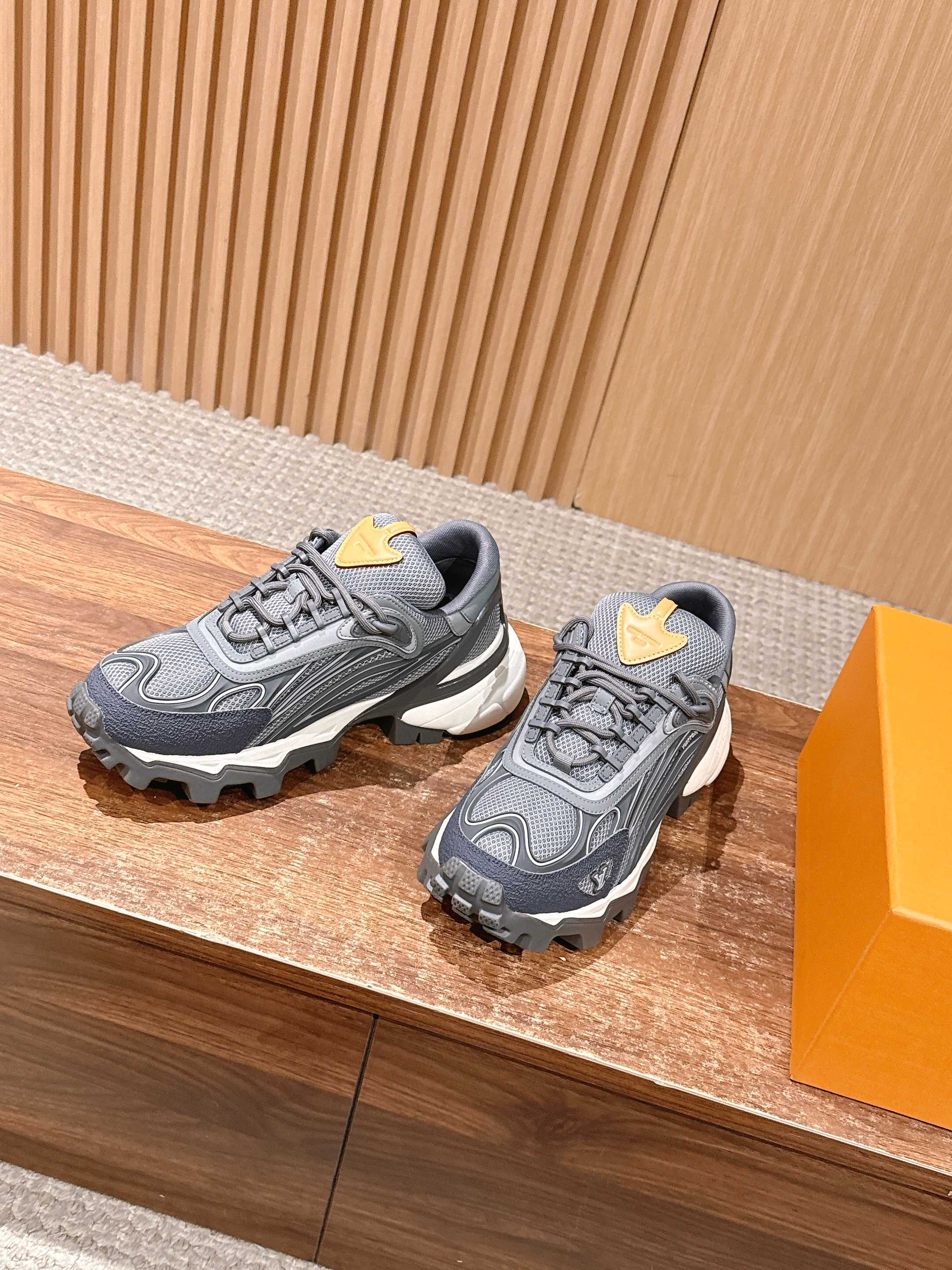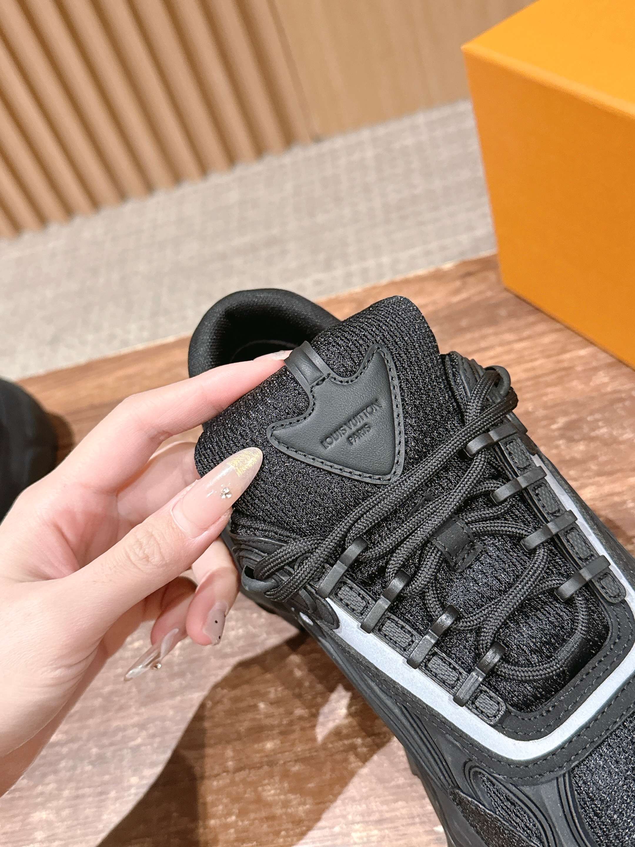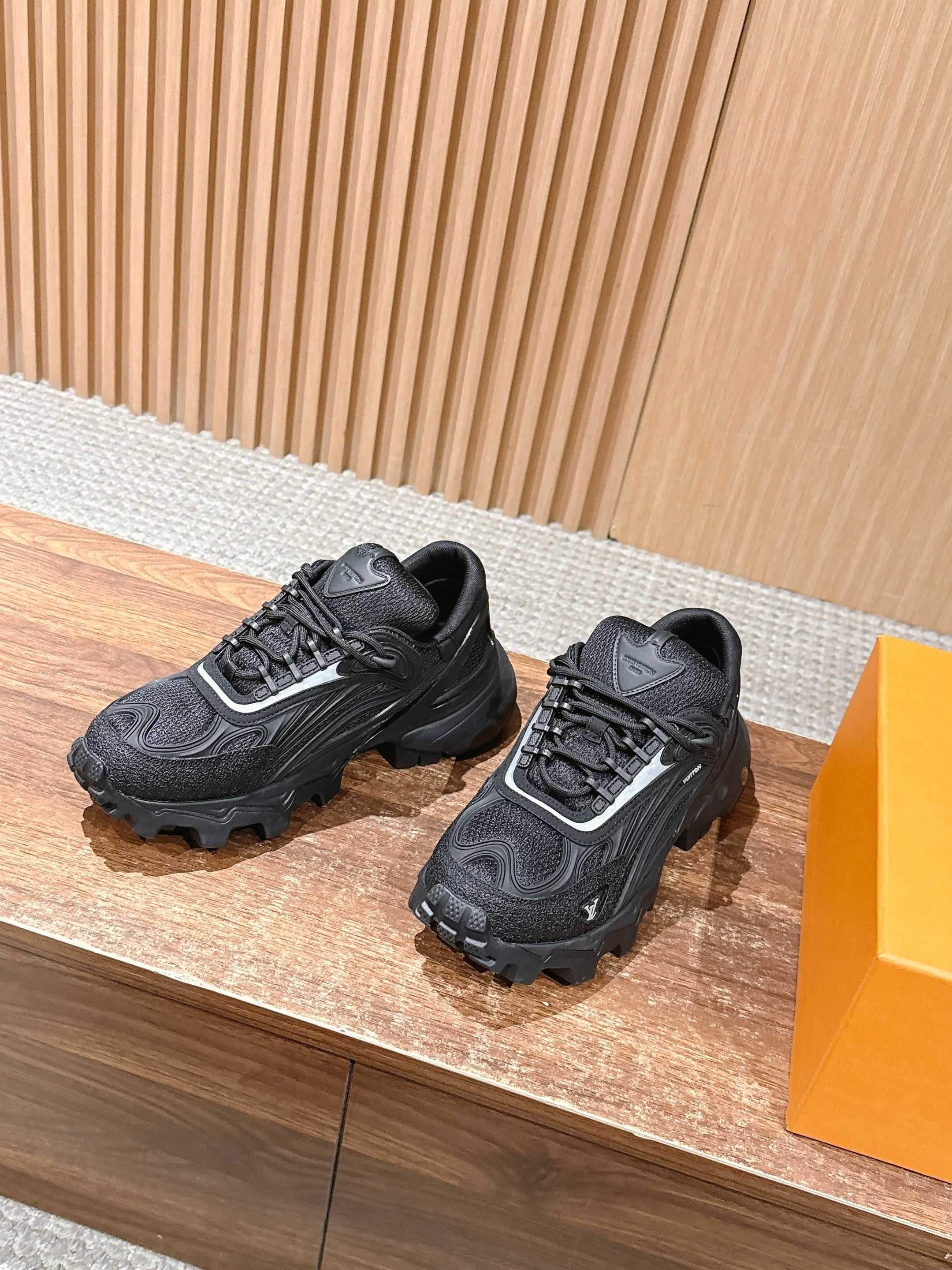 LV ✗ Pharrell Williams 菲董联名的2026新款男士运动鞋 黑色网布+橡胶材质,轻便又耐磨,厚底设计超有支撑力,日常穿搭或运动都OK!鞋面纹理+金属鞋带扣,细节满分,辨识度超高✨。菲董的创意加持,时尚与功能兼备,潮人必入! Size :39-46(46定制不退换)