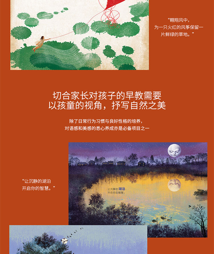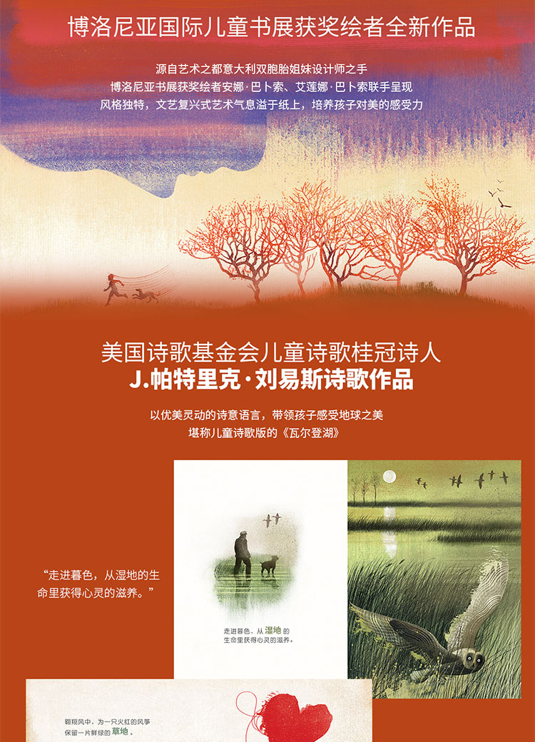 博洛尼亚童书展获奖绘者 × 美国儿童诗歌桂冠诗人用画与诗为孩子打开一扇感悟自然的新视窗★博洛尼亚国际儿童书展获奖绘者全新作品:源自艺术之都意大利双胞胎姐妹设计师之手,博洛尼亚书展获奖绘者安娜·巴卜索、艾莲娜·巴卜索联手呈现,风格独特,文艺复兴式艺术气息溢于纸上,培养孩子对美的感受力。★文本源自美国儿童诗歌桂冠诗人:美国儿童诗歌桂冠诗人J.帕特里克·刘易斯zuixin诗歌作品,以优美灵动的诗意语言,带领孩子感受地球之美,堪称儿童诗歌版的《瓦尔登湖》。★图文和谐结合,意蕴丰富:相得益彰的图文结合,令全书意旨更具深意,经过诗意呈现的丰富内涵,使文本解读时多了“弦外之音”,启发孩子思考更多关于地球、自然与人的命题理。★切合家长对孩子的早教需要:除了日常行为习惯与良好性格的培养,对语感和美感的悉心养成亦是必备项目之一。而在每个孩子成长的初期就能接触到的zui直接、zui真实的美的来源,就是我们的大自然。《地球的孩子》以孩童的视角,抒写自然之美。