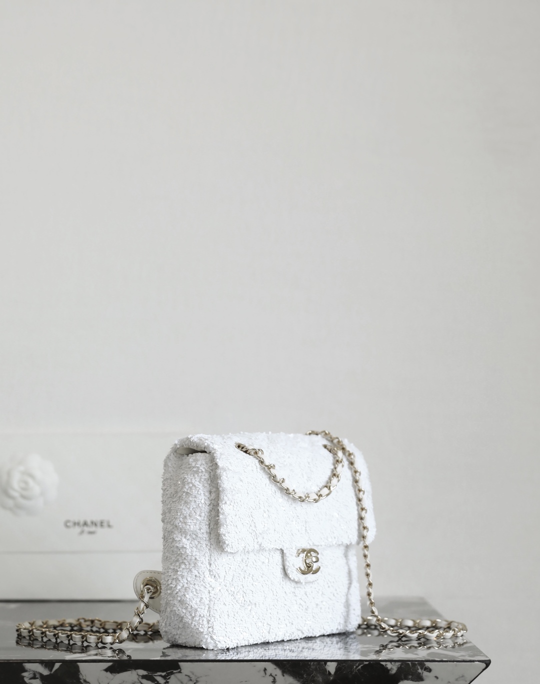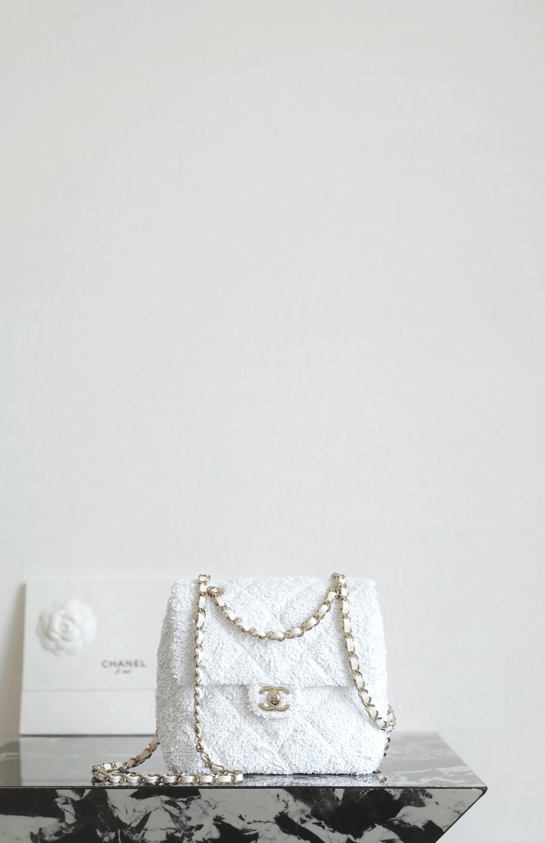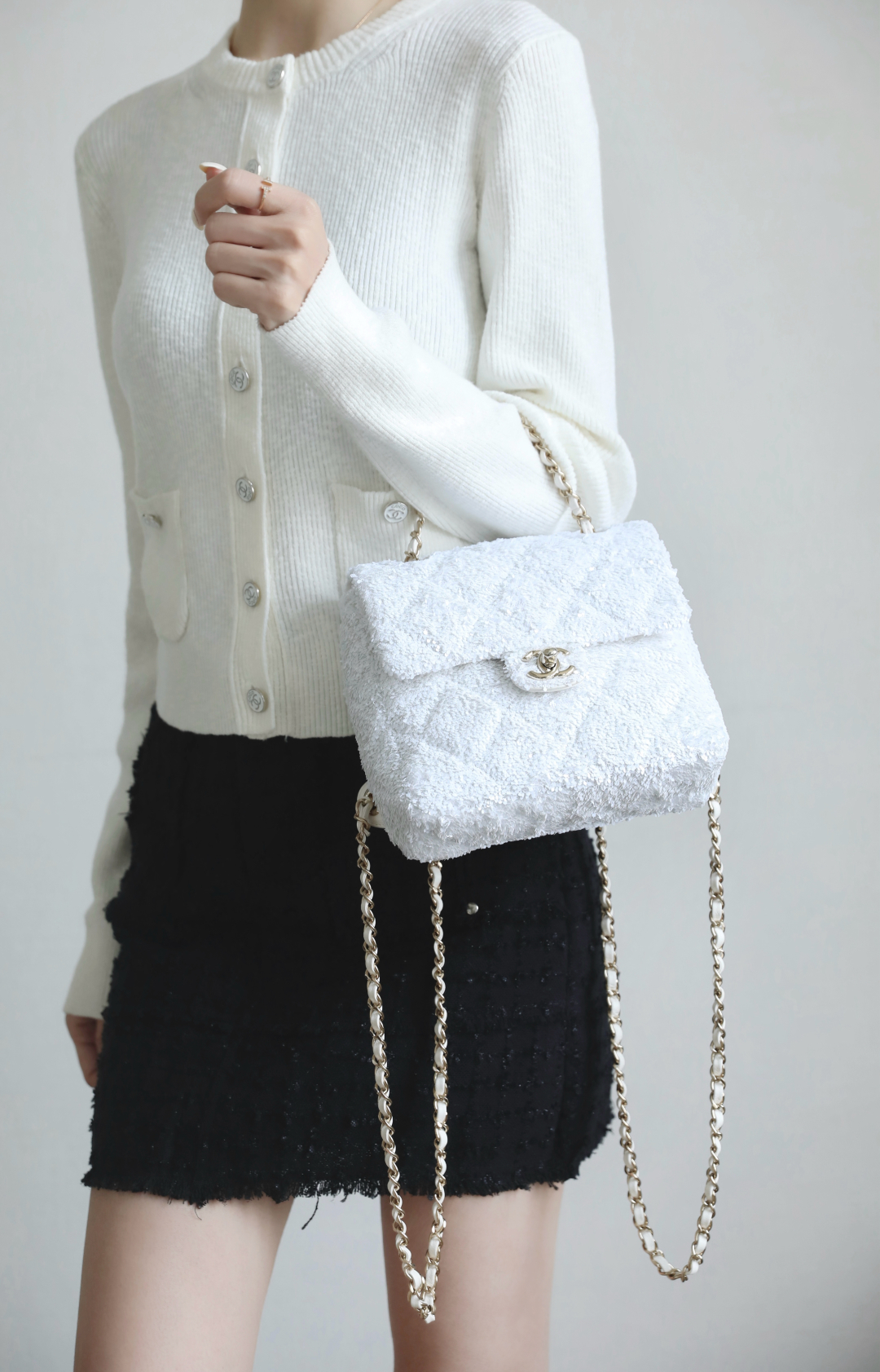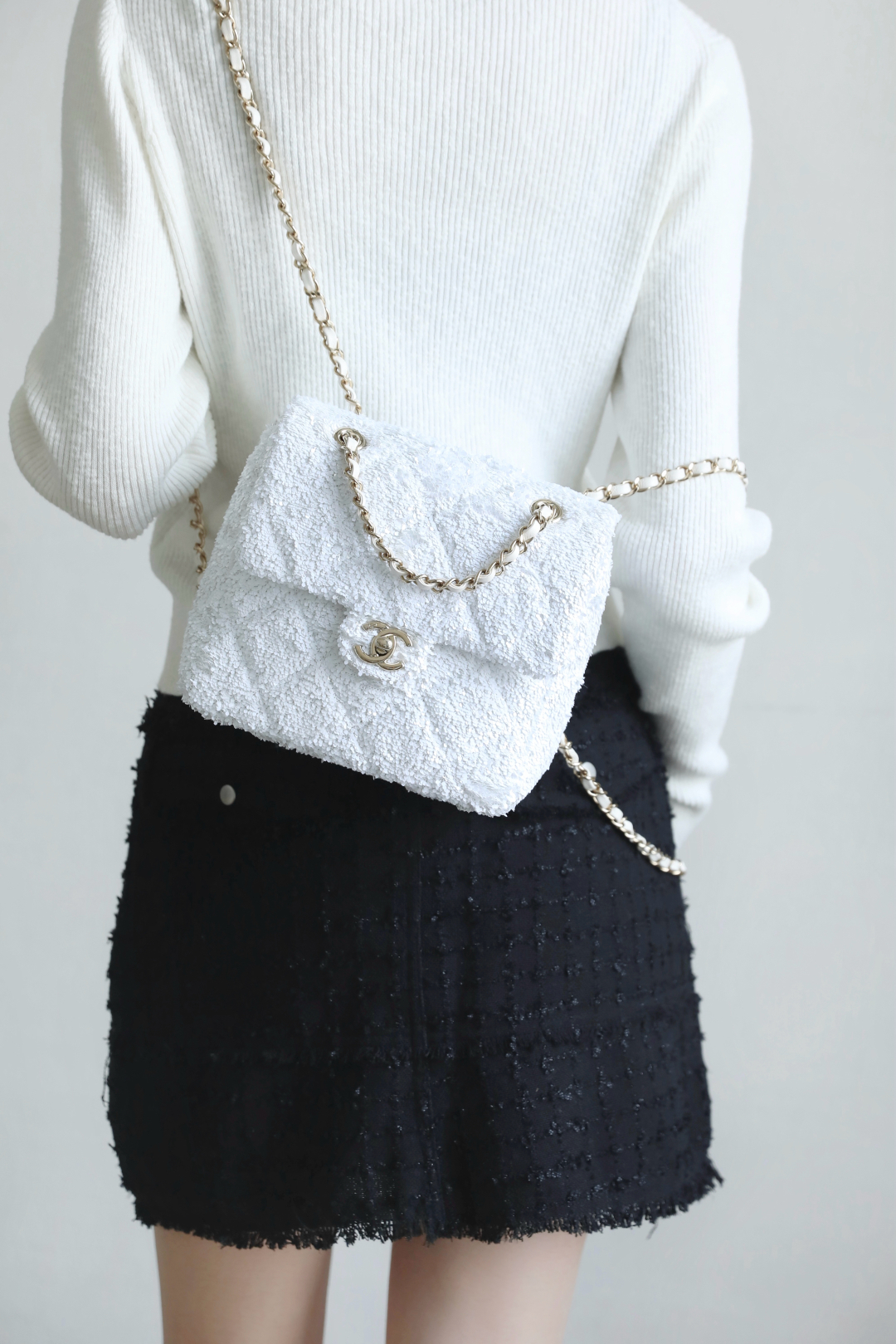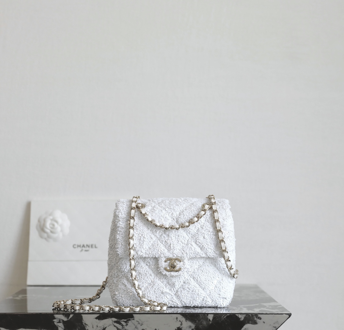 全新到货🆕𝗖𝗛𝗔𝗡𝗘𝗟 𝟮𝟱𝗕秋冬 闪亮片𝗆𝗂𝗇𝗂背包白色🤍 专柜售价𝟨𝟧𝟥𝟢𝟢𝗋𝗆𝖻购入开发~ 火热上新✨亮片𝗆𝗂𝗇𝗂双肩背包白色 珠片像碎钻云朵背在身上自在又炸街 移动的星光走一步闪一下,让人陶醉~ 日常出街吸睛度直接焊死在天花板了🪄 多功能链条设计解放双手氛围感还拉满 面料:葫芦形绗缝亮闪珠片 里皮:𝖦𝖺𝗂𝖾𝗋𝖺"方框标"小羊皮 五金:厚镀𝟣𝟦𝗄淡金链 尺寸:𝟣𝟩.𝟧*𝟣𝟫*𝟩 𝖼𝗆