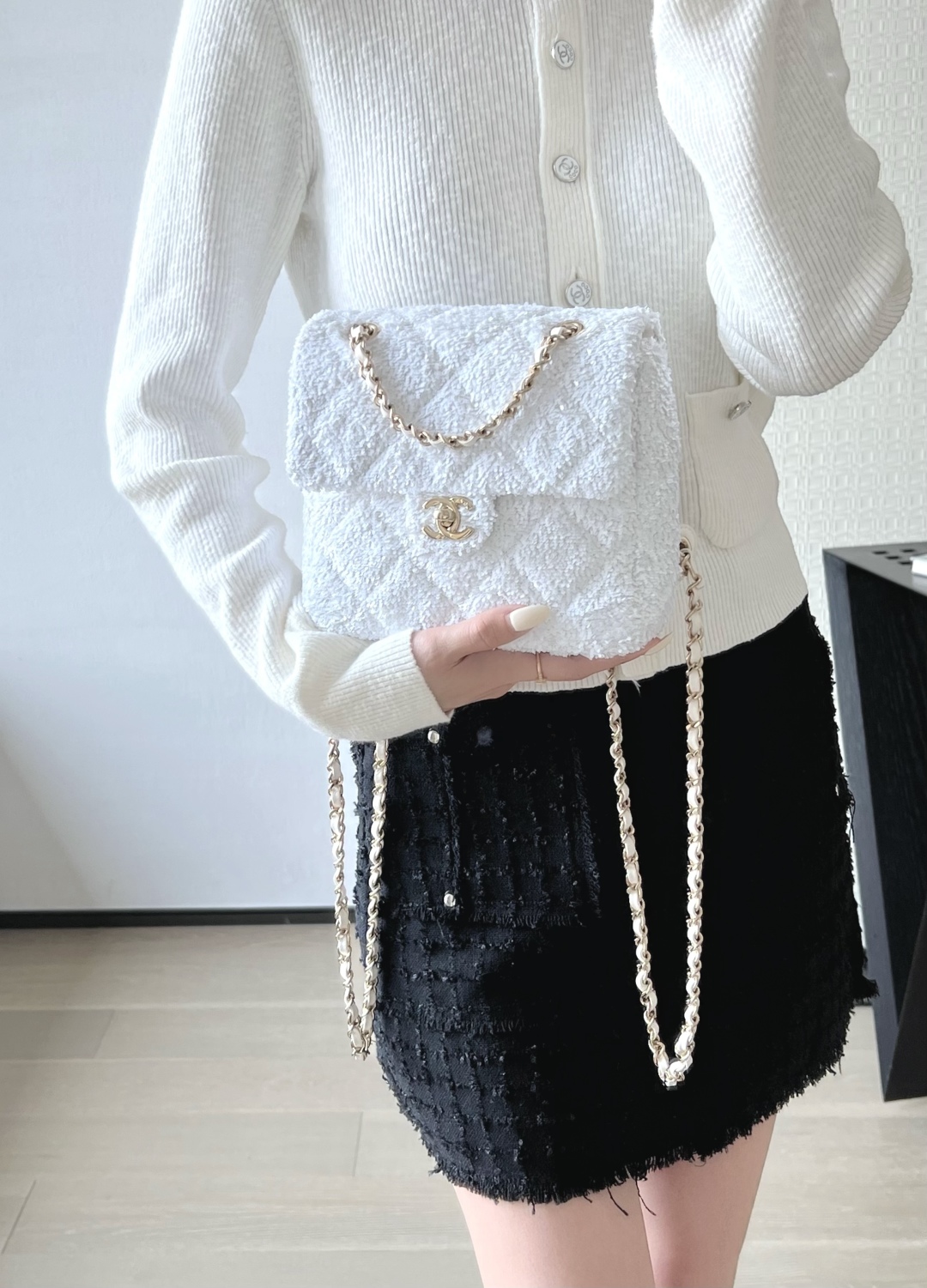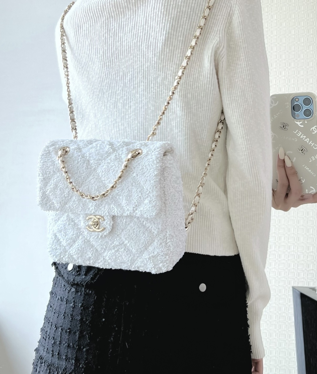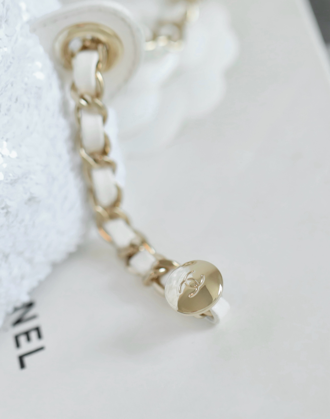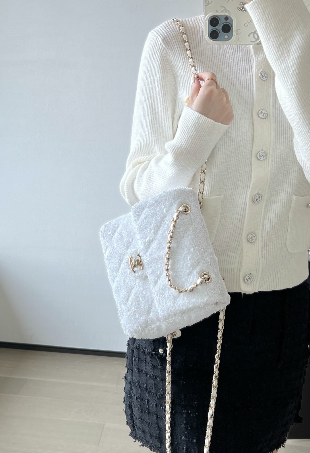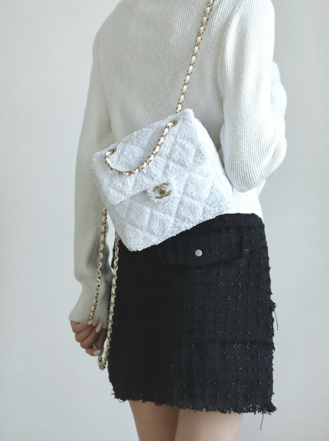 全新到货🆕𝗖𝗛𝗔𝗡𝗘𝗟 𝟮𝟱𝗕秋冬 闪亮片𝗆𝗂𝗇𝗂背包白色🤍 专柜售价𝟨𝟧𝟥𝟢𝟢𝗋𝗆𝖻购入开发~ 火热上新✨亮片𝗆𝗂𝗇𝗂双肩背包白色 珠片像碎钻云朵背在身上自在又炸街 移动的星光走一步闪一下,让人陶醉~ 日常出街吸睛度直接焊死在天花板了🪄 多功能链条设计解放双手氛围感还拉满 面料:葫芦形绗缝亮闪珠片 里皮:𝖦𝖺𝗂𝖾𝗋𝖺"方框标"小羊皮 五金:厚镀𝟣𝟦𝗄淡金链 尺寸:𝟣𝟩.𝟧*𝟣𝟫*𝟩 𝖼𝗆