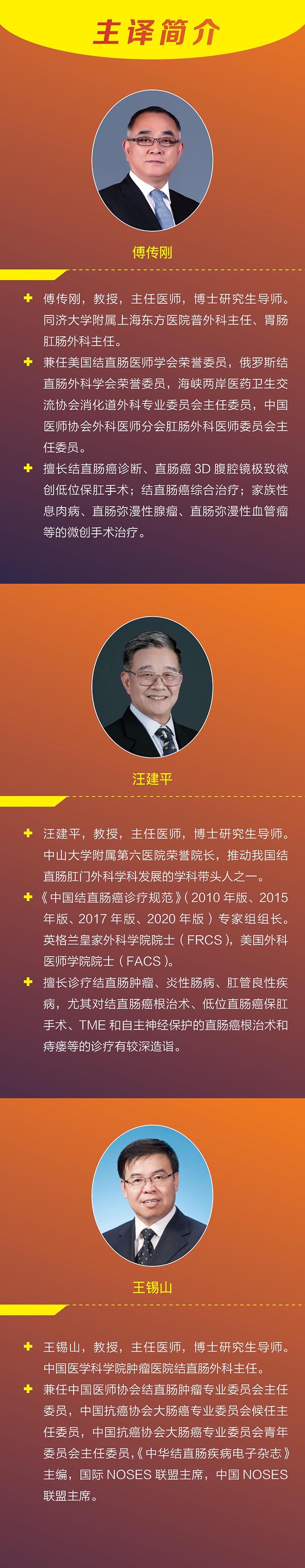 汪建平,教授,主任医师,博士研究生导师。中山大学附属第六医院荣誉院长,推动我国结直肠肛门外科学科发展的学科带头人之一。《中国结直肠癌诊疗规范》(2010年版、2015年版、2017年版、2020年版)专家组组长。英格兰皇家外科学院院士(FRCS),美国外科医师学院院士(FACS)。擅长诊疗结直肠肿瘤、炎性肠病、肛管良性疾病,尤其对结直肠癌根治术、低位直肠癌保肛手术、TME和自主神经保护的直肠癌根治术和痔瘘等的诊疗有较深造诣。
