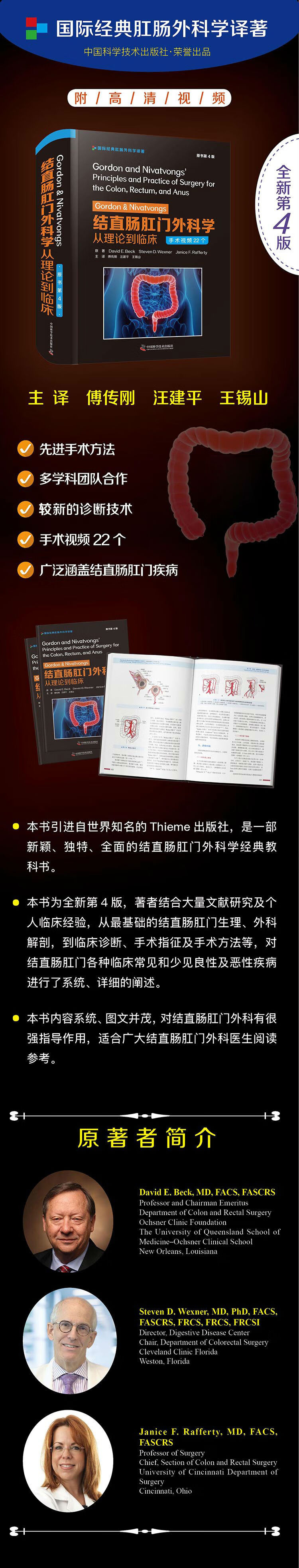 本书引进自世界知名的 Thieme 出版社,是一部新颖、独特、全面的结直肠肛门外科学经典教科书。本书为全新第 4 版,著者结合大量文献研究及个人临床经验,从最基础的结直肠肛门生理、外科解剖,到临床诊断、手术指征及手术方法等,对结直肠肛门各种临床常见和少见良性及恶性疾病进行了系统、详细的阐述。本书内容系统、图文并茂,对结直肠肛门外科有很强指导作用,适合广大结直肠肛门外科医生阅读参考。
