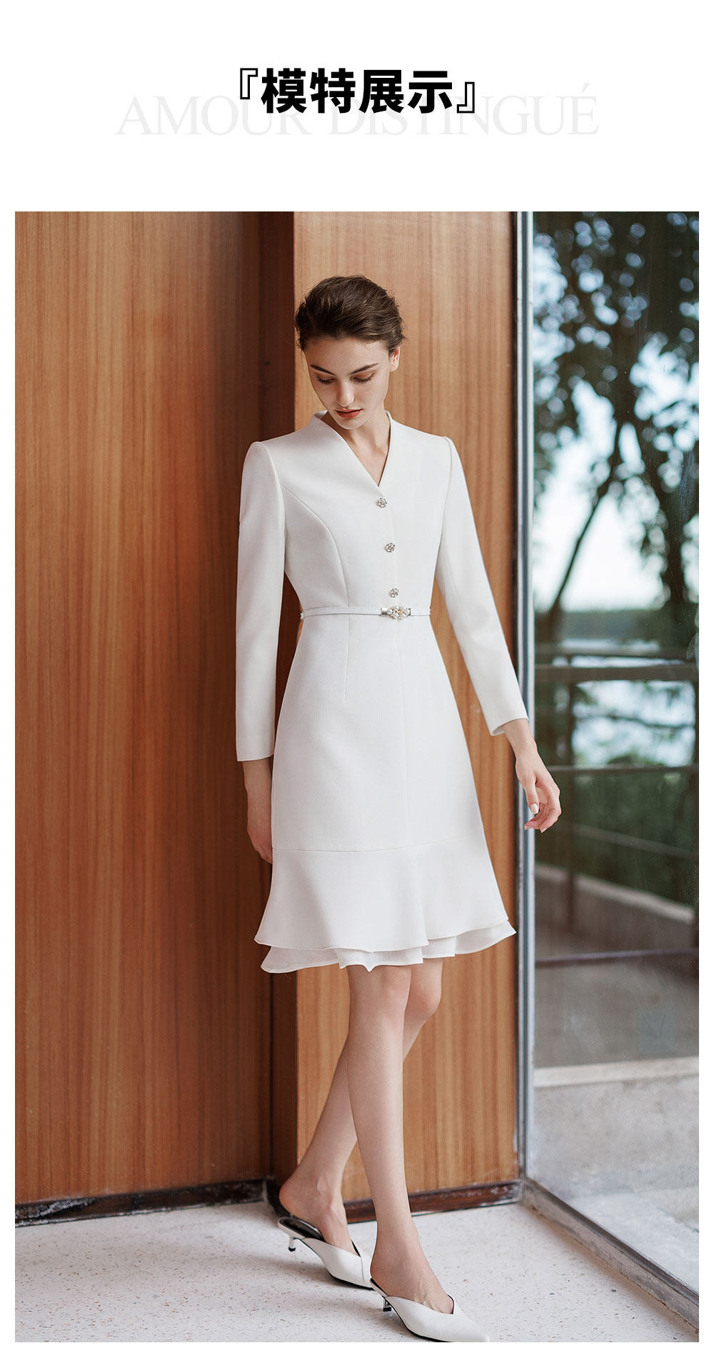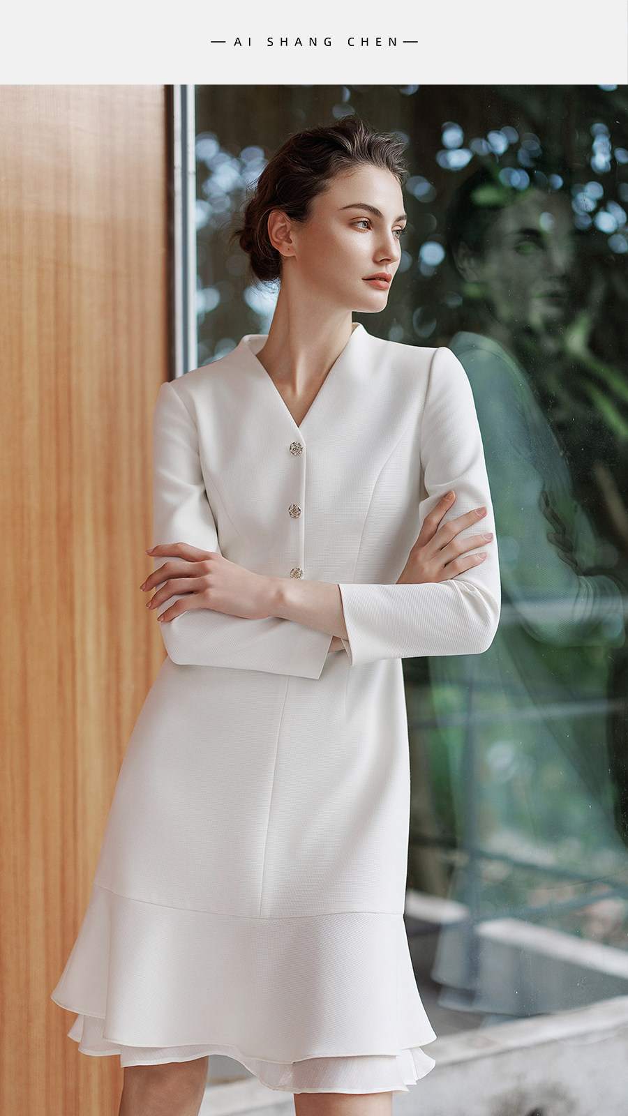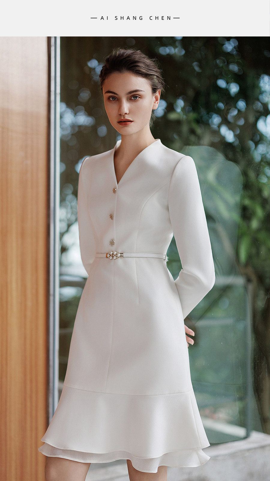 艾尚臣轻奢优雅风白色连衣裙女V领荷叶边气质裙高级感知性连身裙