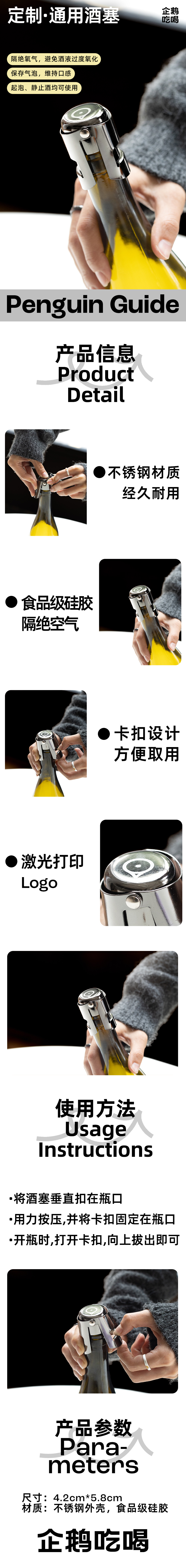 企鹅市集|定制通用葡萄酒酒塞 起泡酒静态酒通用 食品级硅胶 耐用不锈钢 隔绝氧气 保存气泡