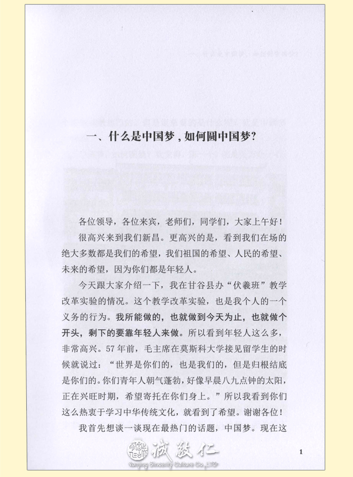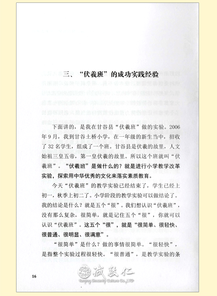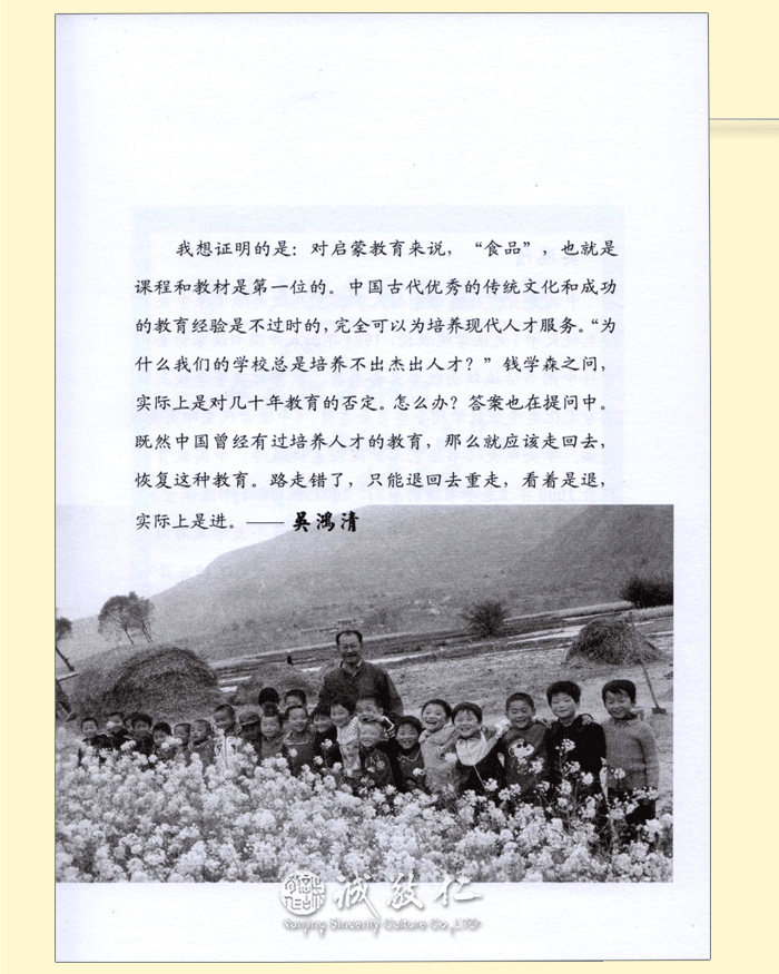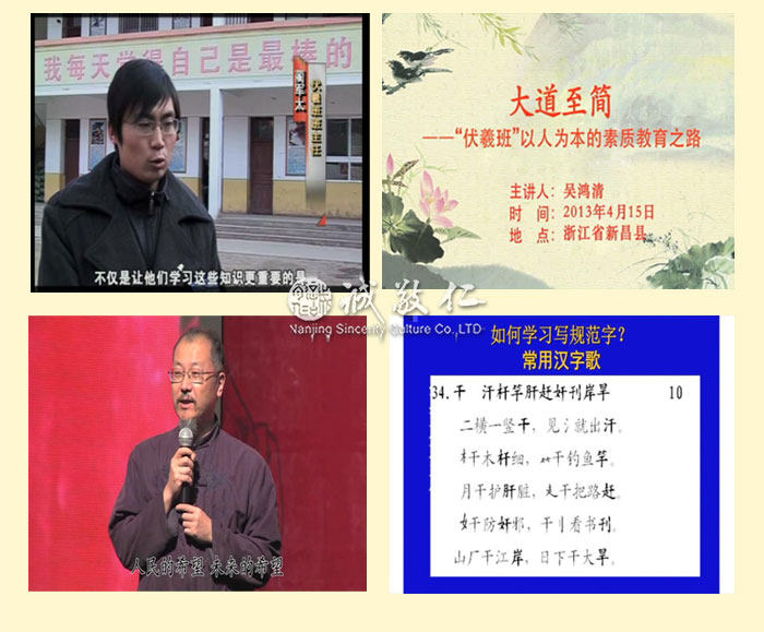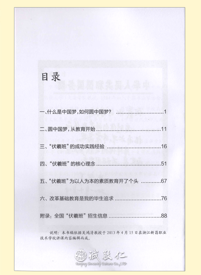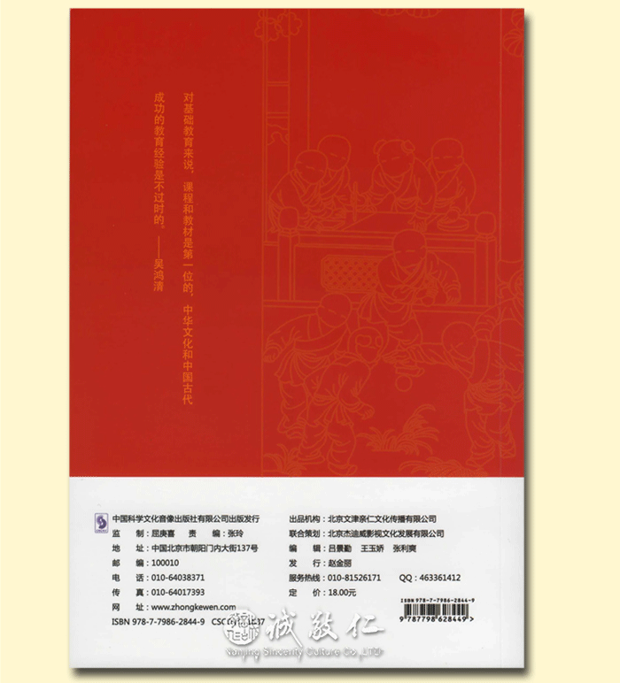 【基本信息】 书名:大道至简——[伏羲班]以人为本的素质教育之路 作者:吴鸿清 出版日期:2013年8月 出版社:中国科学文化音像出版社有限公司 ISBN:9787798628449 CSCDVD-1687 开本:大32开 页码:91页 碟片:DVD9 1张碟 定价:18元(书+DVD9碟) 【书籍目录】 一、什么是中国梦,如何圆中国梦?……1 二、圆中国梦,从中国教育开始。……11 三、“伏羲班”的成功经验……16 四、“伏羲班”的核心理念……51 五、“伏羲班”为以人为本的素质教育开了个头……67 六、改革基础教育是我的毕生追求……76 附录:全国“伏羲班”招生信息……88 【作者简介】 吴鸿清,中共党员,伏羲班创始人,国家开放大学(原中央广播电视大学)文法学院教授,1984年加入中国书法家协会。曾任中国书协编辑出版委员会委员、教育部高等学校高职高专文化类专业教学指导委员会委员,《中国古代玺印大典》主编。中央电大《书法艺术》课程主讲教师,中国教育电视台2000年《老年书法讲座》、2002年《亲子书法课堂》、2010年《新理念书法讲座》主讲,并在多个大学及海内外多地讲授书法。设计发明“乾坤格书写纸”、“执笔辅正器”,并获国家专利。2006年9月,义务到甘肃省天水市甘谷县(国家级贫困县)土桥小学支教,创办“伏羲班”,进行小学基础教育改革实验,探索落实以人为本,全面实施素质教育的道路。 【内容简介】 说明:本书稿依据吴鸿清教授与2013年4月15日在浙江新昌职业技术学校讲课内容编辑而成。 吴鸿清教授是“伏羲班”的创始人。本光盘及配套图书是吴教授讲述的在伏羲的故里甘谷创办“伏羲班”,进行为期六年的小学教育改革实验成果。 “为什么我们的学校总是培养不出人才?”这是著名的“钱学森之问”。吴鸿清教授用他的实际行动为我们求证着答案。在“伏羲班”,吴教授探索用优秀的中华传统文化和中国古代教育经验落实人本素质教育。通过六年教学,“伏羲班”取得了明显的教学效果。突出表现在学生孝敬父母、尊老爱幼,待人彬彬有礼;文武双全、多才多艺;在应试教育考场上的成绩也名列前茅。他们的书画作品受到国务院原总理朱镕基的赞叹。伏羲班学生的综合素质普遍超过同龄人。 “伏羲班”的教育改革实验证明,对基础教育来说,课程和教材是第一位的,中华文化和中国古代成功的教育经验是不过时。吴教授用五个“很”让我们认识了“伏羲班”:第一,做的事情很简单;第二,教学实验的过程很轻快;第三,教学实验的条件很普通;第四,教学实验的成果很明显;第五,家长很满意。 在吴教授的努力和推动下,“伏羲班”目前在全国各地逐渐落地开花。希望本书的出版能够让越来越多的人认识“伏羲班”,越来越多的教师和教育界的有识之士能参与到“伏羲班”的建设中来,让更多的孩子能够在课堂上学习到祖国优秀的传统文化,享受到真正的素质教育。 【编辑推荐】 太好了,人性教育。科技都在提倡以人为本,教育更要以人性教育为本:教:上行下效,育:长善救失也。 实验的过程充满科学发展观。历史和现实都证明传统国学教材是素质教育的好教材,科学早已证明幼儿时期是人一生记忆力的最佳时期。这次实验意义重大,关系整个民族的复兴和教育的革新。 能在一片喧嚣中执着一念做点有益于国家民族的事,伏羲班教师的精神让人感动。吴鸿清教授的精神让人尤其感动。 伏羲班之所以引起强烈反响,关键在于有一种理念,和团结在这个理念下的一群人,他们的责任感和忧患意识,使一个普通的教学班成为许多人精神的向往。在这点上,我们完全可以说,伏羲班是甘谷的,甘肃的,更是中国的,世界的。 |