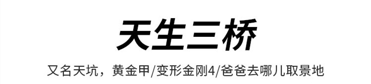 武隆天生三桥,属于典型的喀斯特地貌,罕见的地质奇观旅游区,也是电影《满城尽带黄金甲》和《变形金刚4》的取景地。武隆天生三桥位于武隆县仙女山镇,游客一般是在仙女镇的游客中心购票后,乘坐景区提供的环保车到达景区。游客进入景区后,可以乘坐观光电梯下到谷底的天坑中,再沿着坑底幽静的小道步行游览。此时环顾四周,有溪水流淌;抬头仰望,都是悬崖万丈,有山泉从上飞泻而下。