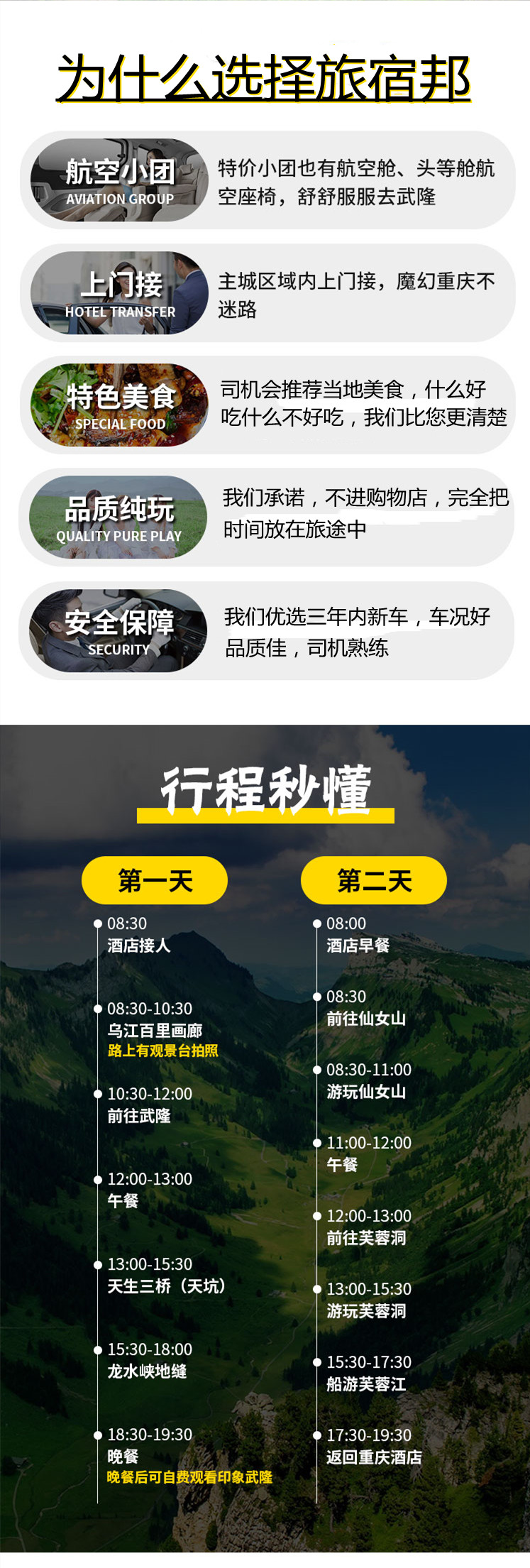 | 大交通 | 本产品为目的地参团产品,不包含出发地至重庆往返机票,儿童不含门票,住宿,只是来回的交通 |