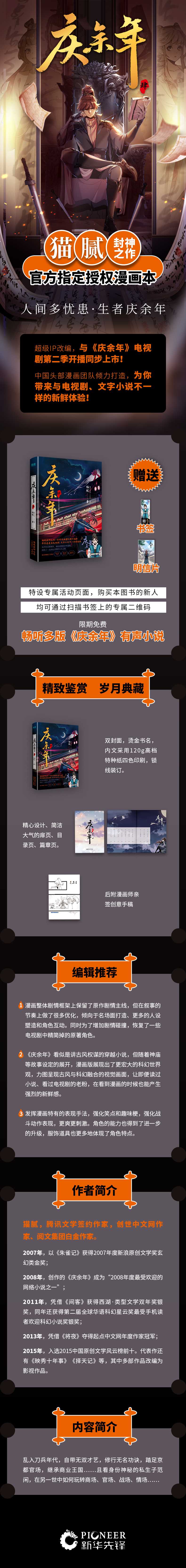 1.漫画整体剧情框架上保留了原作剧情主线,但在叙事的节奏上做了很多优化,倾向于名场面打造、更多的人设塑造和角色互动。同时为了增加剧情碰撞,恢复了一些电视剧中精简掉的原著角色。2.《庆余年》看似是讲古风权谋的穿越小说,但随着神庙等故事设定的展开,漫画版展现出了更宏大的科幻世界观,力图呈现古风与科幻融合的视觉画面,让即便读过小说、看过电视剧的老粉,在看到漫画的时候也能产生强烈的新鲜感。3.发挥漫画特有的表现手法,强化笑点和趣味梗,强化战斗动作表现,更爽更刺激。角色的能力也得到了进一步的升级,服饰道具也更多地体现了角色特点。4.精美双封面,书名烫金、内文精选高档特种纸彩色印刷!极具观赏和收藏价值。5.随书附赠官方授权限定版精美人物书签、明信片!
