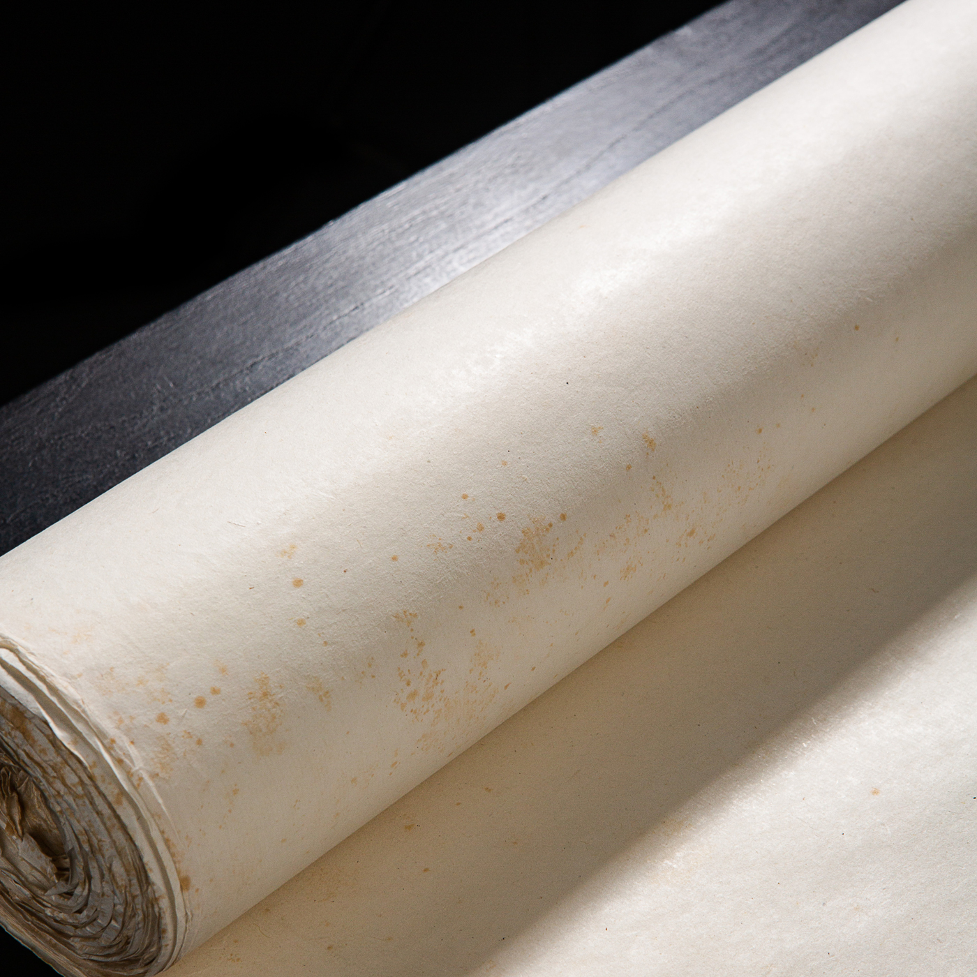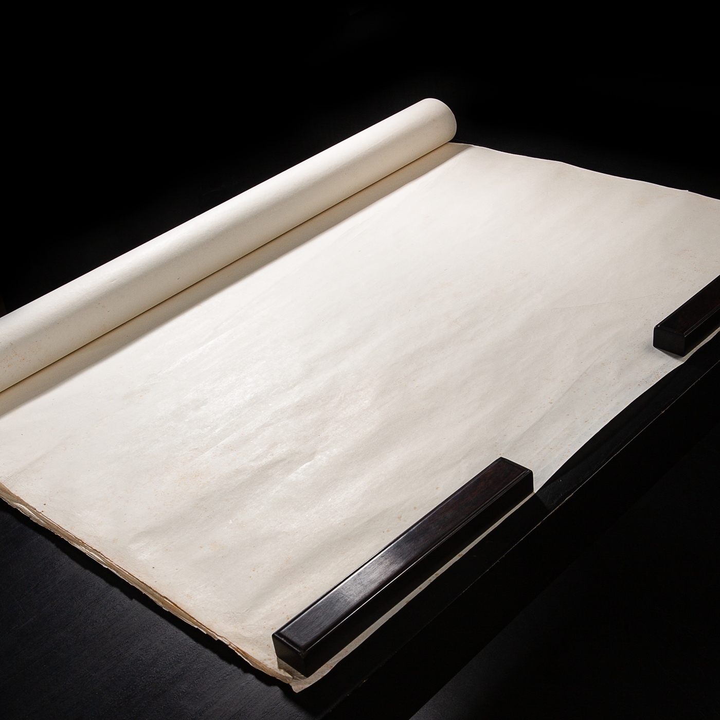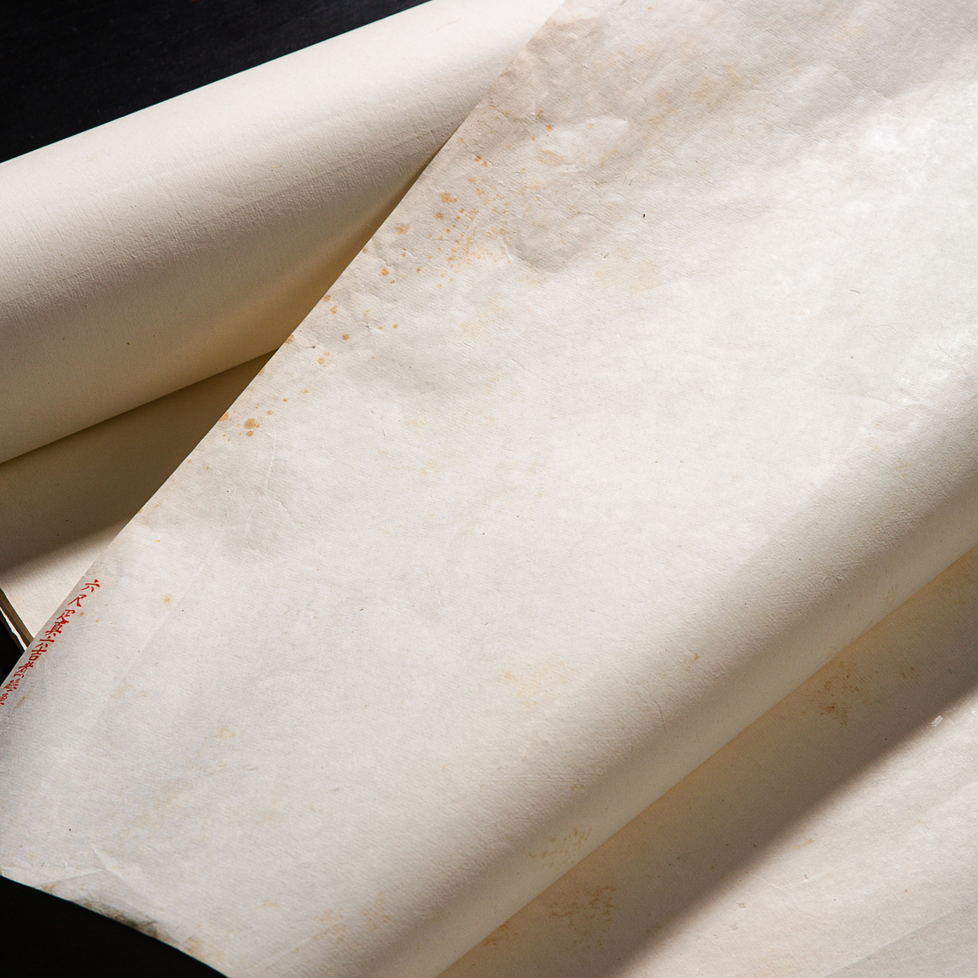 清代杭州匀碧斋制“六尺疋真六吉煮硾宣”,其质地莹润如玉,手感细腻丝滑,帘纹精美,用料扎实,色泽温和古朴,宝光外放。此纸极罕见,收藏价值极高。