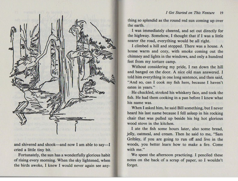 “My bed is on the right as you enter, and is made of ash slats and covered with deerskin. On the left is a small fireplace about knee high. It is of clay and stones. It has a chimney that leads the smoke out through a knothole. I chipped out three other knotholes to let fresh air in. The air coming in is bitter cold. It must be below zero outside, and yet I can sit here inside my tree and write with bare hands. The fire is small, too. It doesn’t take much fire to warm this tree room. “It is the fourth of December, I think. It may be the fifth. I am not sure because I have not recently counted the notches in the aspen pole that is my calendar. I have been just too busy gathering nuts and berries, smoking venison, fish, and small game to keep up with the exact date. “The lamp I am writing by is deer fat poured into a turtle shell with a strip of my old city trousers for a wick.