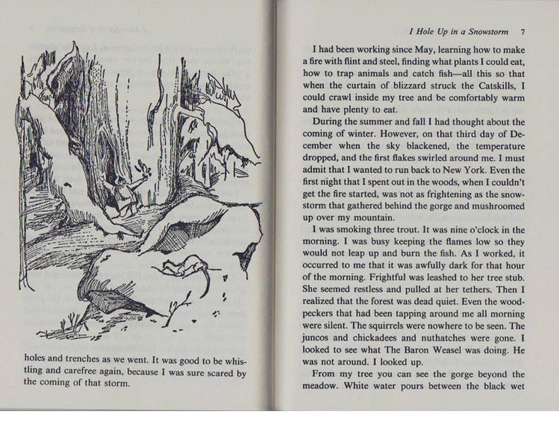 “I wonder if The Baron, that?s the wild weasel who lives behind the big boulder to the north of my tree, is also denned up. Well, anyway, I think the storm is dying down because the tree is not crying so much. When the wind really blows, the whole tree moans right down to the roots, which is where I am.