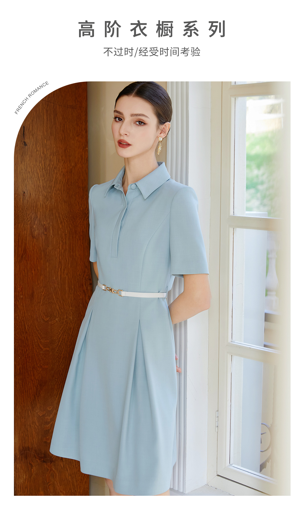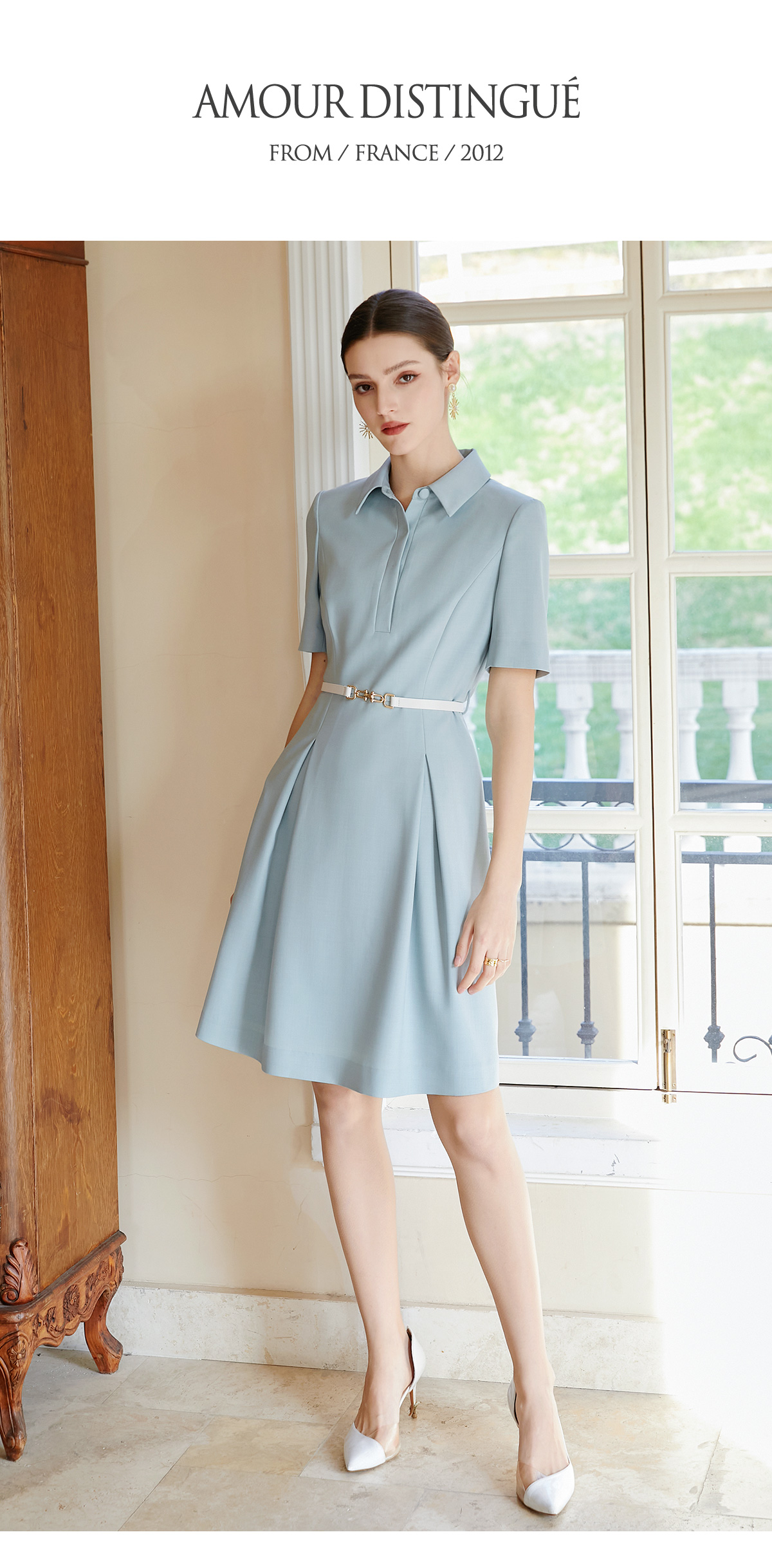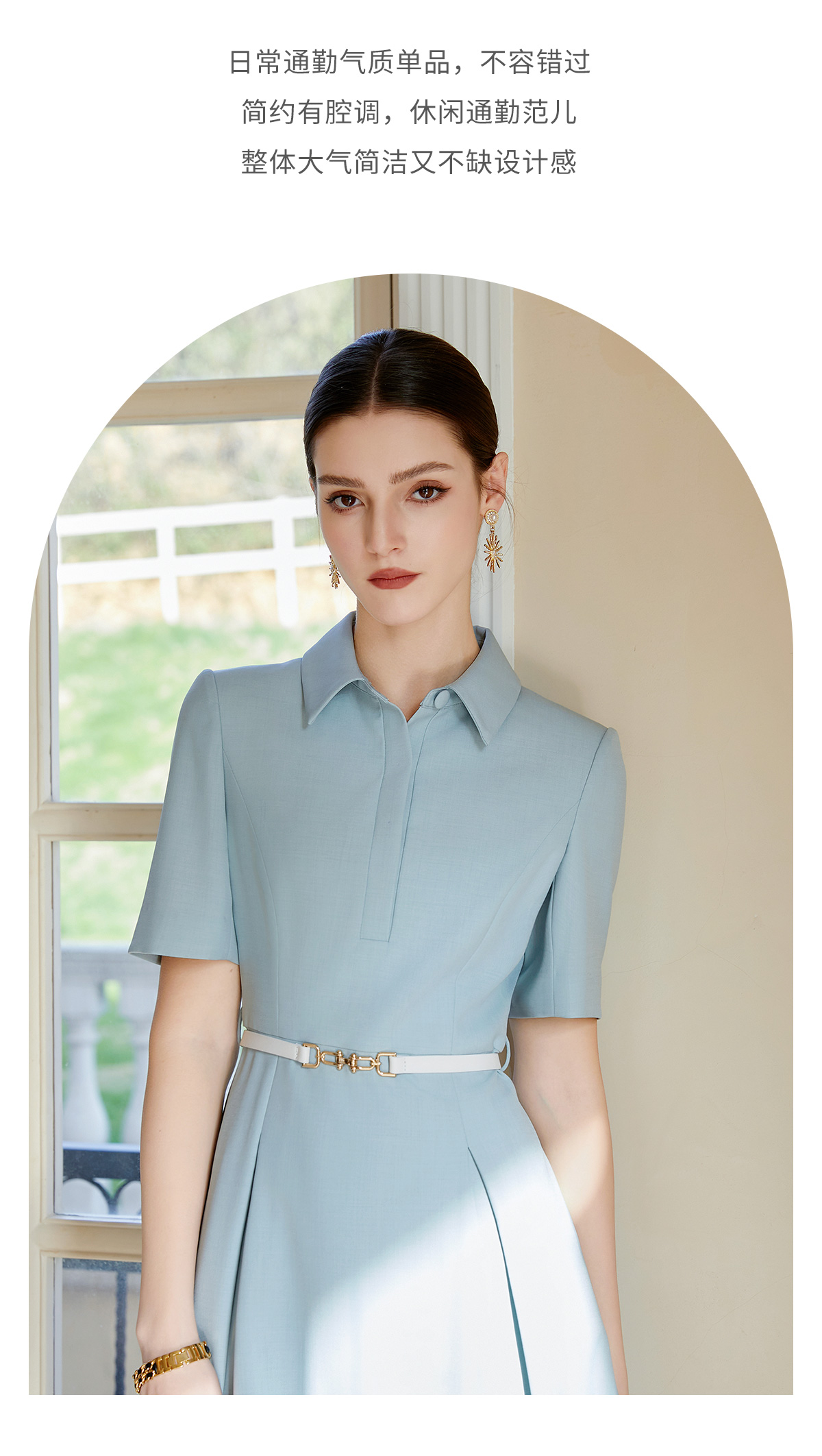 AD蓝色连衣裙2024新款女夏季短袖立领衬衫裙子上班族通勤职业装