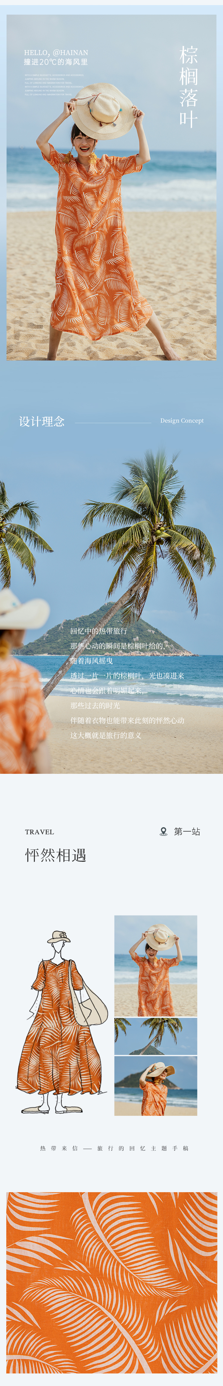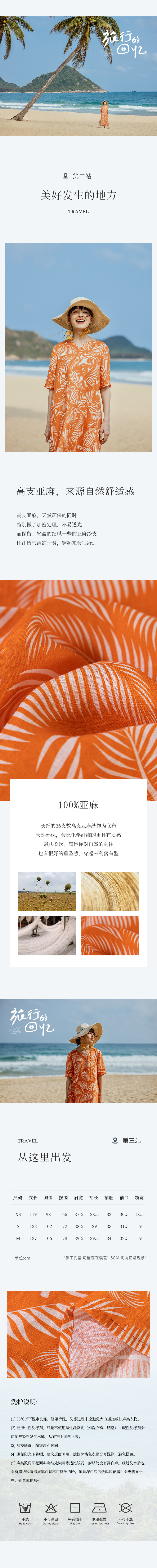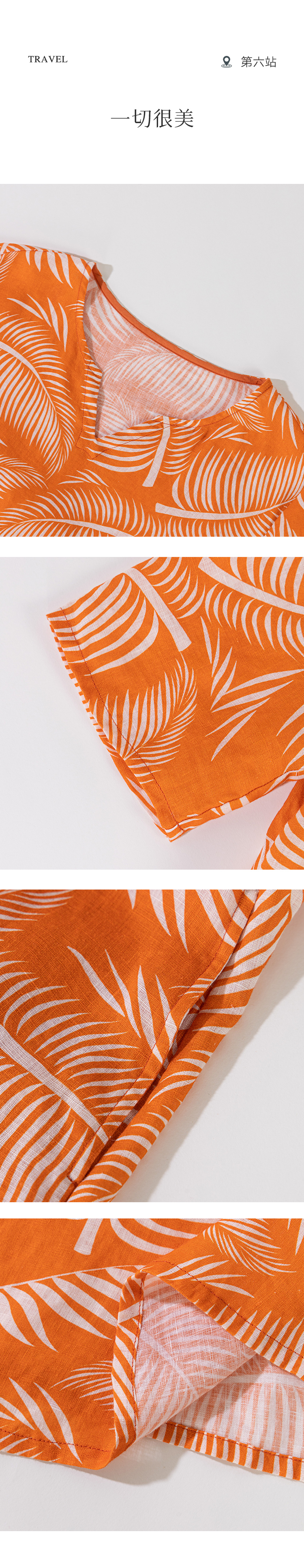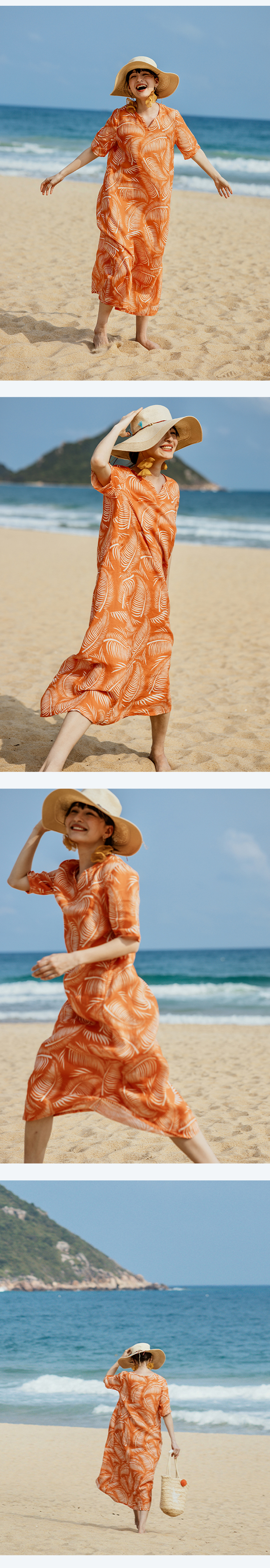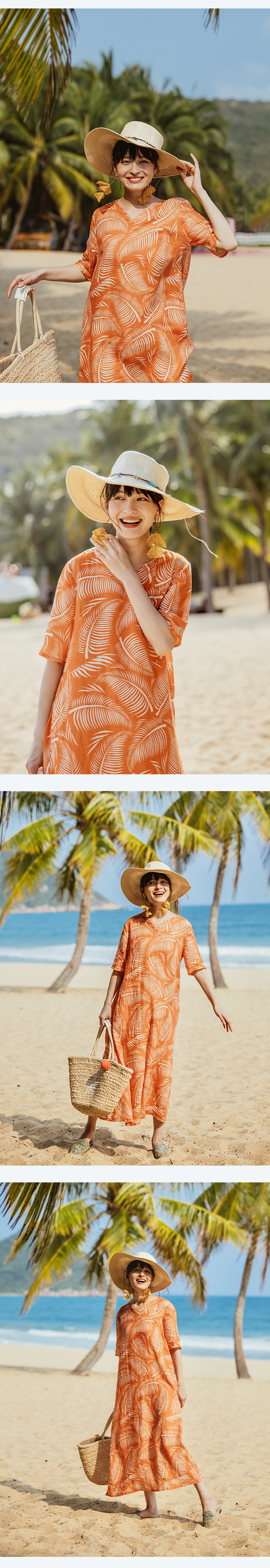 绽放旅行女装331/海边度假连衣裙高端亚麻棕榈叶印花显瘦旅游穿搭