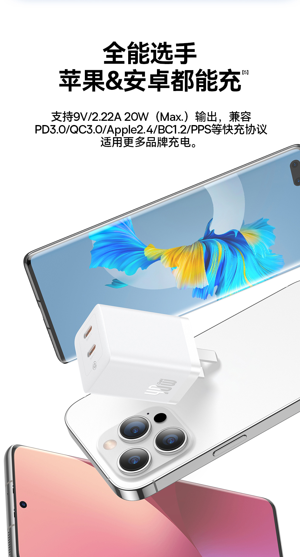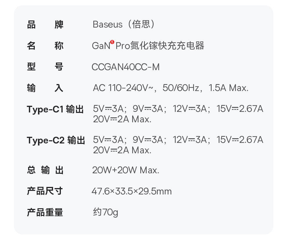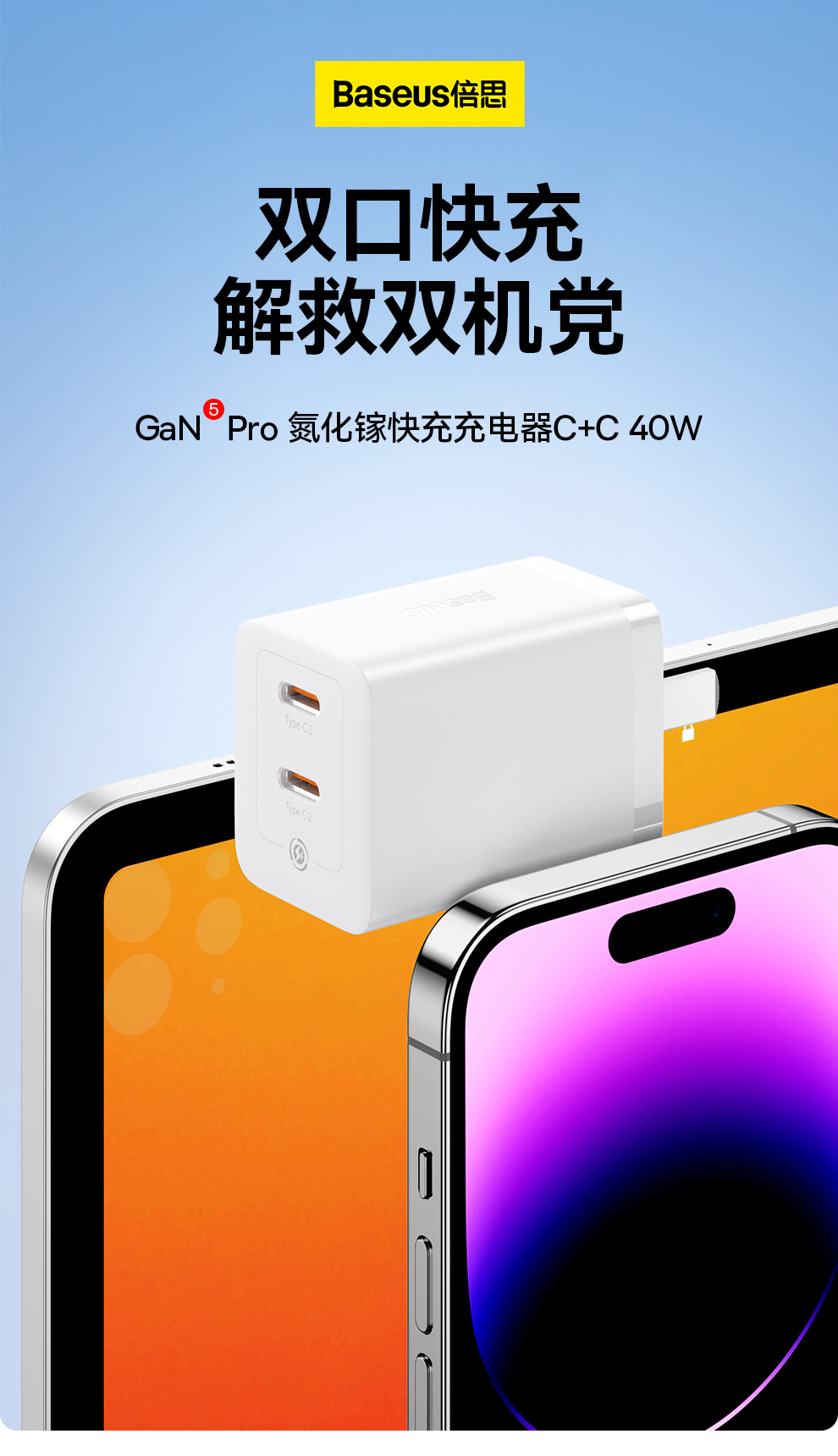 倍思 GaN5 Pro 40W 氮化镓快充充电器C+C