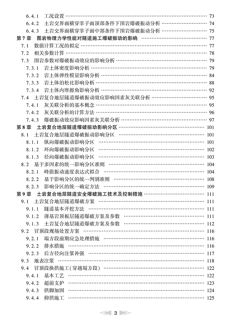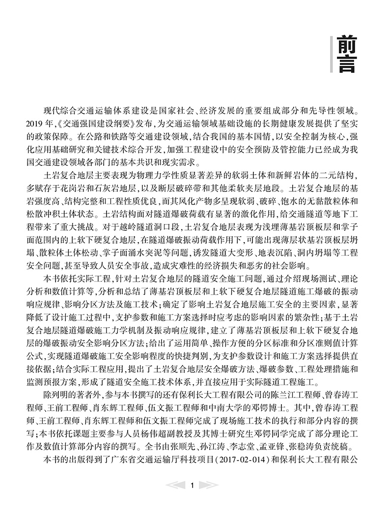 本书针对土岩复合地层的隧道施工爆破安全控制问题,系统分析了薄基岩顶板层和上软下硬两种地层条件下隧道施工爆破振动效应,探讨了基岩顶板层厚度、岩体力学参数和土岩交界面形态等因素对地震动的影响规律;结合岩体损伤、土体剪切破坏判据和爆破振动安全控制标准,建立了土岩复合地层施工爆破的安全控制标准和影响分区划分方法。同时,依托具体工程实践,系统梳理总结了某施工作业要点及安全质量控制措施。本书可供从事隧道和地下工程的设计、施工及科研专业技术人员,以及从事爆破工作的科研及技术人员学习参考。