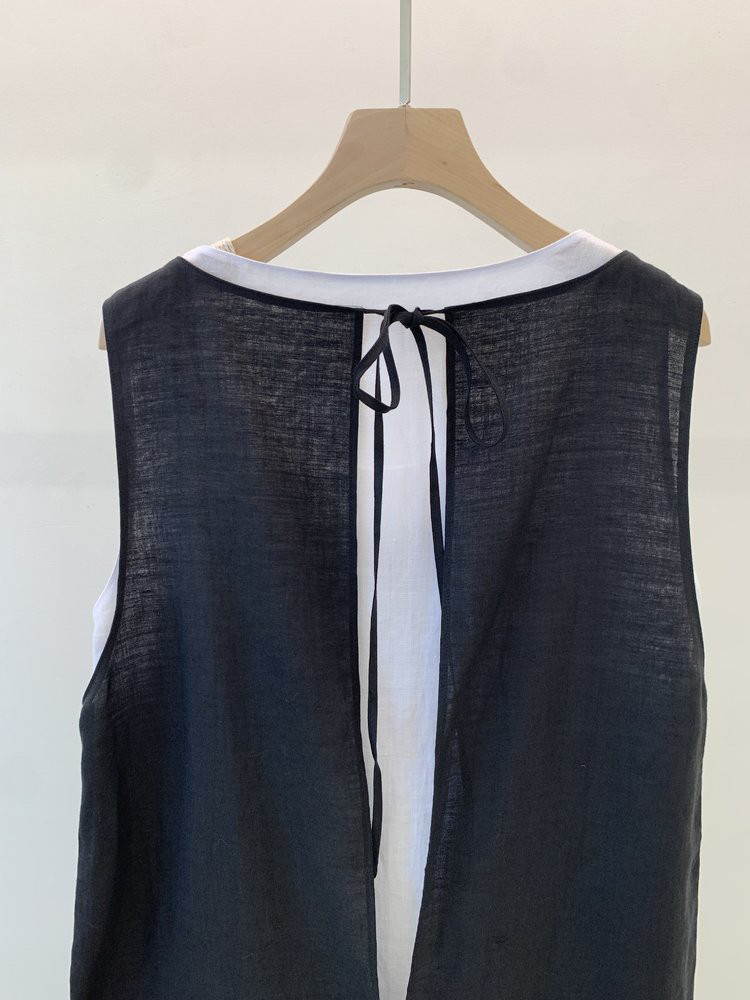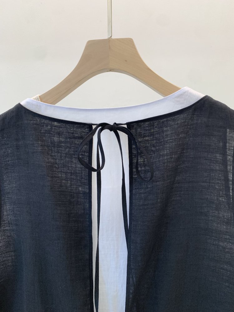 后领深V系结设计,色彩对比层次出挑,外层深V后领露出内搭打底裙,层次清爽盈动,领深心机打薄肩背厚度, 更衬身材苗条纤薄,左右领各一根纤长系带,系结OR敞开都飘逸有型。