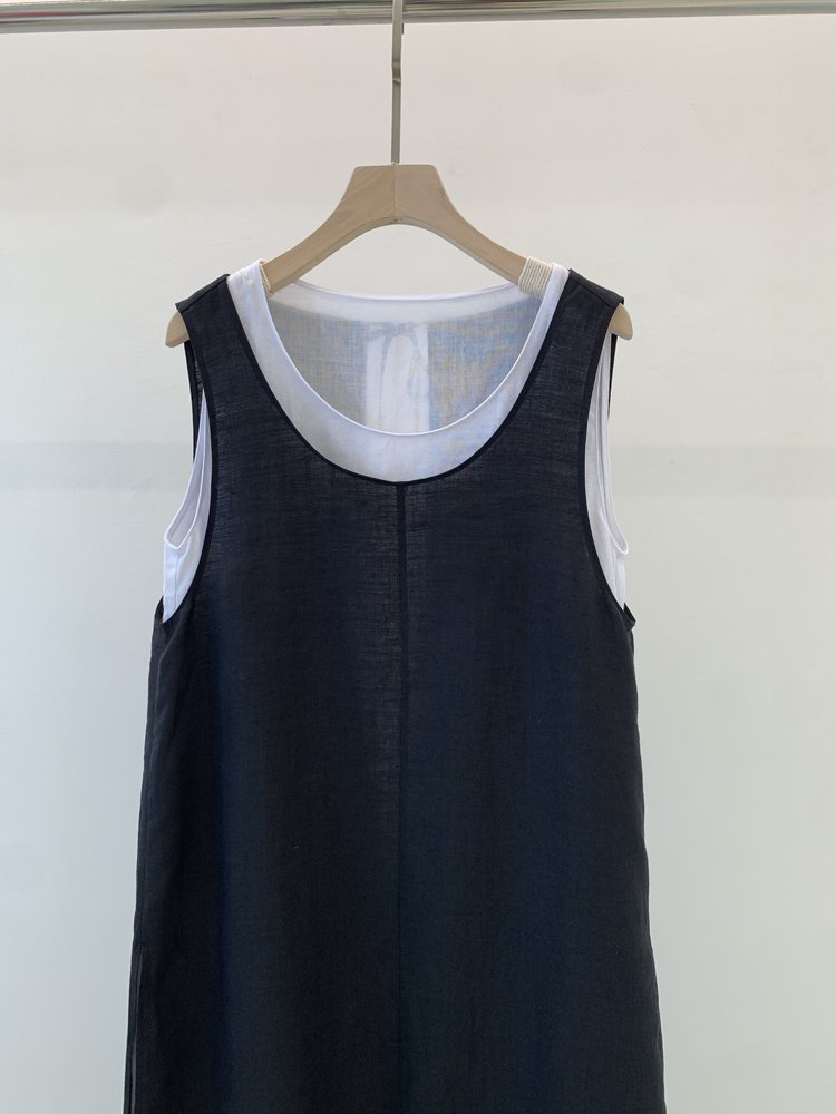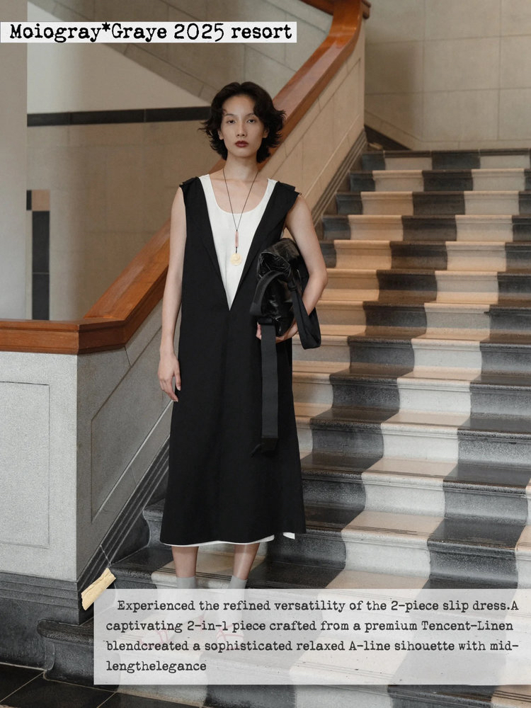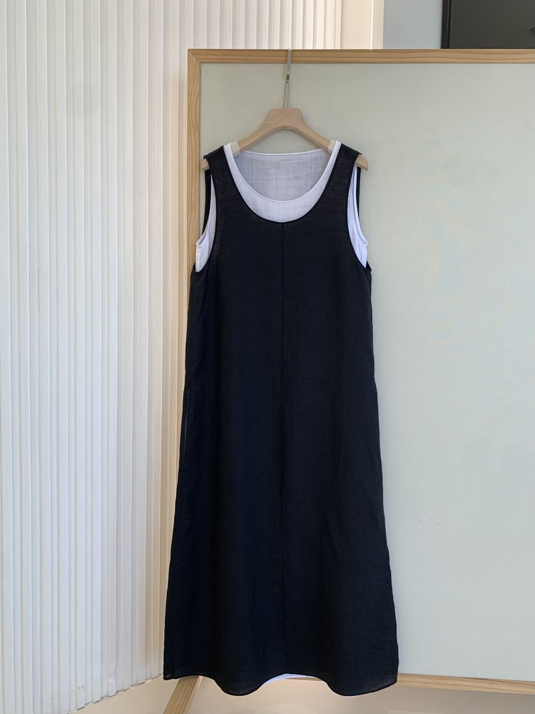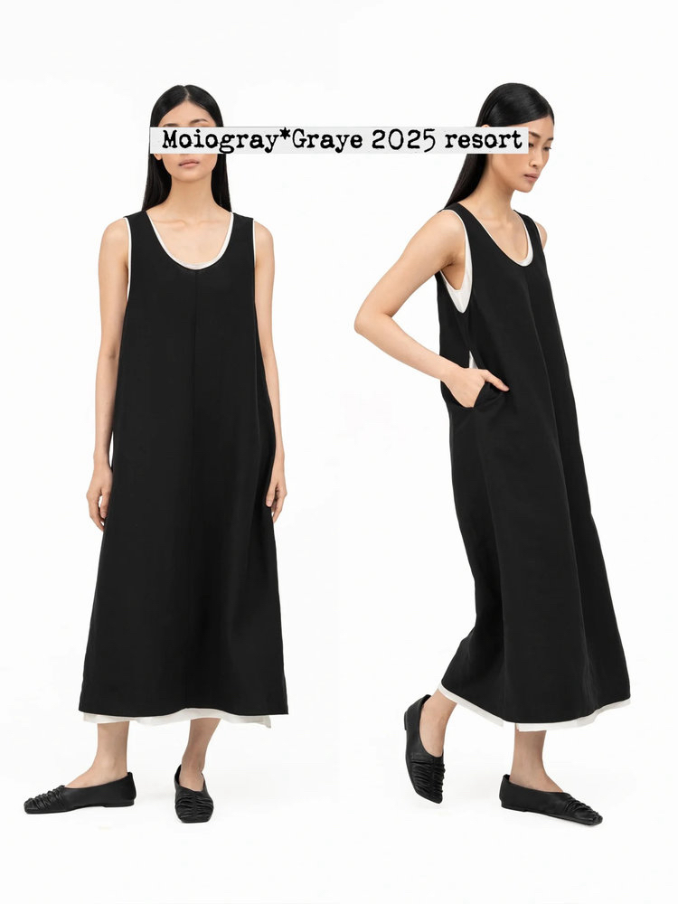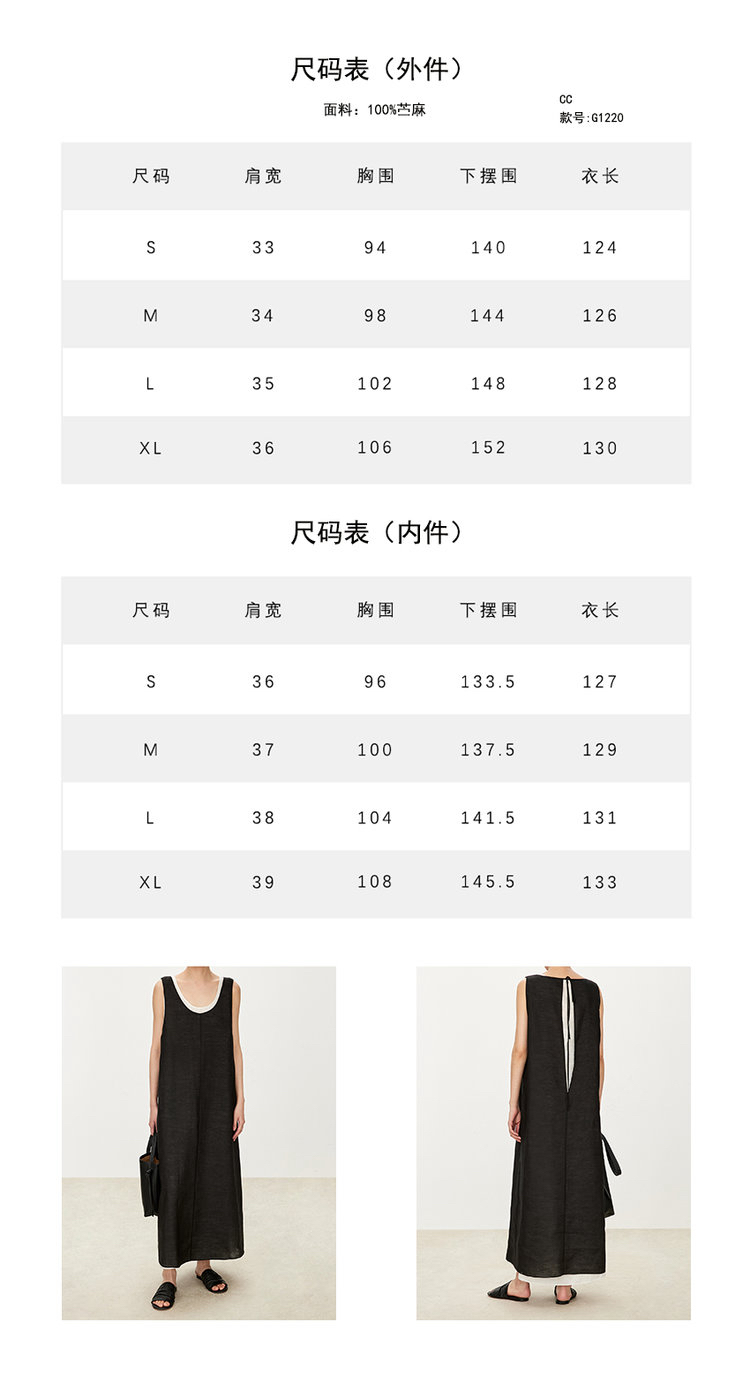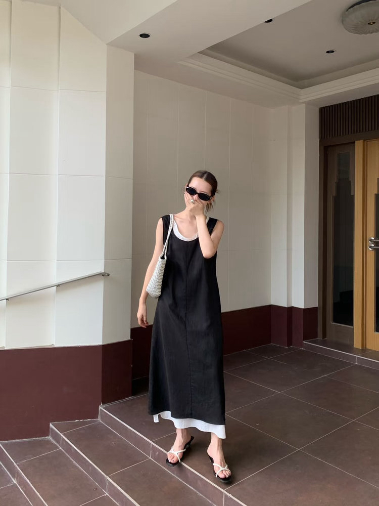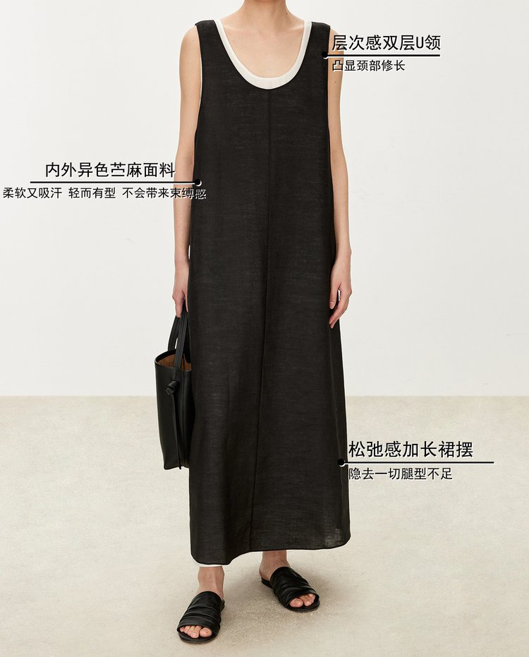 苎麻双层拼色两件套 极简风层次感2件套U领连衣裙 老钱风造型 苎麻面料 垂感十足 细支纱线高密织 叠穿美观不透 拆分穿简约有气质 双层U领设计