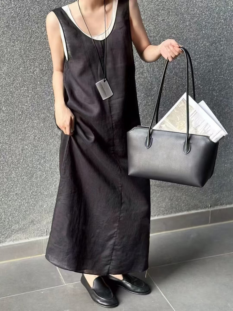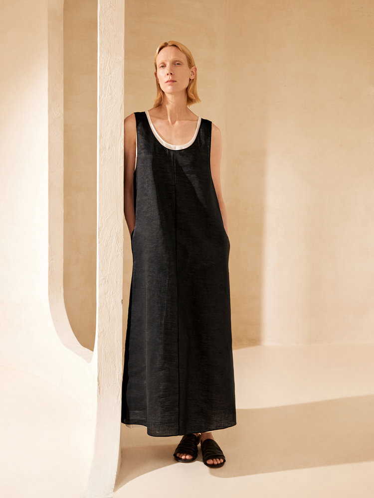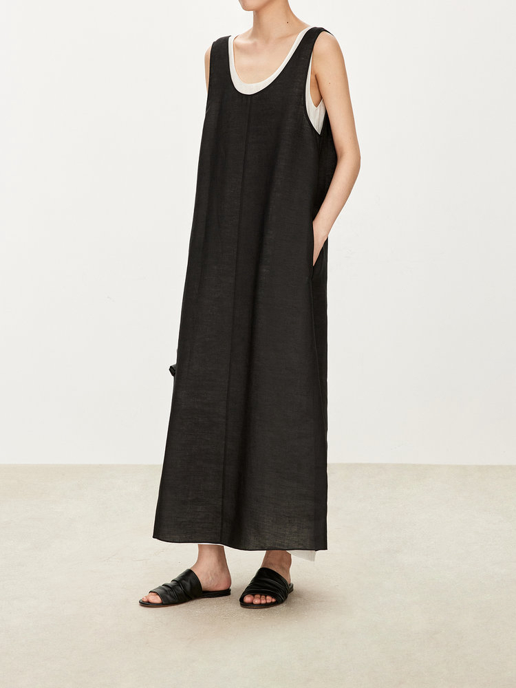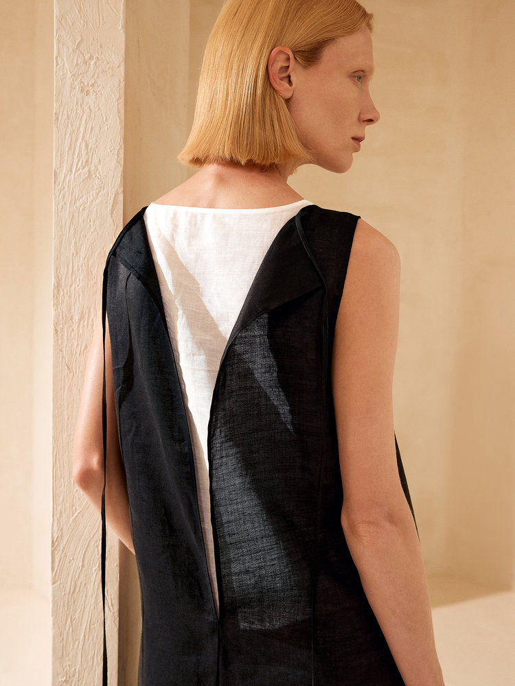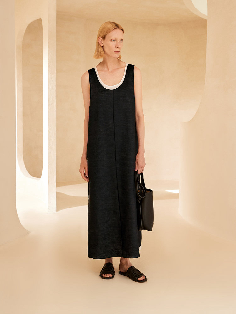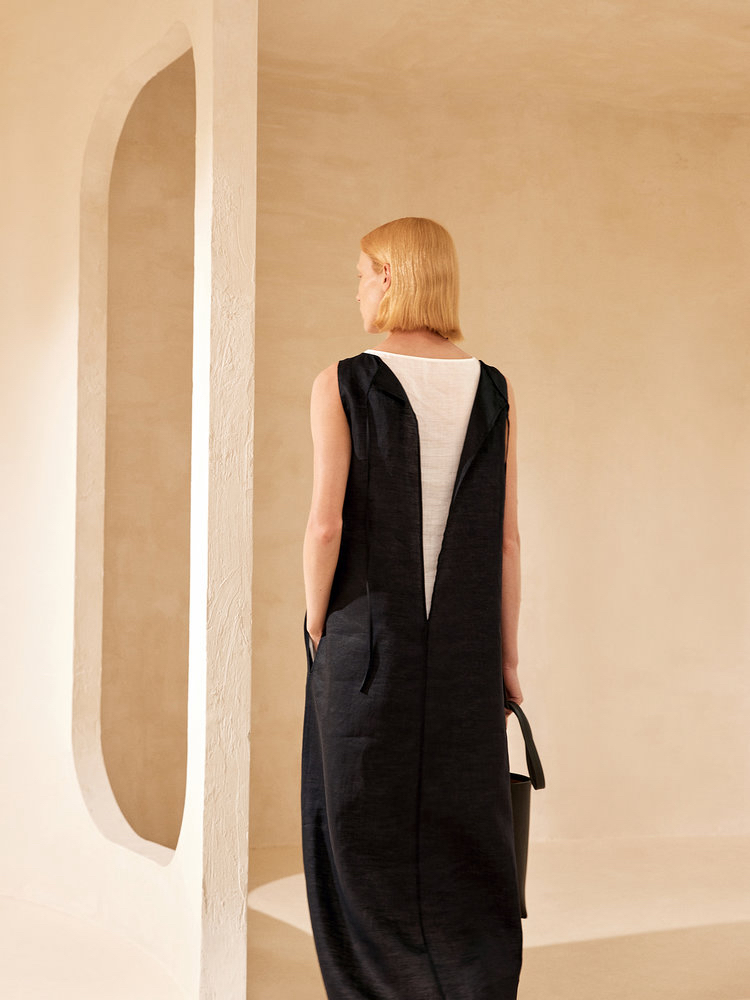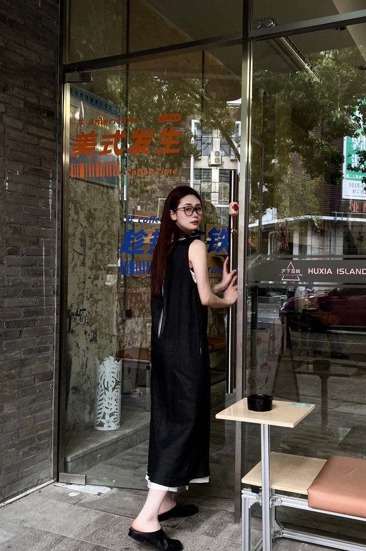 苎麻双层拼色两件套 极简风层次感2件套U领连衣裙 老钱风造型 苎麻面料 垂感十足 细支纱线高密织 叠穿美观不透 拆分穿简约有气质 双层U领设计