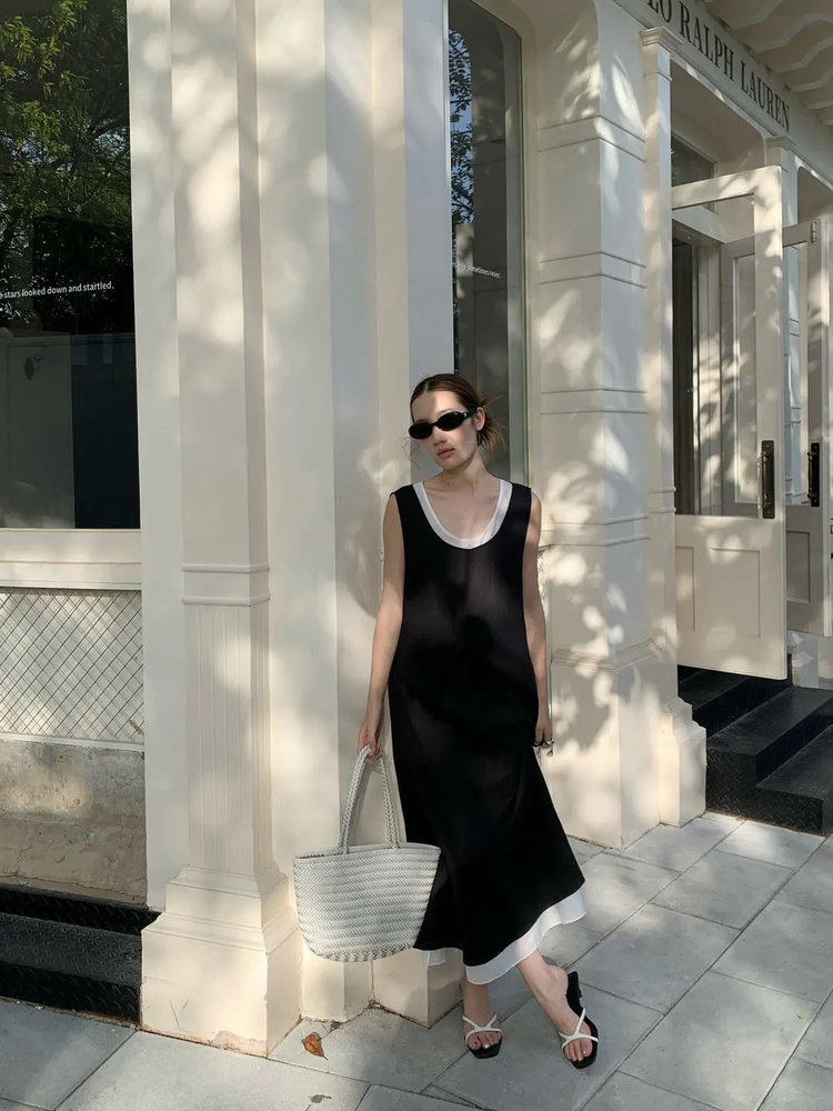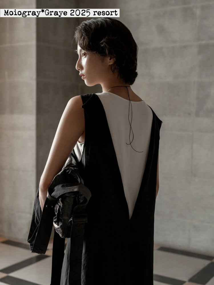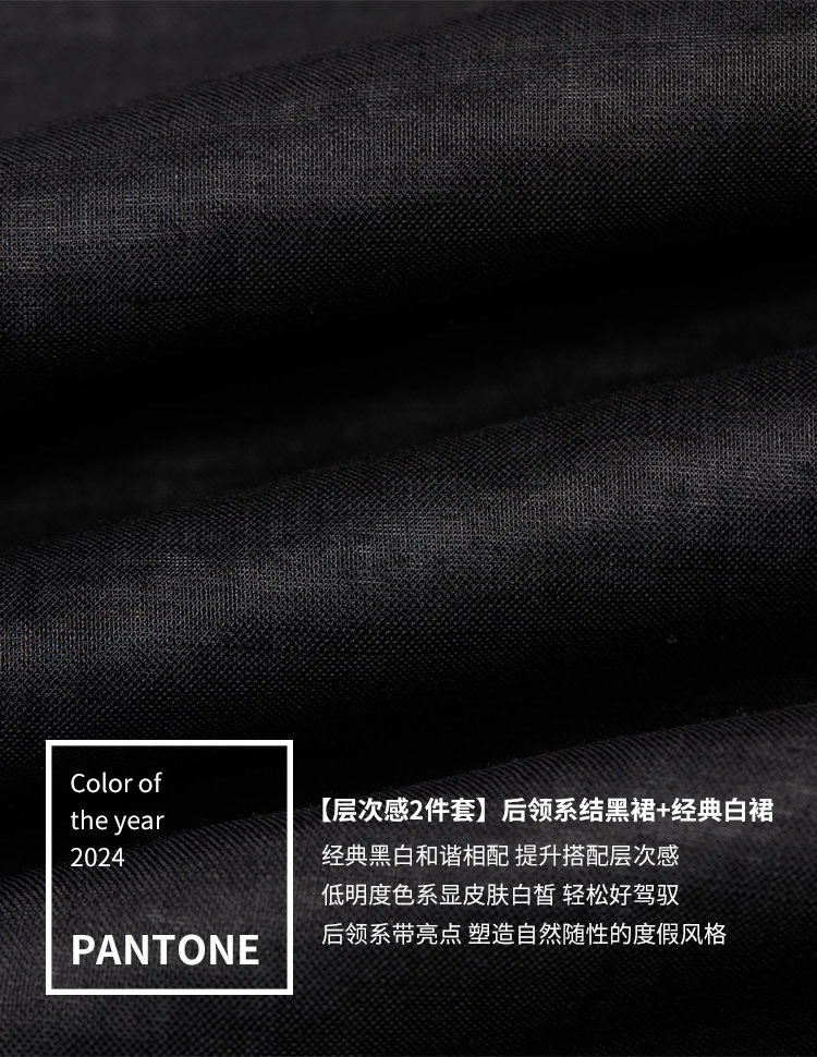 后领系带黑裙+经典白裙,经典黑白和谐相配,提升搭配层次感,低明度色系显皮肤白皙,轻松好驾驭,后领系带亮点,塑造自然随性的度假风格。