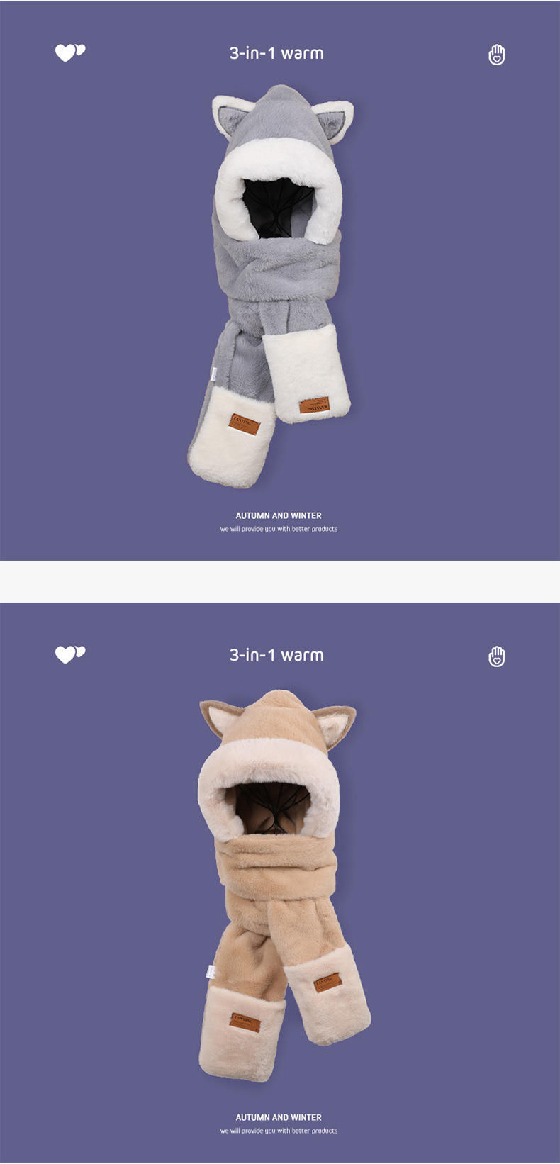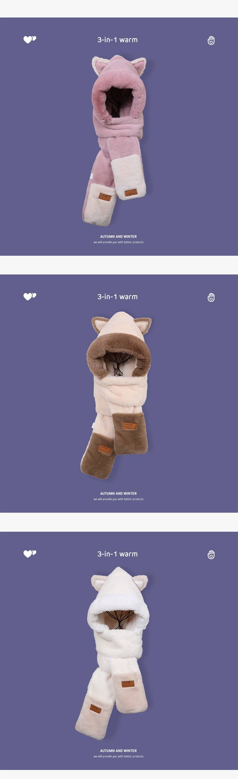 【1件抵3件!帽子手套围巾套装】超好看的小狐狸,可爱又实用!女冬季围巾一体手套围脖连帽三件套可爱小狐狸贴标毛绒套头帽