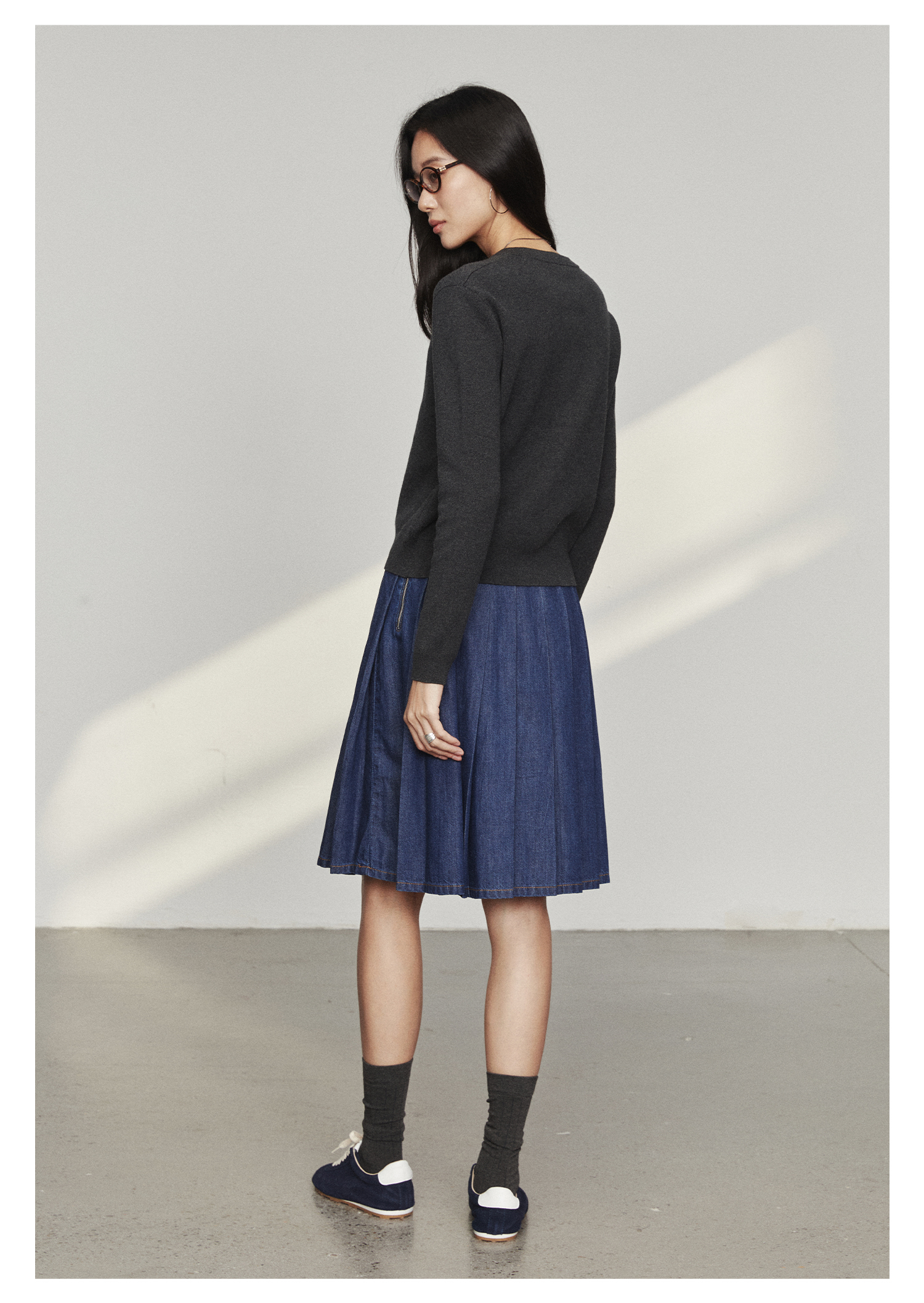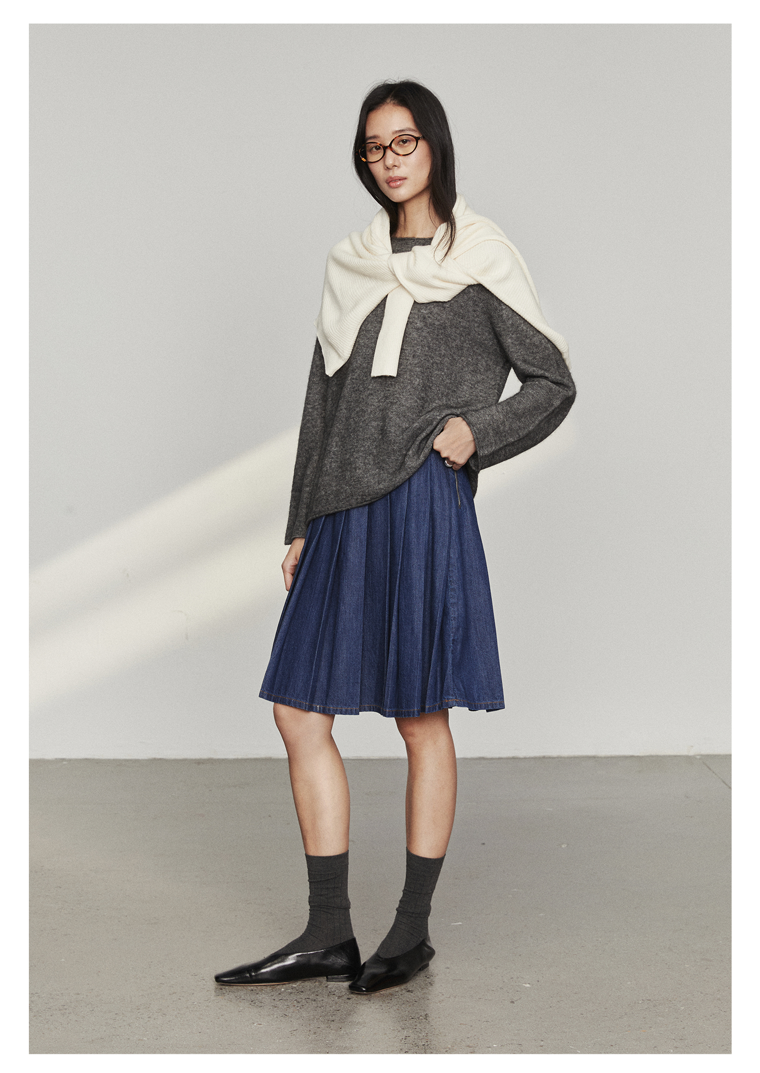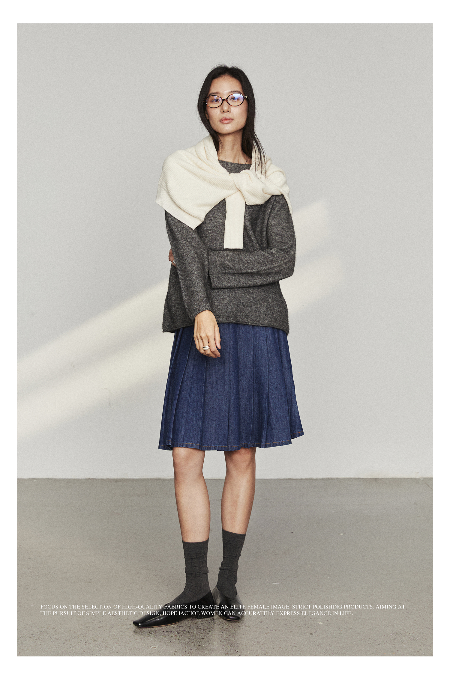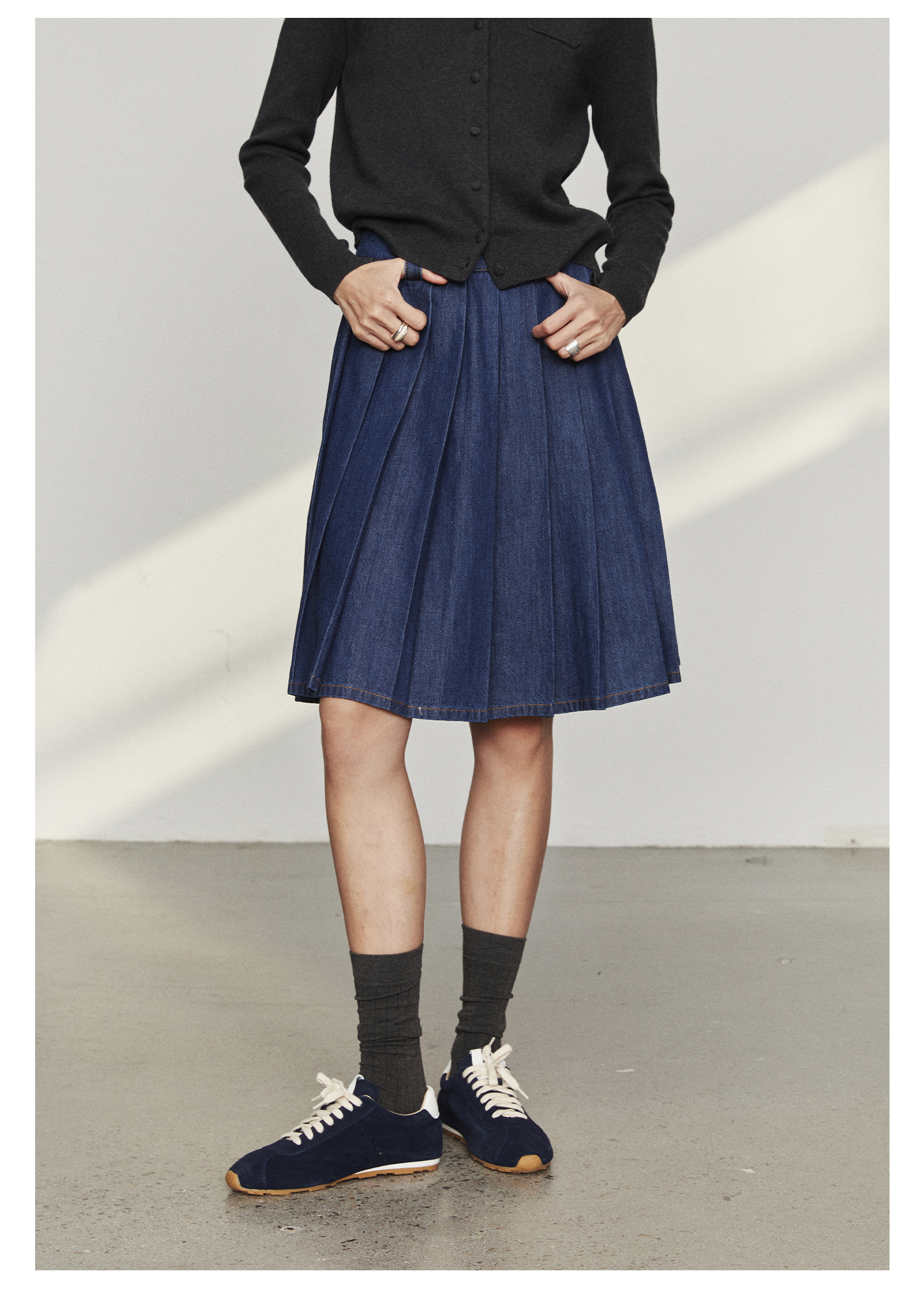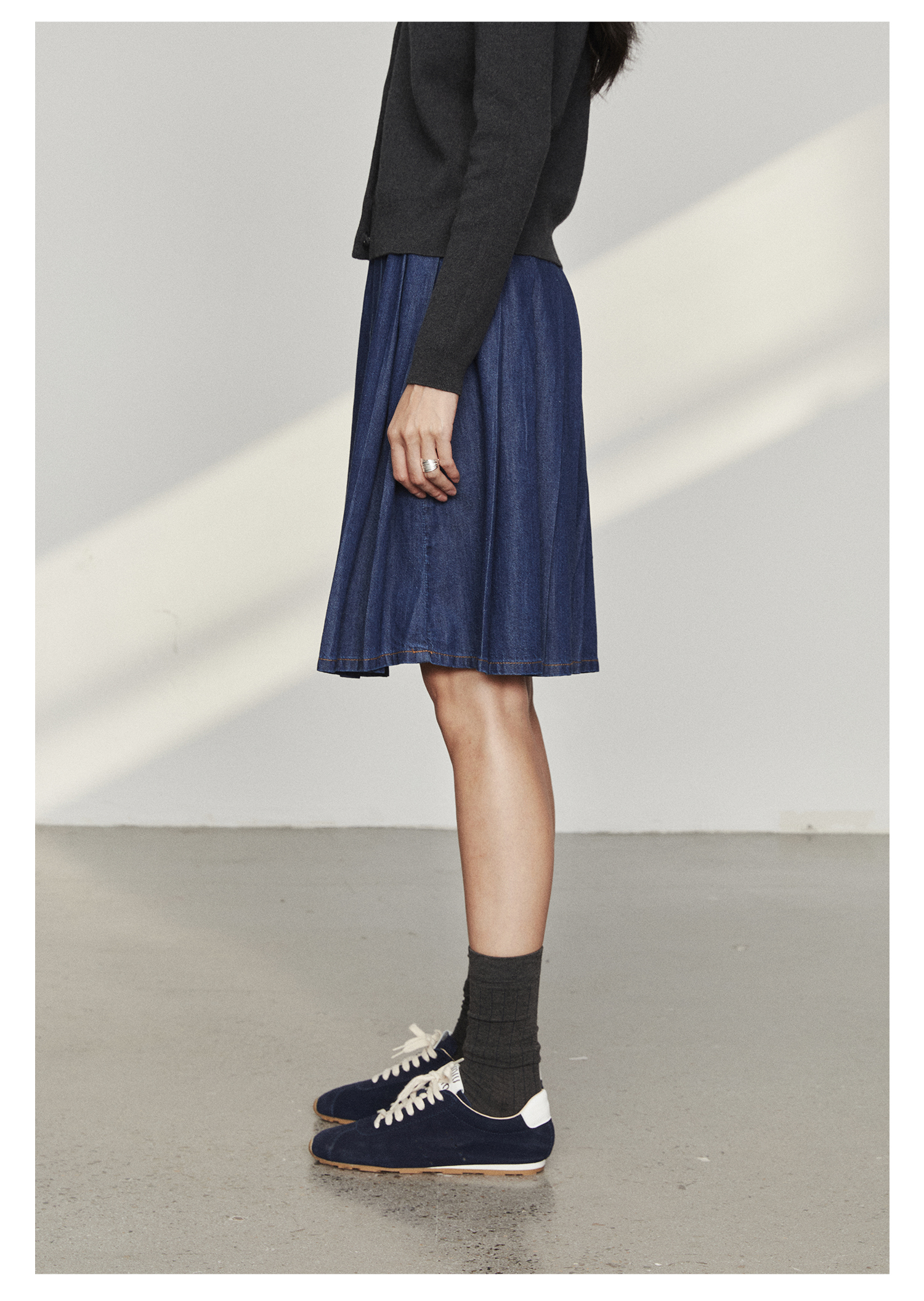 棉仓3561517005-秋季新品mui风百褶半身裙 通勤A字版牛仔半裙