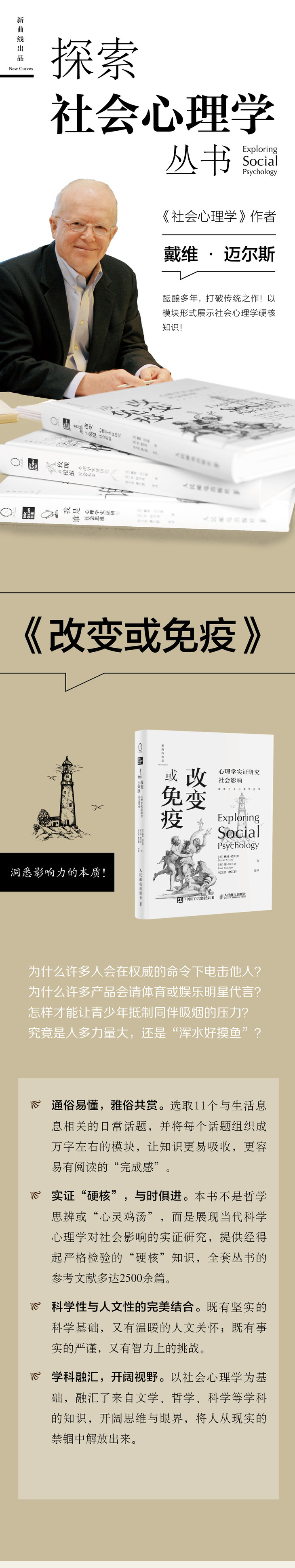 从亚里士多德开始,哲人们不断向我们揭示人是社会性动物。但这种哲学式的指引无助于缓解我们纷繁复杂的现实困惑,在这种情况下,实证取向的社会心理学恰好可以弥补这种不足,为我们刻画出社会性动物的细节。 戴维·迈尔斯和琼·特韦奇的Exploring Social Psychology以“社会思维”“社会影响”和“社会关系”为主题,清晰地为我们展示了近百年来社会心理科学对上述问题的回答。该书的独到之处在于它打破了传统大部头教科书的编写方法,将每个有趣的主题组织成多个10000字左右的模块,以符合人们长时注意的习惯时长,获得阅读的“完成感”。为了更加方便读者携带和阅读,我们在保留模块化编写优点的同时,在新版的改编中将500多页的原书按上述三个主题拆分为三个小本。 本书《改变或免疫:心理学实证研究社会影响》,便来自Exploring Social Psychology的第三编--“社会影响”。迈尔斯和特韦奇在书中详细论述了影响个体认知和行为的因素,例如基因、文化、性别、从众、服从、说服等,同时也给出了抵御不良影响、坚守自身价值观的方法。在*后一个模块中,他们还亲自展开说服,呼吁人们关注气候问题,倡导健康可持续的生活方式。 全篇逻辑严谨、用语清晰、言必有据,与市面上处理这些主题的常见写作手法形成鲜明对比;它或许不能解决您的所有困惑,但不论您是心理学的本科生、研究生、专业从业者还是普通读者,本书都能为您带来惊喜。