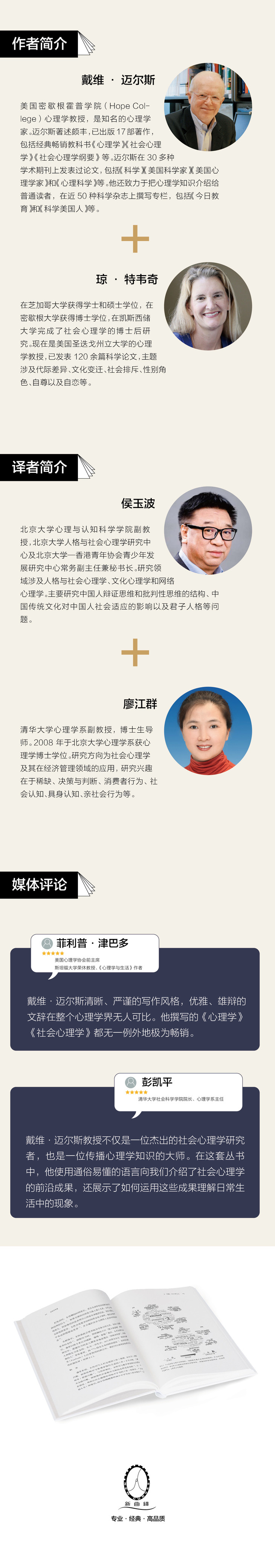 作者简介: 戴维·迈尔斯 1942年生,美国密歇根霍普学院(HopeCollege)心理学教授,是知名的心理学家。迈尔斯著述颇丰,已出版17部著作,包括经典畅销教科书《心理学》《社会心理学》《社会心理学纲要》等。迈尔斯在30多种学术期刊上发表过论文,包括《科学》《美国科学家》《美国心理学家》和《心理科学》等。他还致力于把心理学知识介绍给普通读者,在近50种科学杂志上撰写专栏,包括《现在教育》和《科学美国人》等。由于迈尔斯在研究和写作上的突出贡献,他曾获得众多奖项,包括美国心理学协会的“高尔顿·奥尔波特”奖、美国脑和行为联合会的“杰出科学家”奖、美国人格及社会心理学分会的杰出服务奖以及2011年美国科学院的总统奖,等等。 琼·特韦奇 在芝加哥大学获得学士和硕士学位,在密歇根大学获得博士学位,在凯斯西储大学完成了社会心理学的博士后研究。现在是美国圣迭戈州立大学的心理学教授,已发表120余篇科学论文,主题涉及代际差异、文化变迁、社会排斥、性别角色、自尊以及自恋等。她的研究曾被《时代》《纽约时报》《现在美国》和《华盛顿邮报》等报道过。她在多个网站和杂志上为普通读者撰写文章,其中《大西洋月刊》上的一篇文章获得了全美杂志奖的提名。她经常向大学教职工、军人、夏令营负责人和企业高管讲授代际差异问题。 译者简介: 侯玉波 北京大学心理与认知科学学院副教授,北京大学人格与社会心理学研究中心及北京大学-香港青年协会青少年发展研究中心常务副主任兼秘书长。研究领域涉及人格与社会心理学、文化心理学和网络心理学。主要研究中国人辩证思维和批判性思维的结构、中国传统文化对中国人社会适应的影响以及君子人格等问题。在国内外学术期刊上发表学术论文80多篇。中华人民共和国全国标准化委员会委员,中国心理学会监事,人格分会会长,中国社会心理学会常务理事,北京心理学会常务理事,舆情调研专家组成员。 廖江群 清华大学心理学系副教授,博士生导师。2008年于北京大学心理学系获心理学博士学位。研究方向为社会心理学及其在经济管理领域的应用,研究兴趣在于稀缺、决策与判断、消费者行为、社会认知、具身认知、亲社会行为等。先后兼任北京市社会心理学会理事兼副秘书长、中国社会心理学会应用社会心理学专业委员会委员、中国心理学会员工促进工作委员会委员、科技人力资源专业委员会委员。