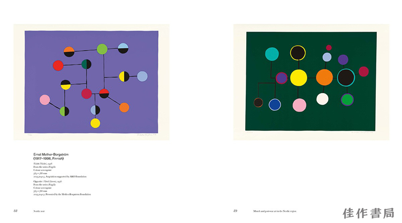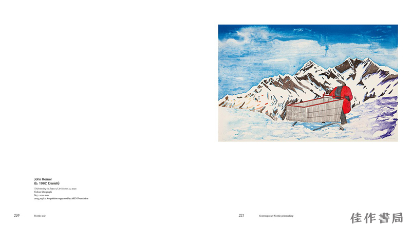 许多作品都突出展现了该地区令人叹为观止的壮丽景色——幽暗的峡湾、茫茫无人居住的山脉和茂密的森林,与北欧视角下描绘的人口稠密、高度发达的城市空间形成了鲜明对比。二战的创伤和冷战的不确定威胁所带来的忧郁情绪和存在主义焦虑日益加剧,而这些情绪常常通过一个孤独、沉思的人物来体现。 20世纪70年代的版画作品表达了对美国外交政策和越南战争的深刻批判,但讽刺的是,它们却通过引人注目的当代图像和大胆的色彩运用,巧妙地运用了美国波普艺术的图像手法。居住在斯堪的纳维亚半岛北部和俄罗斯的土著萨米人探讨了他们在北欧世界中的自身遗产和身份认同等问题。此外,艺术家们还探讨了地域认同,从对祖国的自豪感到对其“维京”历史的隐晦暗示。本书还展出了当代北欧艺术家的作品,他们不断挑战这些国家向外界展现的“完美”斯堪的纳维亚社会世界。
