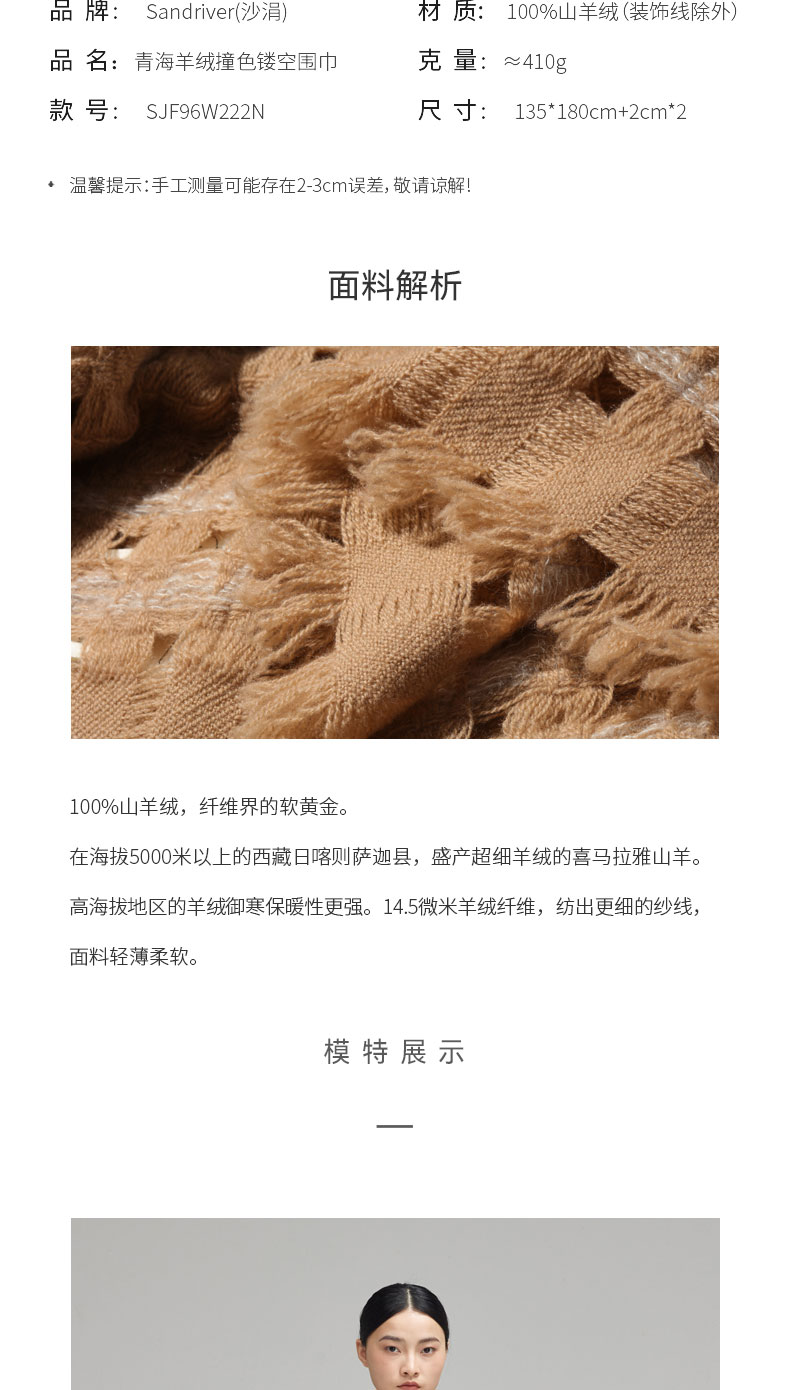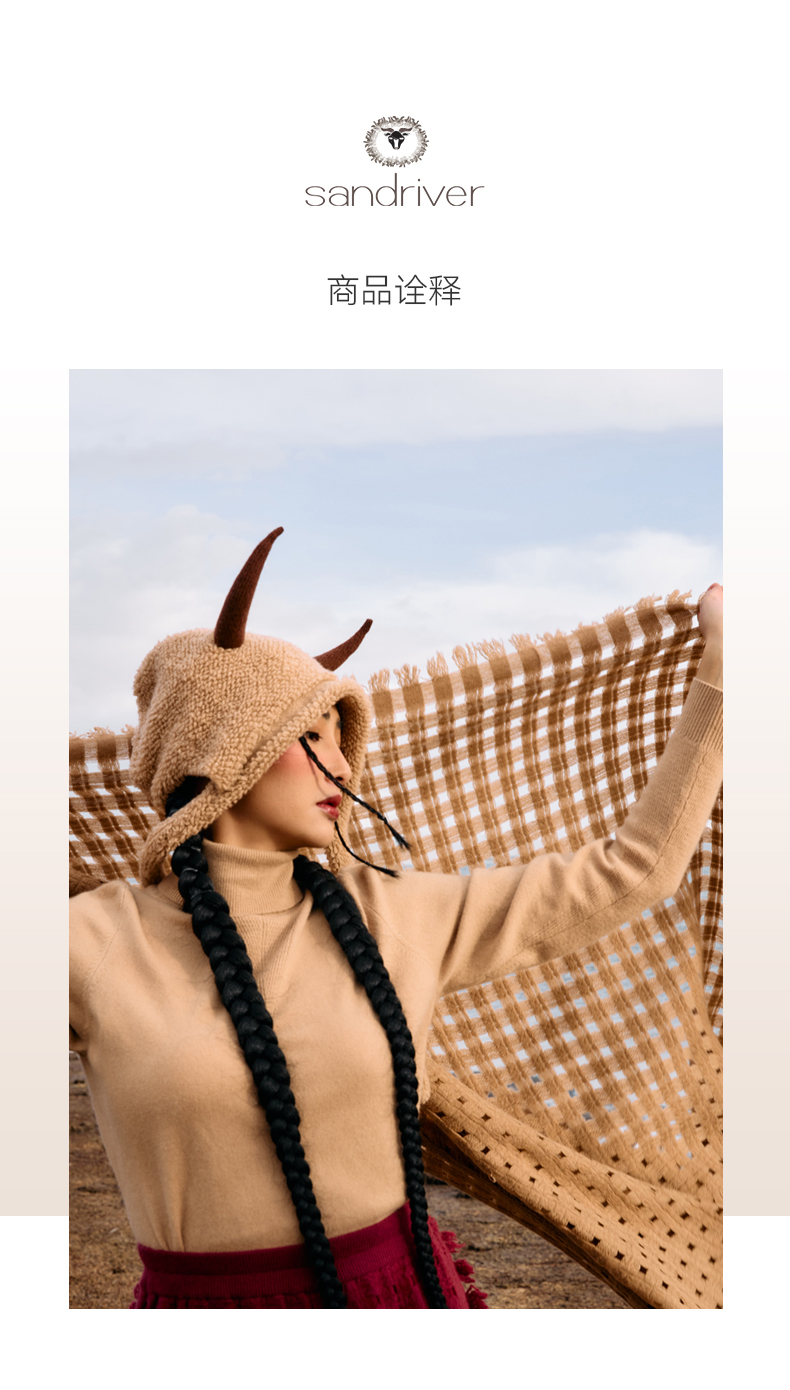 历年在巴黎时装周亮相,享誉世界的艺术羊绒品牌[Sandriver 沙涓]由羊绒布道者郭秀玲女士创立。阿拉善自有牧场纯种羔羊绒,日本国宝设计师小筱顺子,上海自有基地精工细作。承载羊绒情怀,坚持匠人品质。