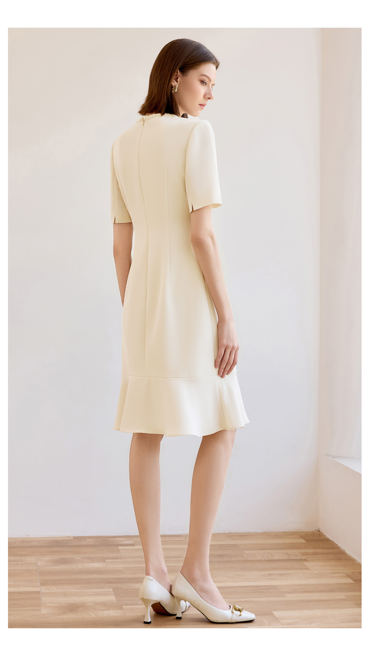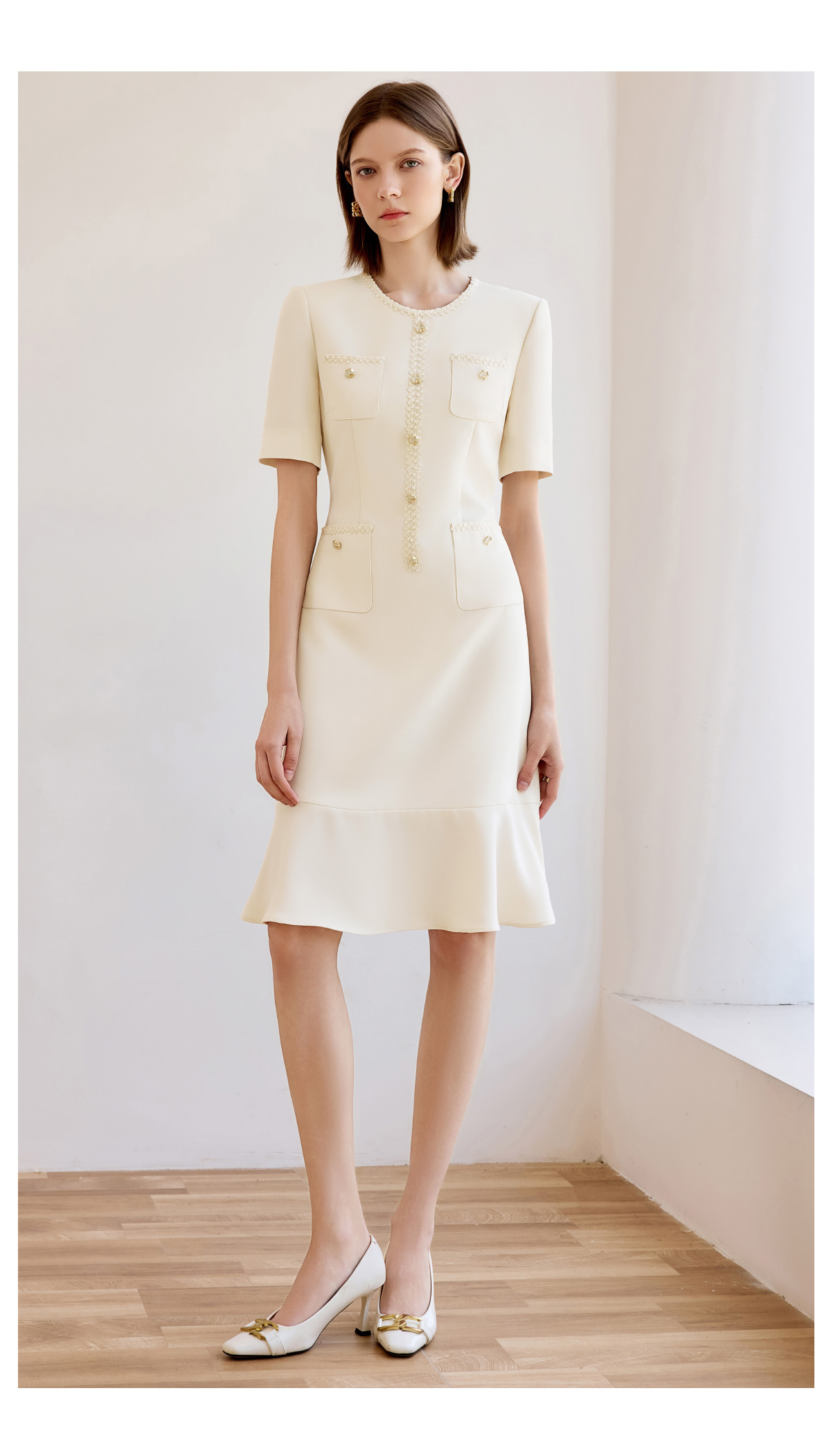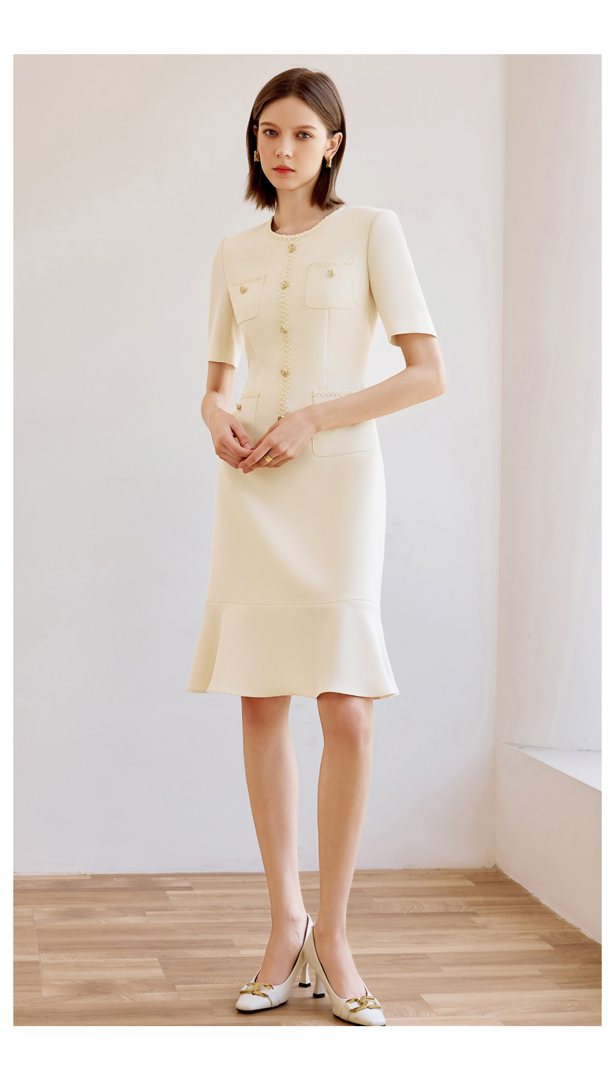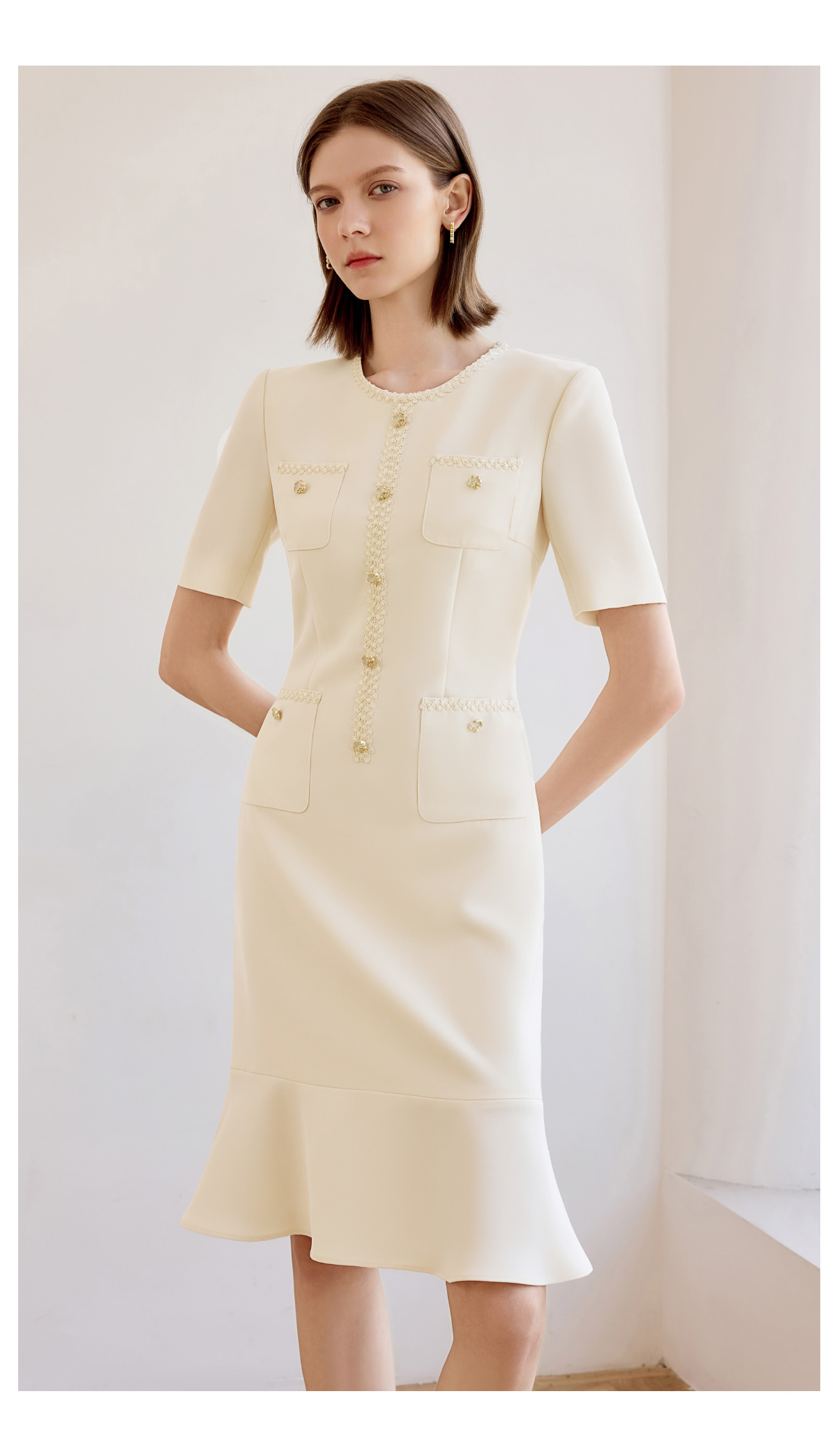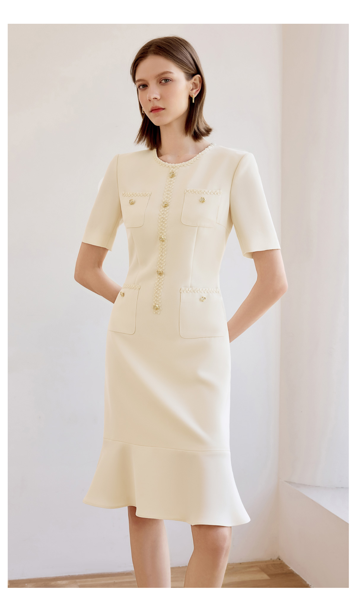 高端米白色小香风圆领连衣裙女夏新款短袖法式鱼尾裙通勤工作服
