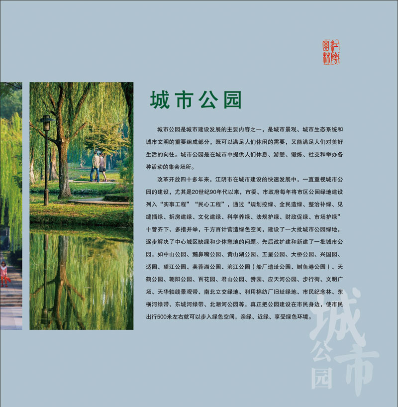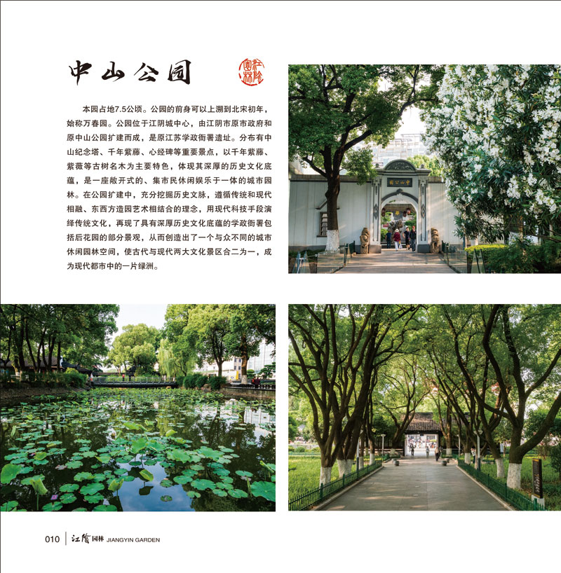 近几年来,江阴各地各有关部门以建设“人文与山水交相辉映、人与自然和谐共生的美丽宜居家园”为目标,以新一轮城乡建设“1310工程”为龙头,努力推进园林事业健康发展。“文化产业”和“城镇绿化”工作两手抓两手硬,通过政府主导,引导多元投入,园林建设得到了长足的发展,在城镇化进程的大背景下保持了较快的增长势头,不但较好地继承了中华传统文化,还在钢筋水泥之间筑起了一道道美丽的风景,对城乡绿化和环境保护、提高人民生活质量起到了积极的促进作用。如今,微波粼粼的湖泊、碧草连天的绿植,以及小桥流水、廊亭连曲的园林建筑,逐步满足了广大市民的精神与实用的双重价值追求,并成为生活节奏越来越快的人们回归自然、放飞心灵的净土。为充分展示江阴园林建设成就,特荟萃全市城乡园林精美图片,编辑出版《江阴园林》摄影画册,分城市公园、郊野公园、镇村公园、生态保护区和名胜古迹群五个篇章,借影像印证历史,以历史注解影像,全景式展现江阴园林风貌,图文并茂地反映江阴园林建设成就,既是一份重要的园林历史资料,也是一项推介、宣传和弘扬江阴文化的创新之举。我们相信,本画册的出版将为丰富江阴人民的精神文化生活、弘扬中华民族的传统文化,进一步倡导全社会“美化环境、造福人类”的良好风尚,为繁荣园林文化、建设生态文明、打造美好江阴发挥积极的作用。
