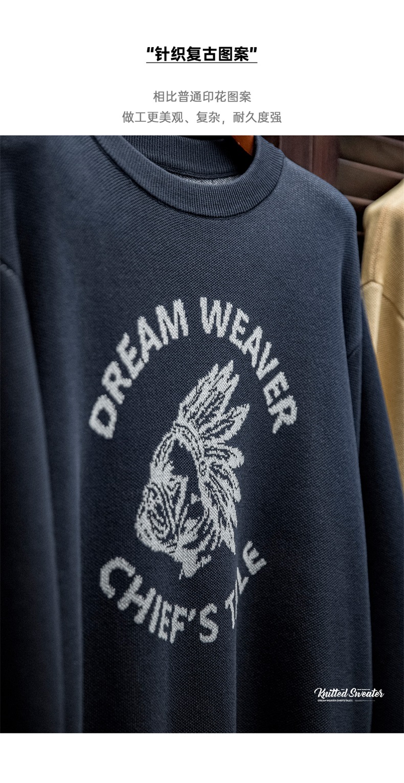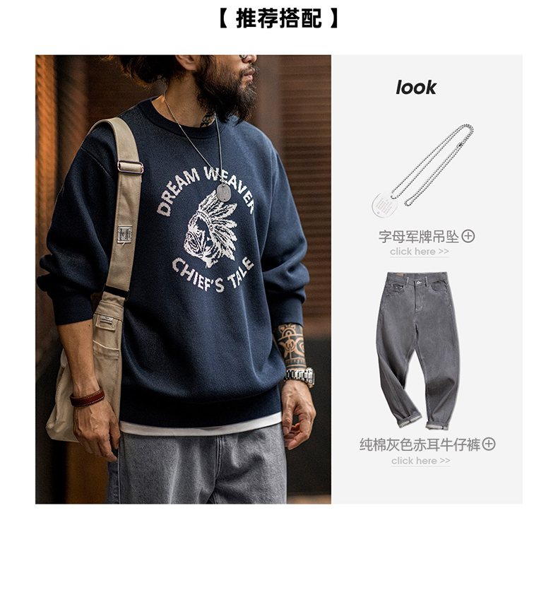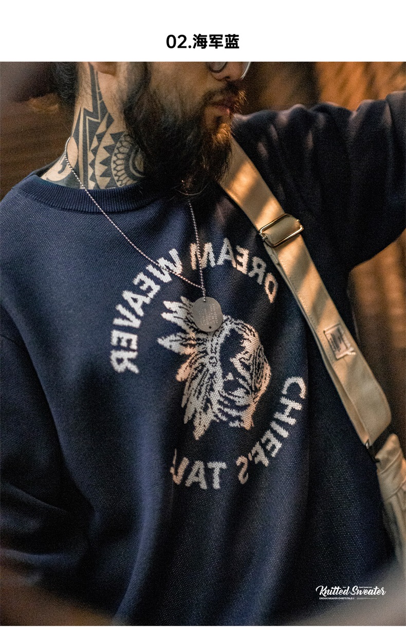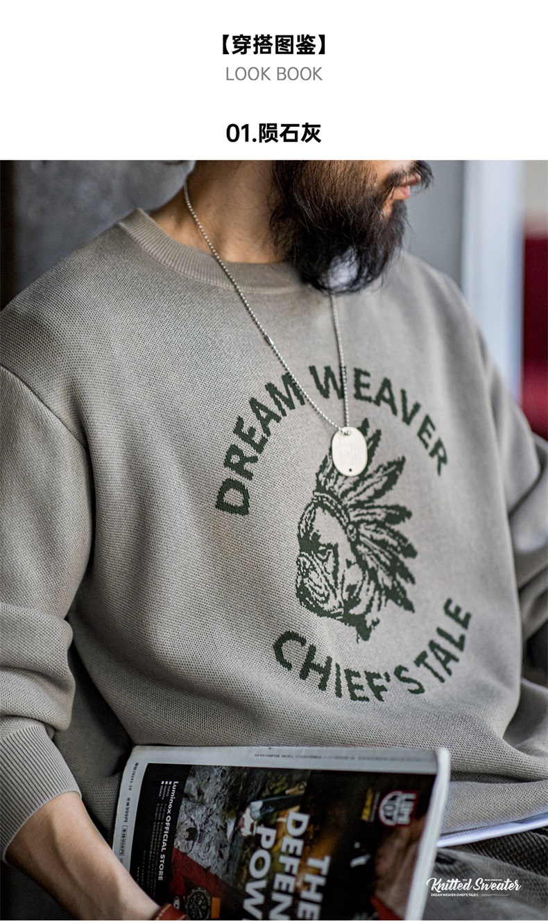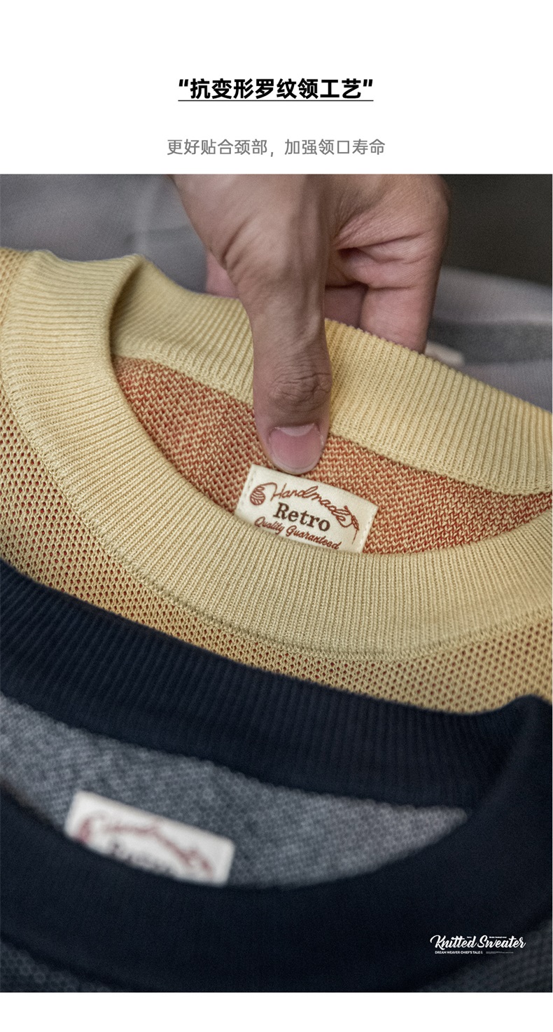 工装优选美式复古仿亚麻字母撞色毛衣阿美咔叽套头圆领针织衫男秋