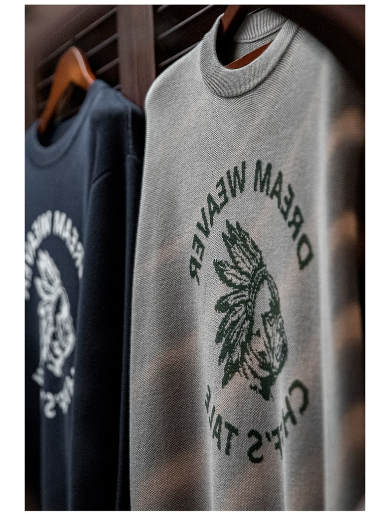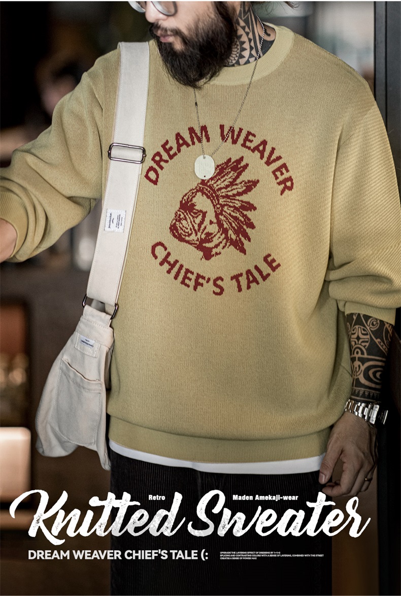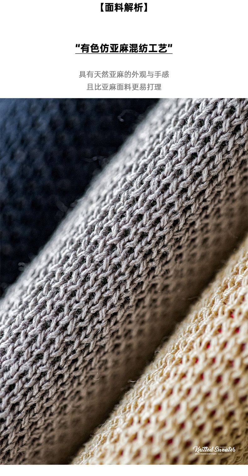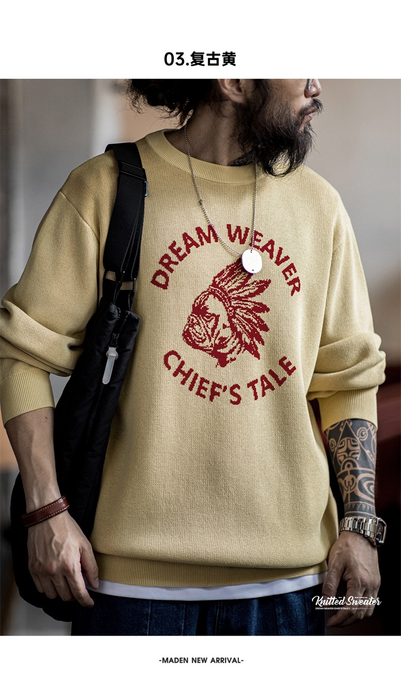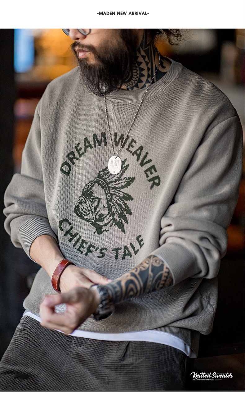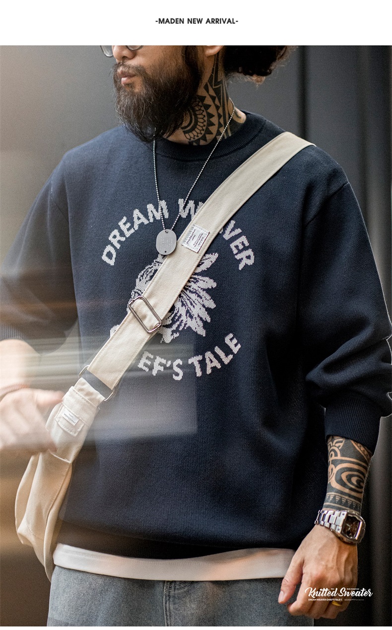 工装优选美式复古仿亚麻字母撞色毛衣阿美咔叽套头圆领针织衫男秋