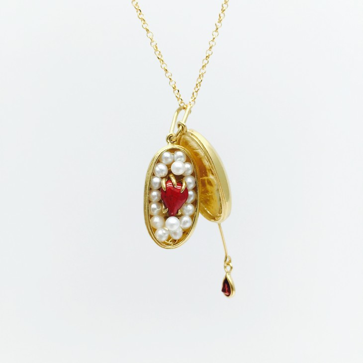 吊坠部分内部镶嵌淡水珍珠和心形珐琅,吊坠外部有一颗石榴石做装饰。