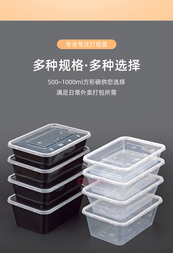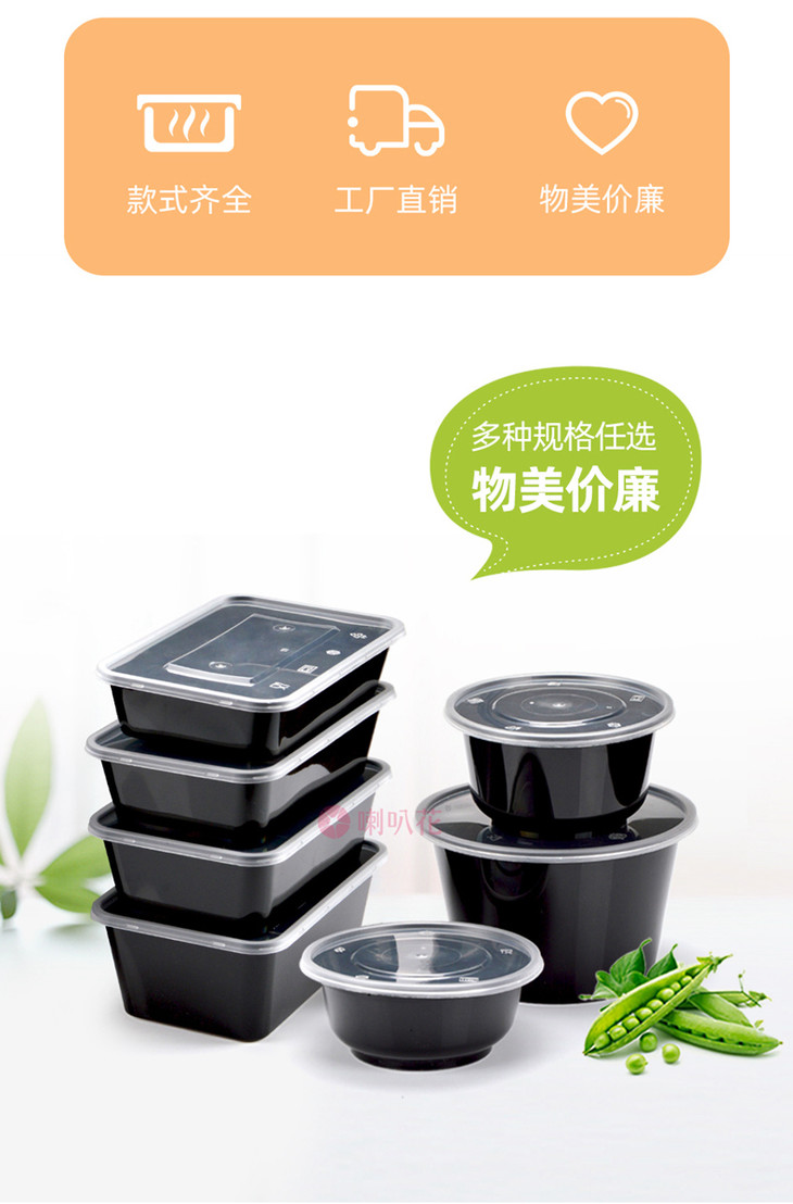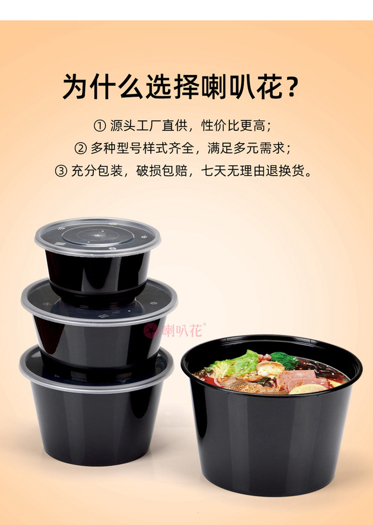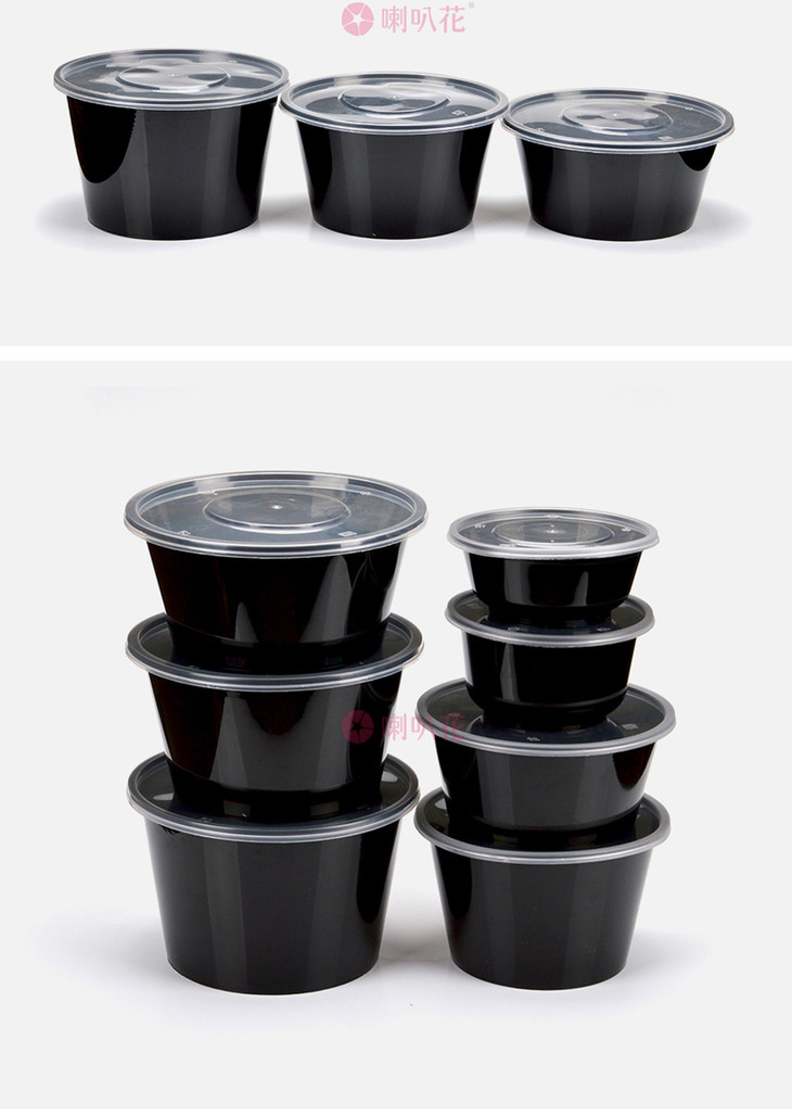 喇叭花打包盒一次性圆形塑料餐盒方盒外卖碗黑色饭盒餐盒汤碗带盖50套