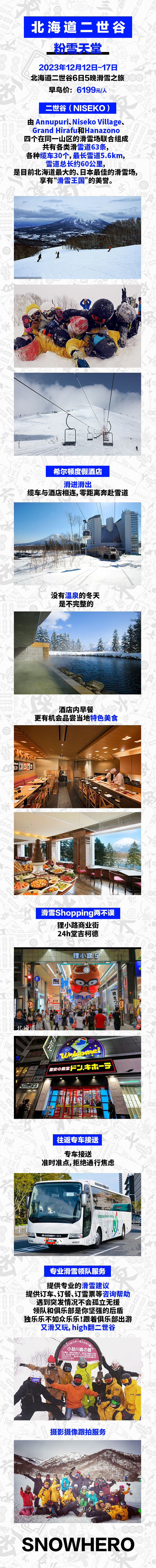二世古(NISEKO)由 Annupuri、Niseko Village、Grand Hirafu和Hanazono四个在同一山区的滑雪场联合组成,共有各类滑雪道63条,各种缆车30个,最长雪道5.6km,雪道总长约60公里,是目前北海道最大的、日本最佳的滑雪场,享有“滑雪王国”的美誉。 领队会带领大家一起滑雪,组织免费滑雪公开课。白天除了滑雪,也可以一起结伴出游,体验当地风情,晚上俱乐部会组织大家一起聚餐、活动。 |