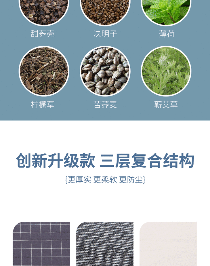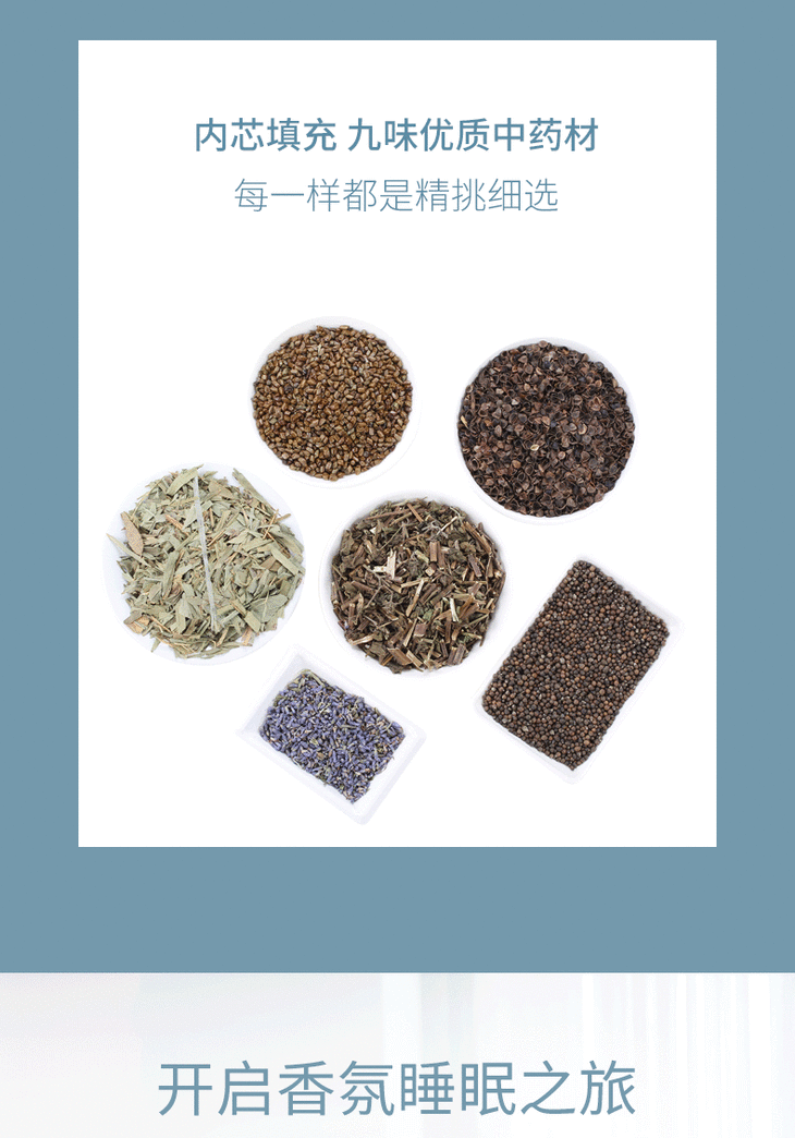 配方:蕲艾,淡竹叶,苦荞壳,甜荞壳,决明子,黄荆子,薄荷,柠檬草,薰衣草